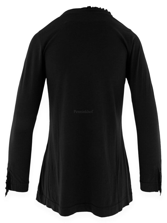 A shirt from Rundholz black label in the colour black. Along the edge of the round neckline is partly a finely pleated trim. At the end of the half-length sleeves is a slit, one edge of which is finely pleated. This shirt can be washed at 30 degrees.