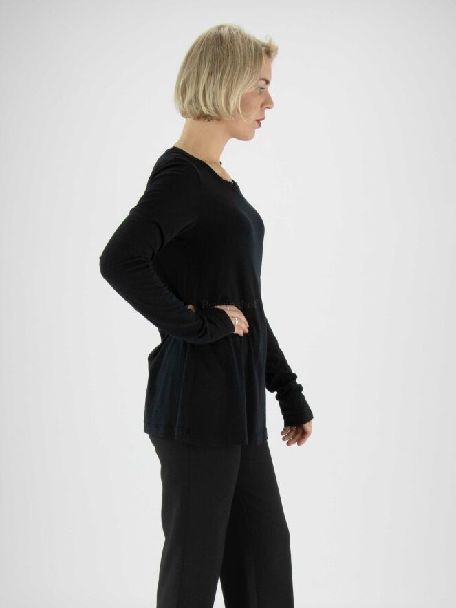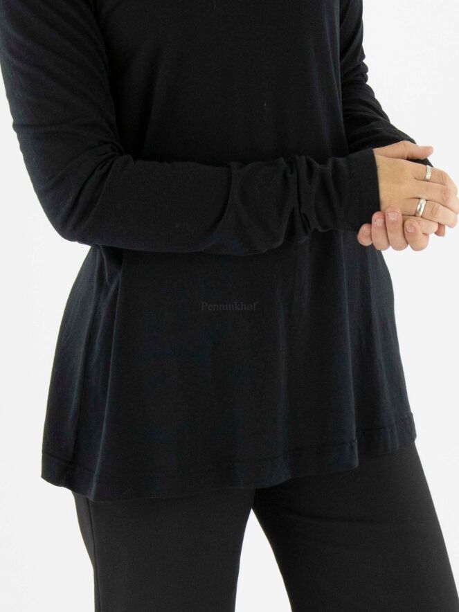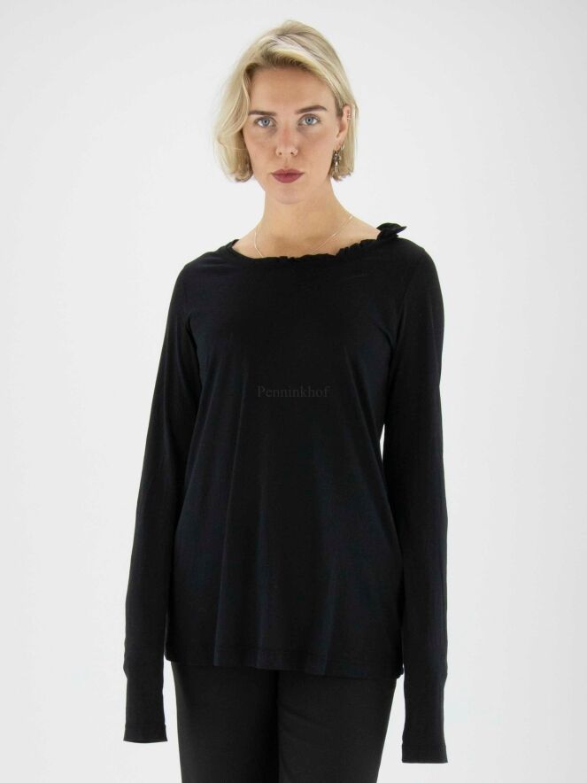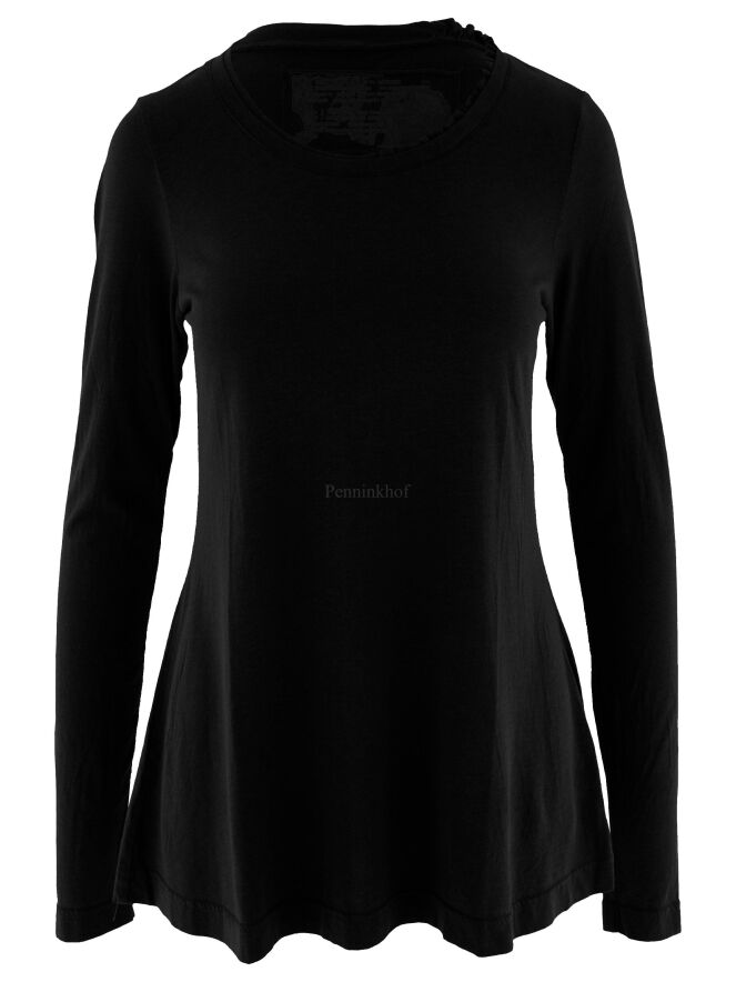 A shirt from Rundholz black label in the colour black. Along the edge of the round neck is partly a fine pleated trim. The shirt has long sleeves and may be washed at 30 degrees.