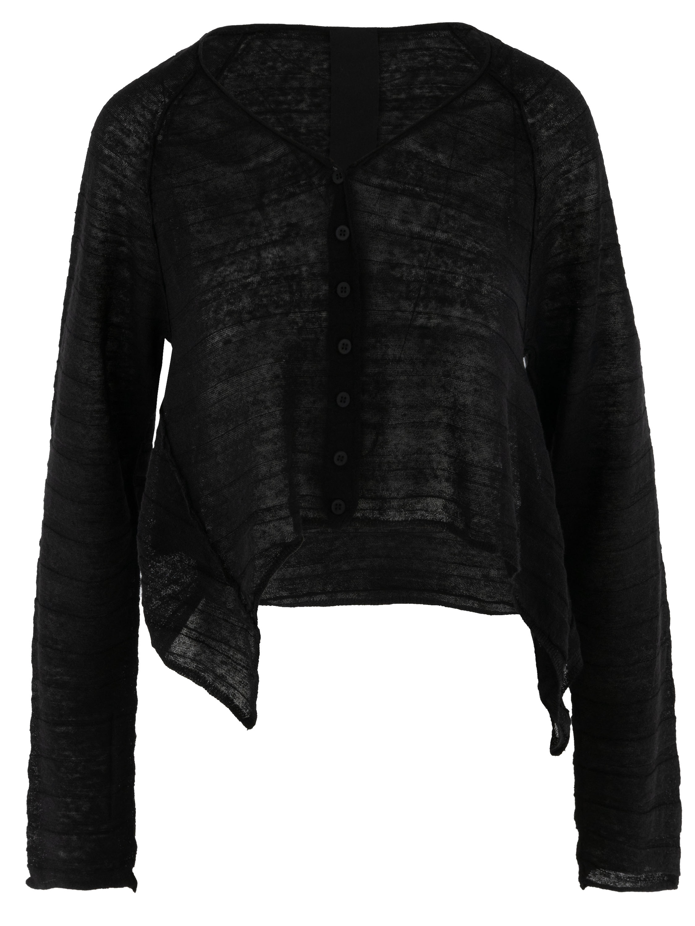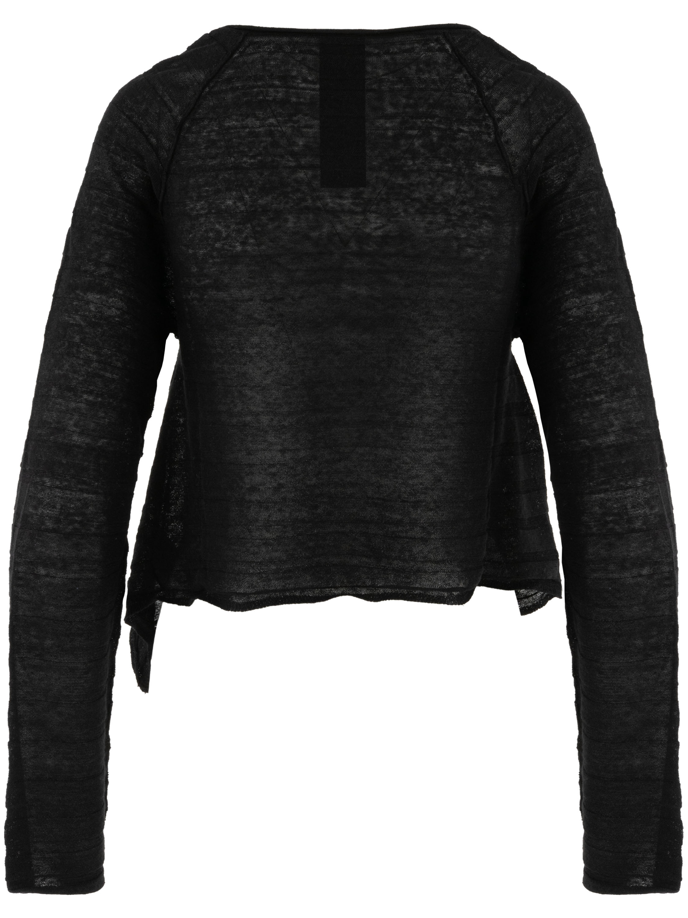 Short, lightweight semi-sheer cardigan by Rundholz Black Label in black. The fabric features a subtle striped texture, creating a refined and contemporary look. The sides are slightly longer than the center at the hem, adding a playful and modern silhouette. This cardigan can be washed at 30 degrees.