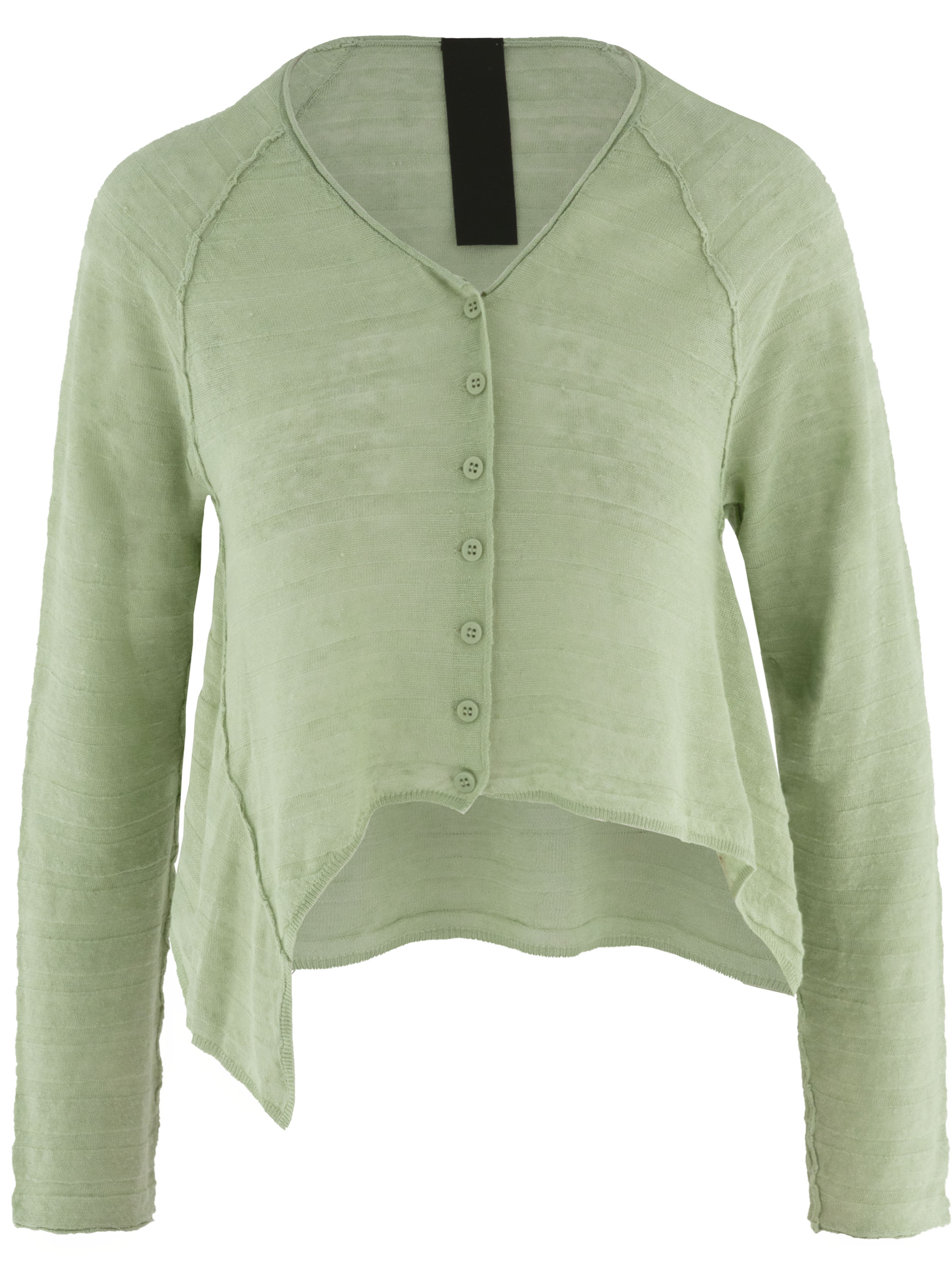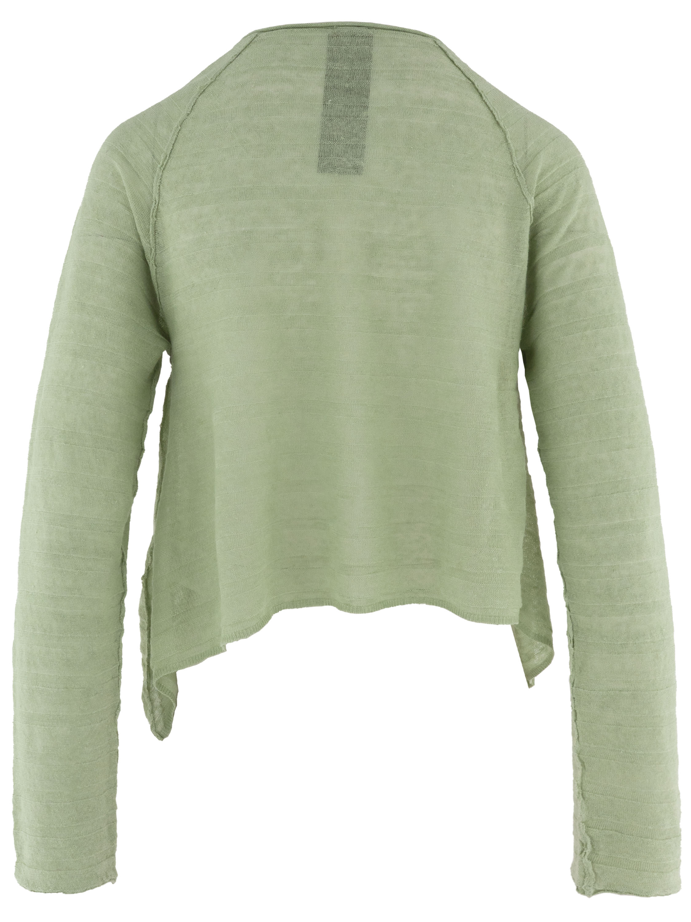 Short, lightweight semi-sheer cardigan by Rundholz Black Label in a fresh pistachio green shade. The fabric features a subtle striped texture, adding a refined and contemporary character. The sides are slightly longer than the center at the hem, creating a playful and modern silhouette. This exclusive designer cardigan can be washed at 30 degrees.
