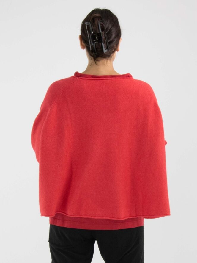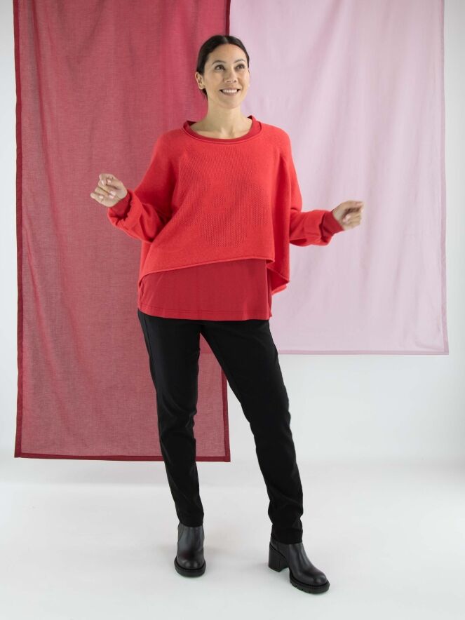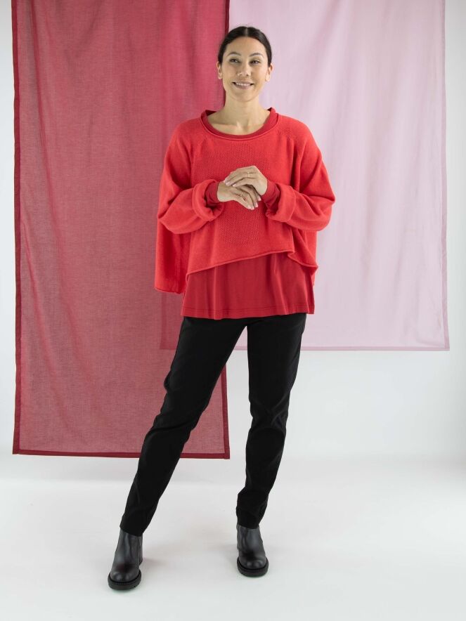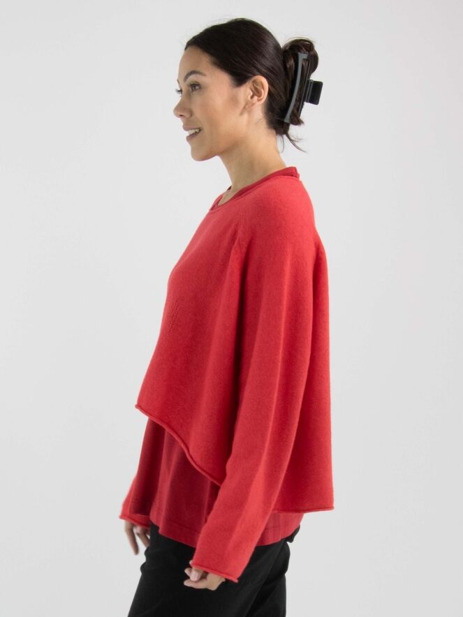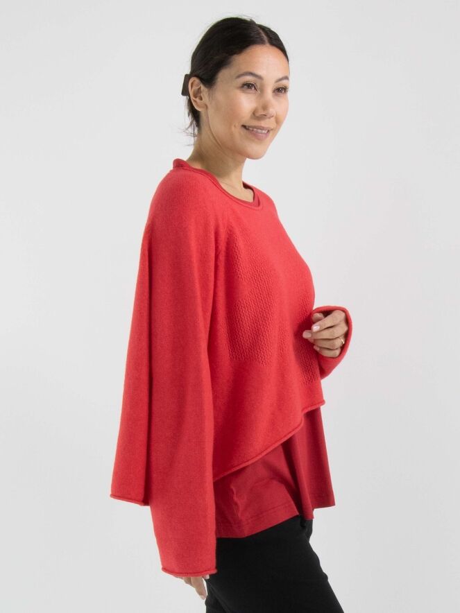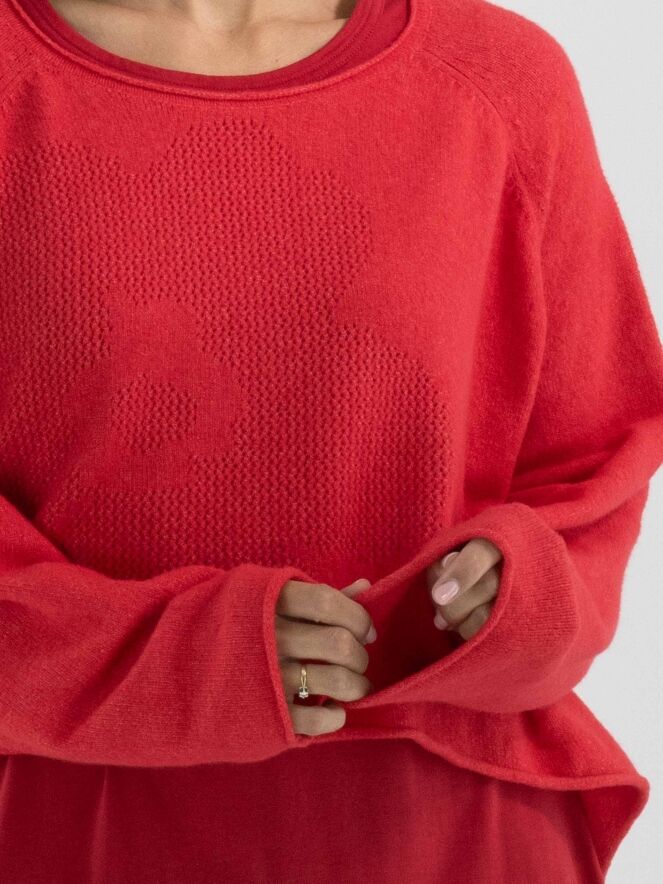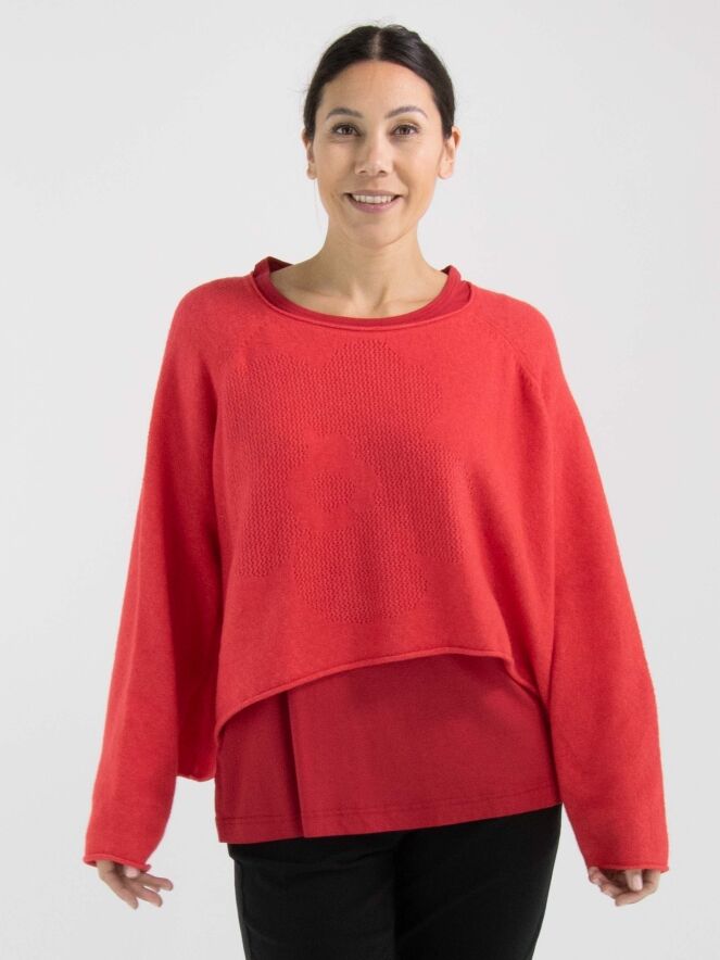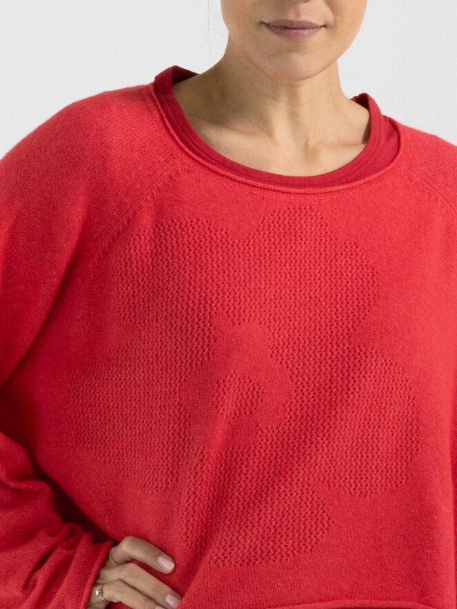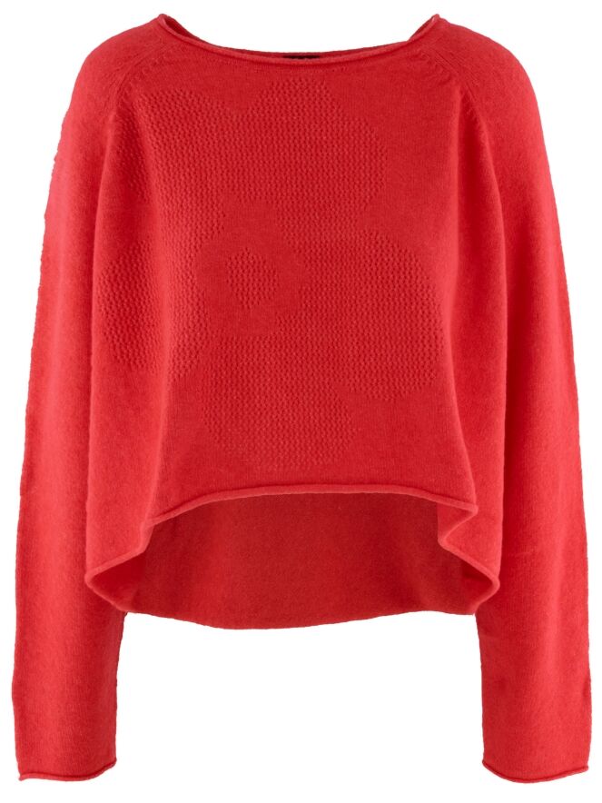 A short, wide pullover by Rundholz Black Label in a mottled red hue. The front features a graphic pattern created with various knitting stitches. The edges of the round neckline and hem are ruffled. This pullover must be hand-washed.