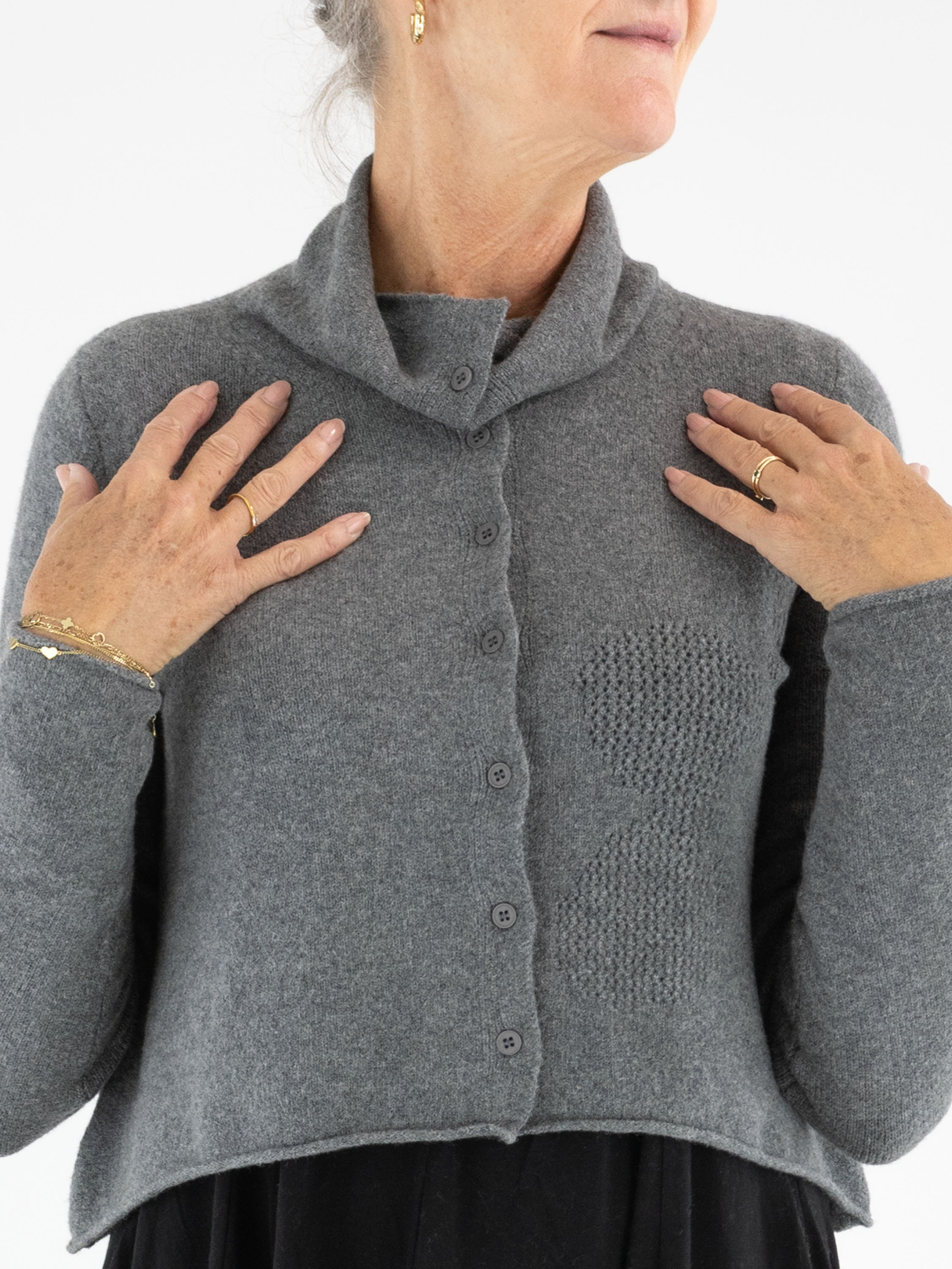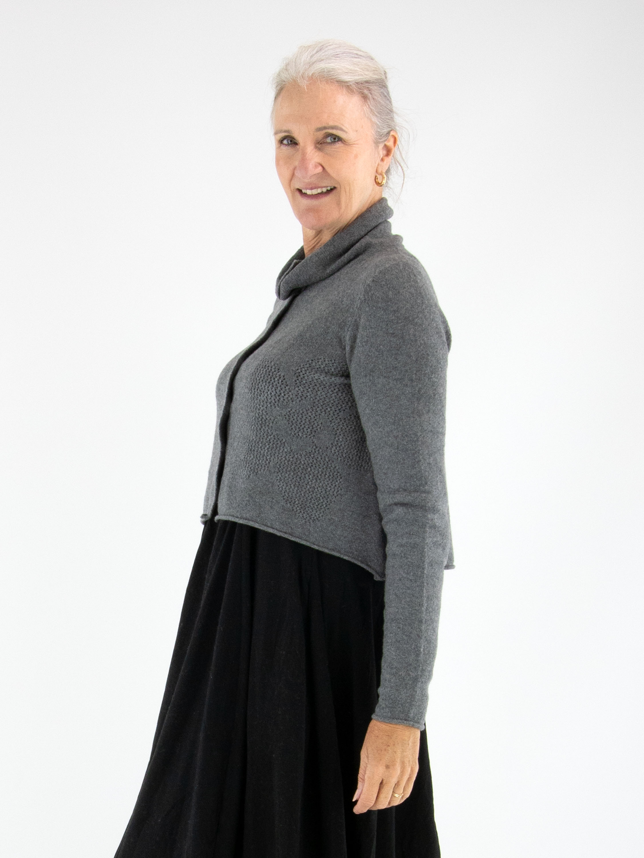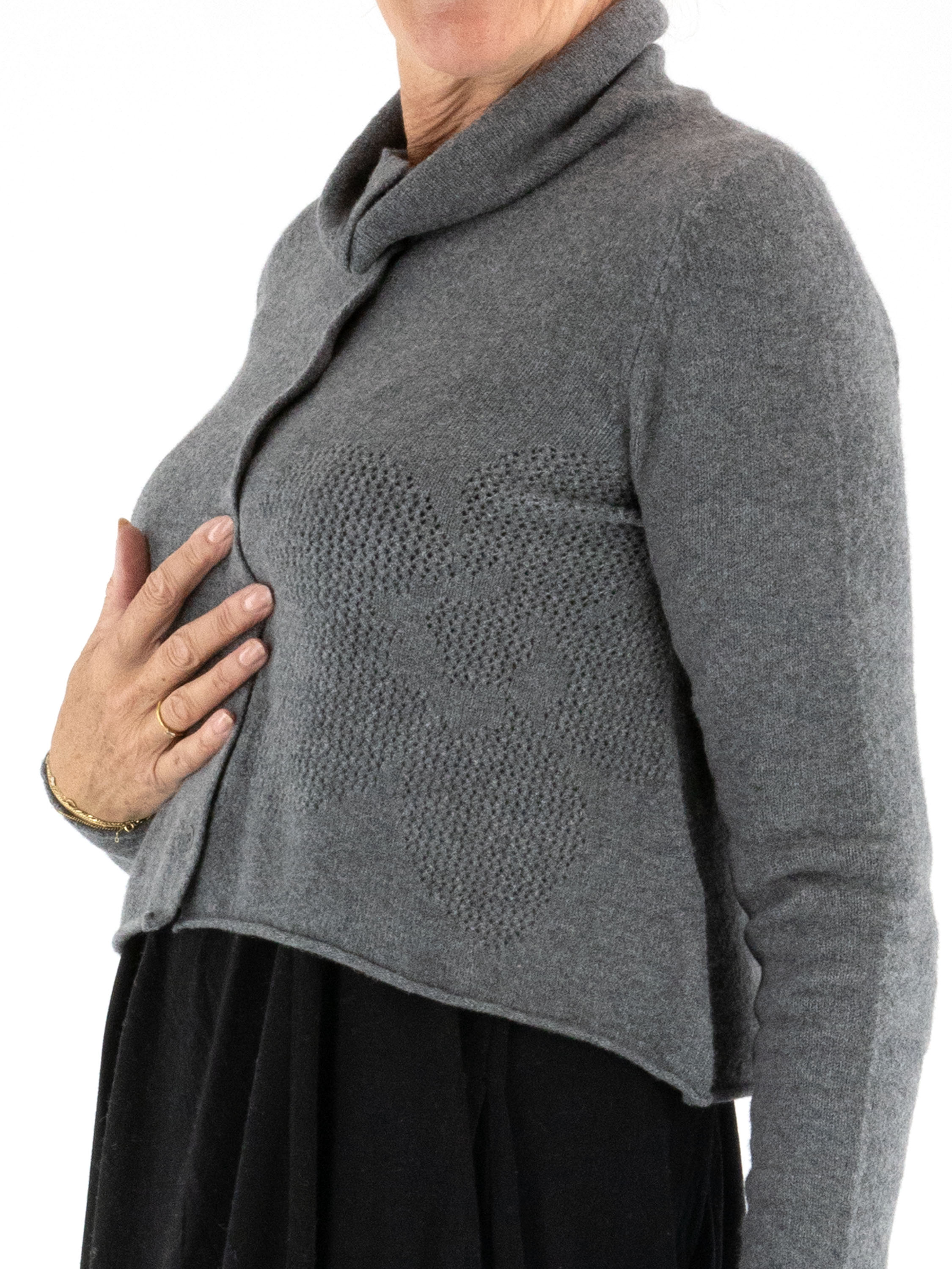 A short, loose cardigan by Rundholz Black Label in grey. It features a draped turtleneck and a ruffled hemline. The left front panel is adorned with a floral pattern created in a contrasting knit. This cardigan must be hand-washed.