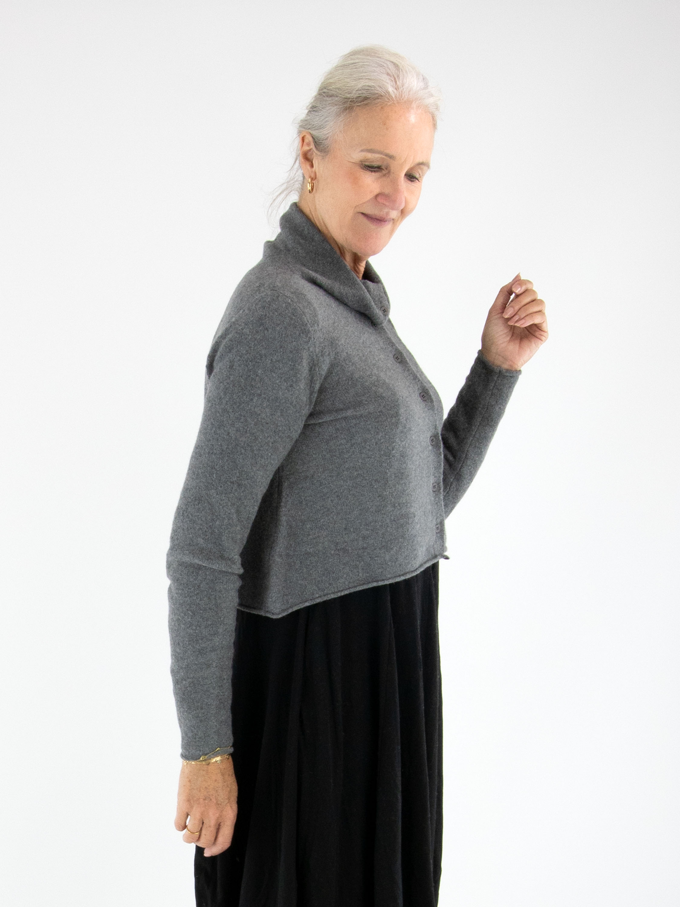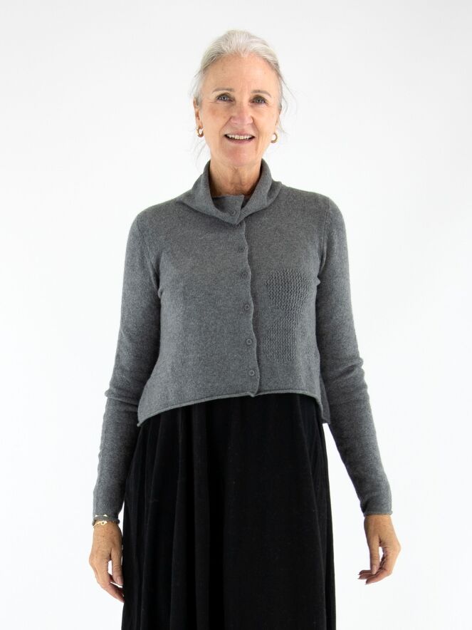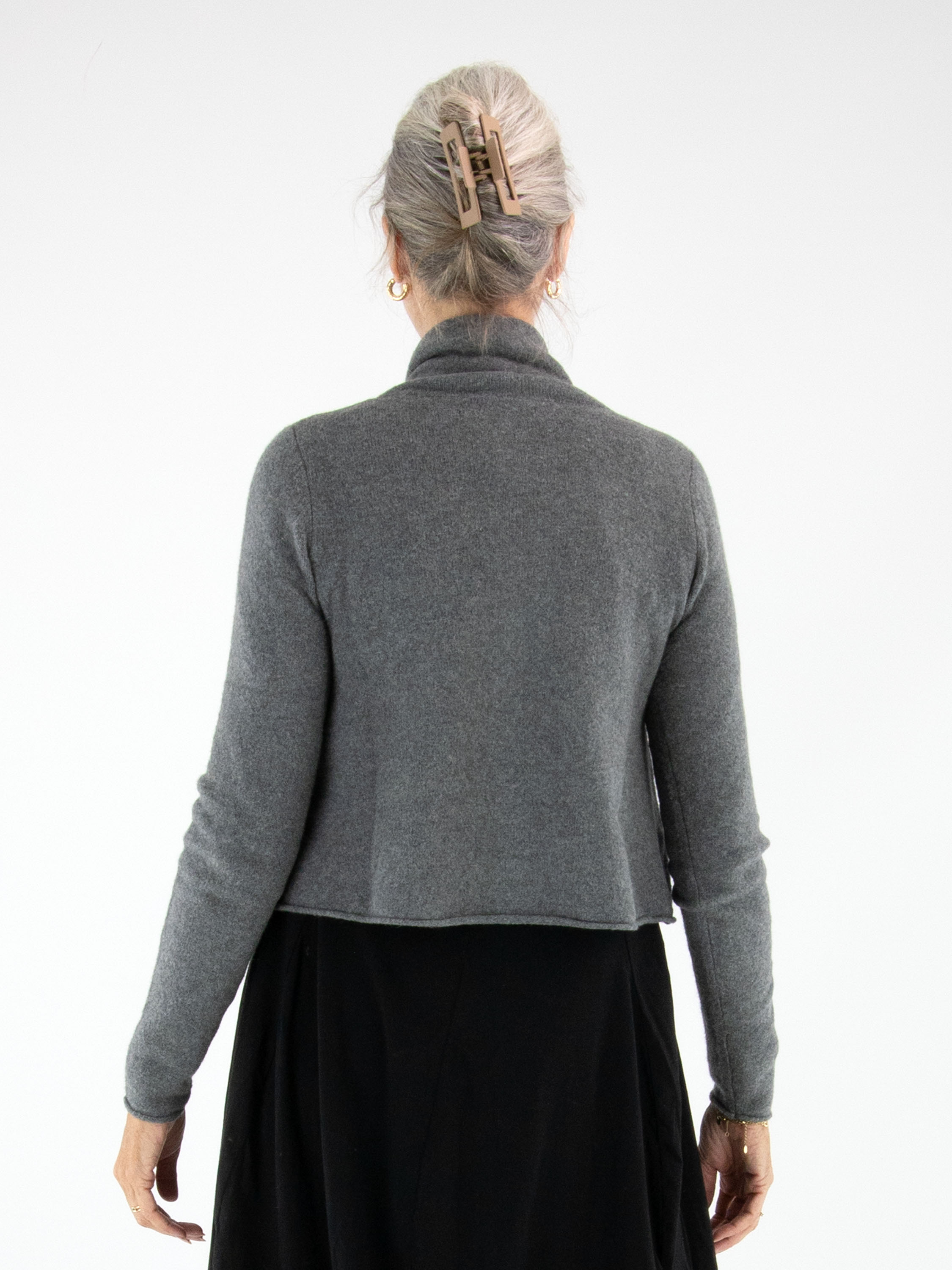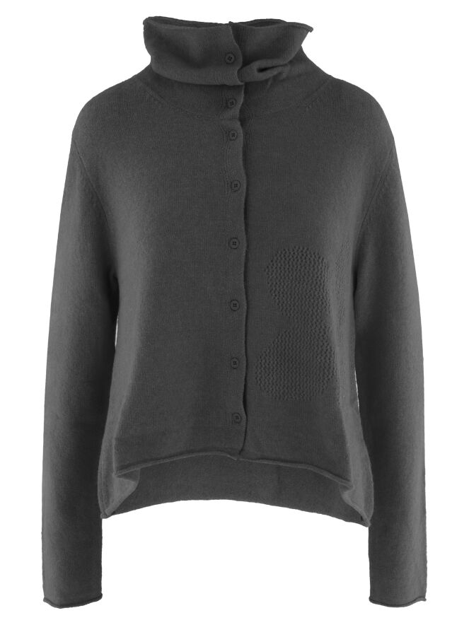 A short, loose cardigan by Rundholz Black Label in grey. It features a draped turtleneck and a ruffled hemline. The left front panel is adorned with a floral pattern created in a contrasting knit. This cardigan must be hand-washed.