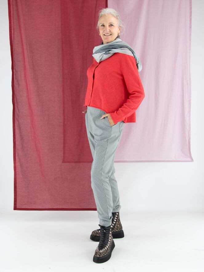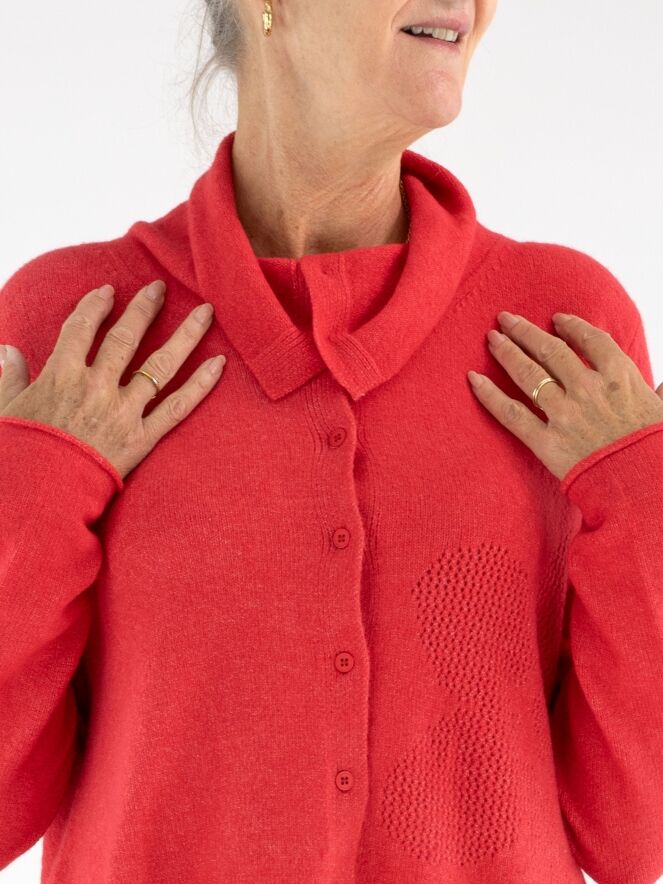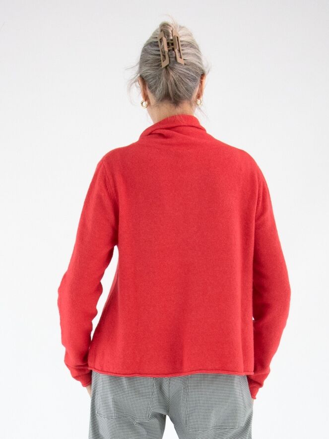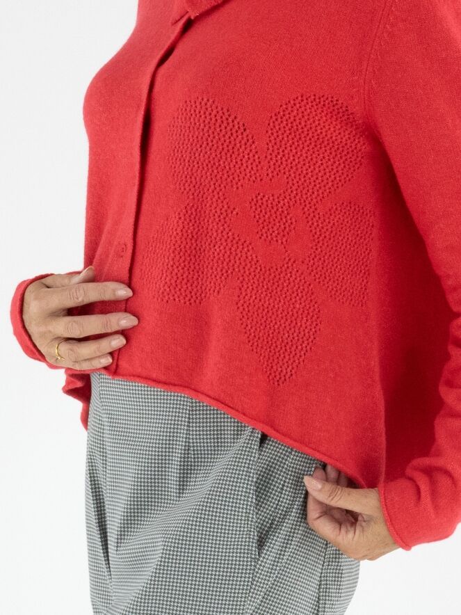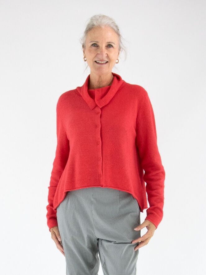 A short, wide cardigan by Rundholz Black Label in red. It features a draped turtleneck, a ruffled hemline, and a floral pattern on the left front panel, knitted in a contrasting stitch. This cardigan must be hand-washed.