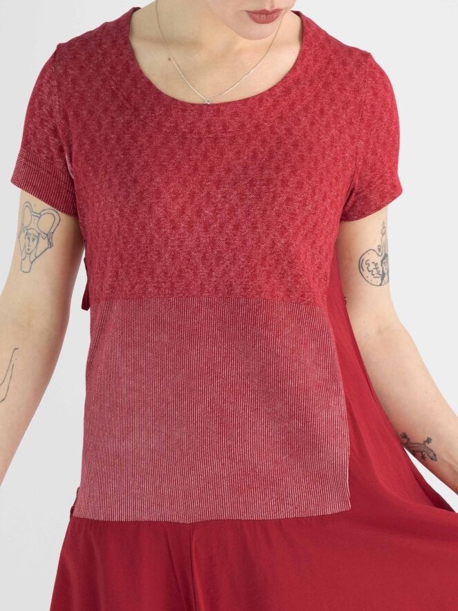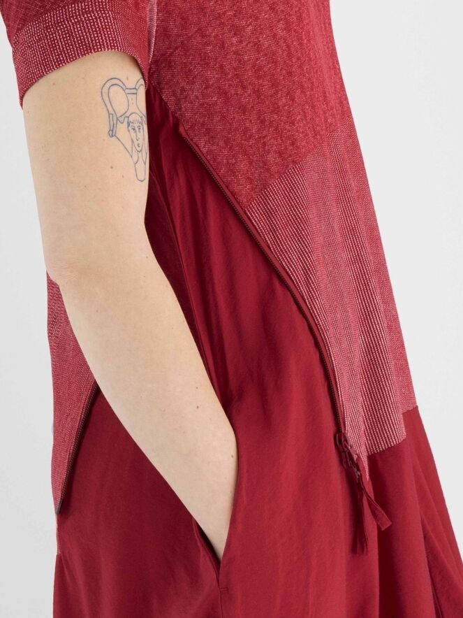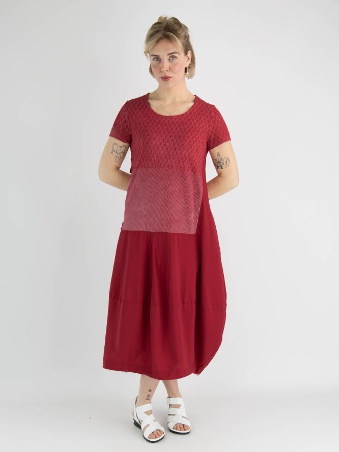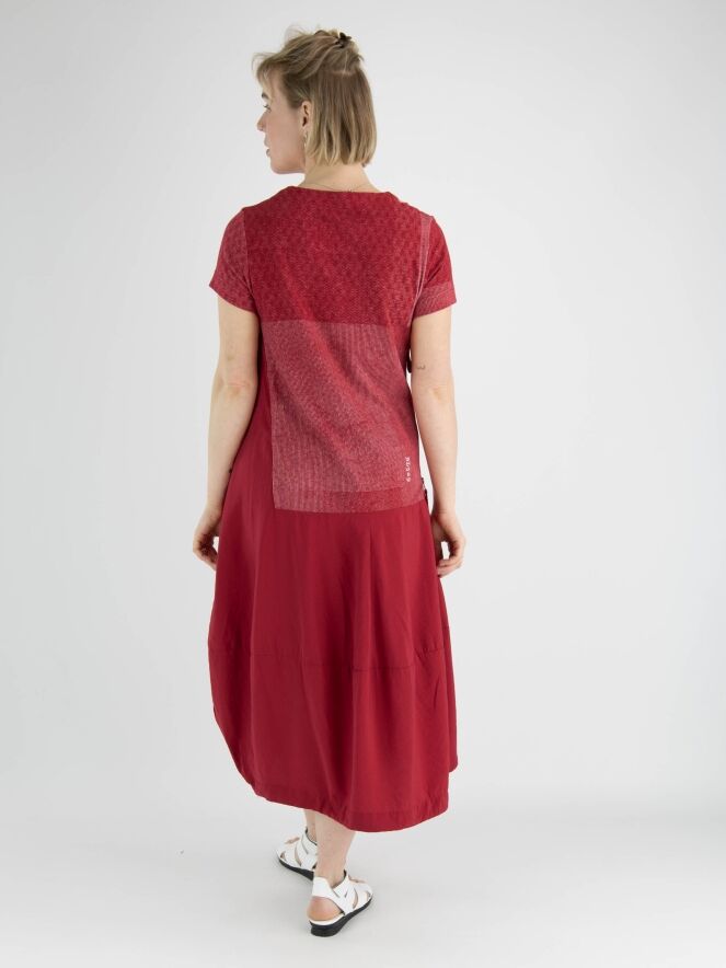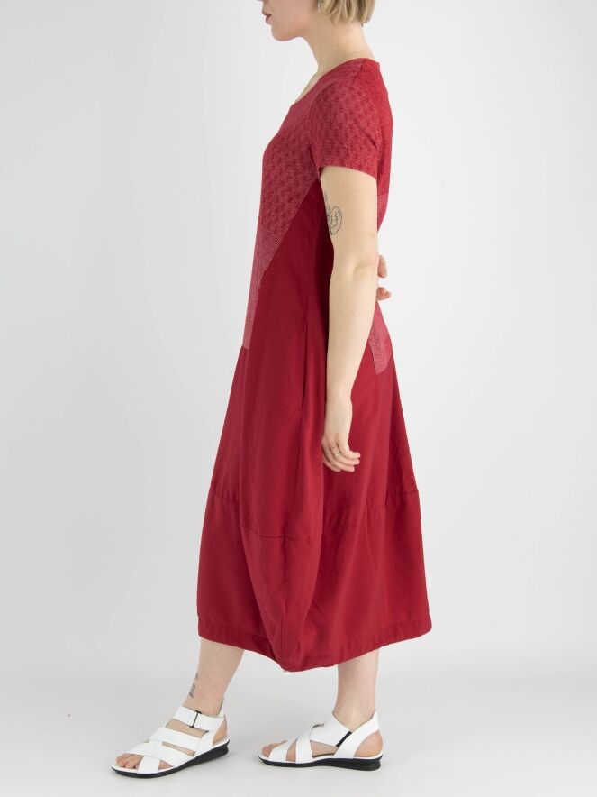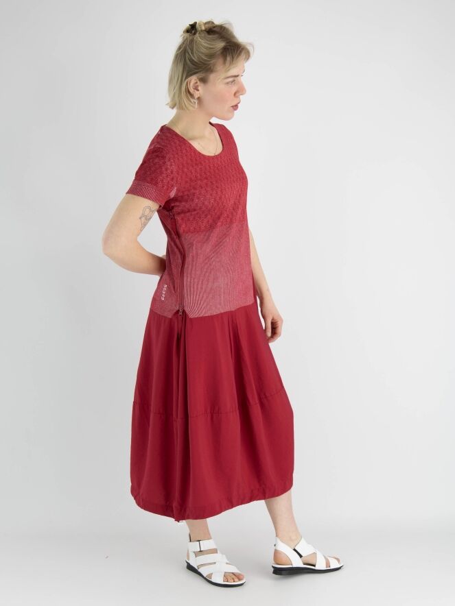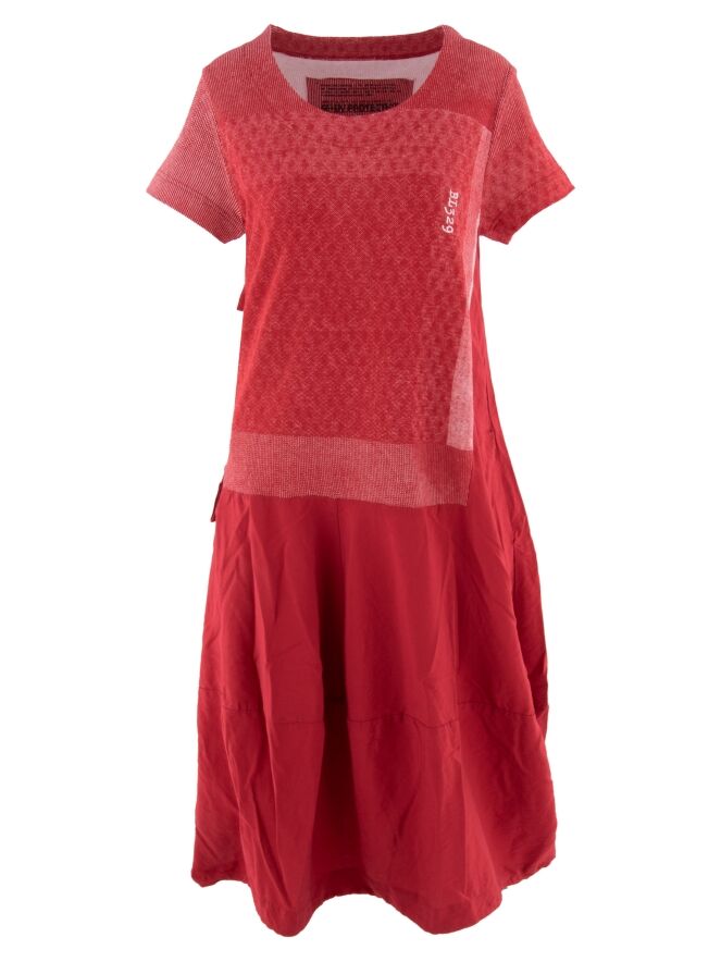 A dress by Rundholz Black Label in red with a graphic print above the waist in red and white. The dress has a round neckline and short sleeves. From the waist, the dress has a balloon shape, and a zipper is placed on the right side to provide more room when opened. This dress can be hand washed.