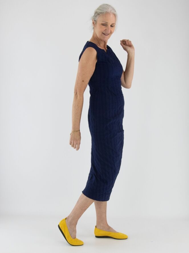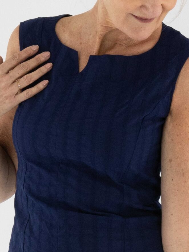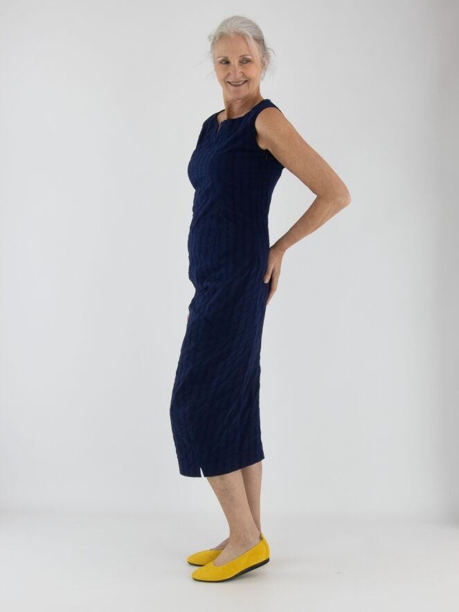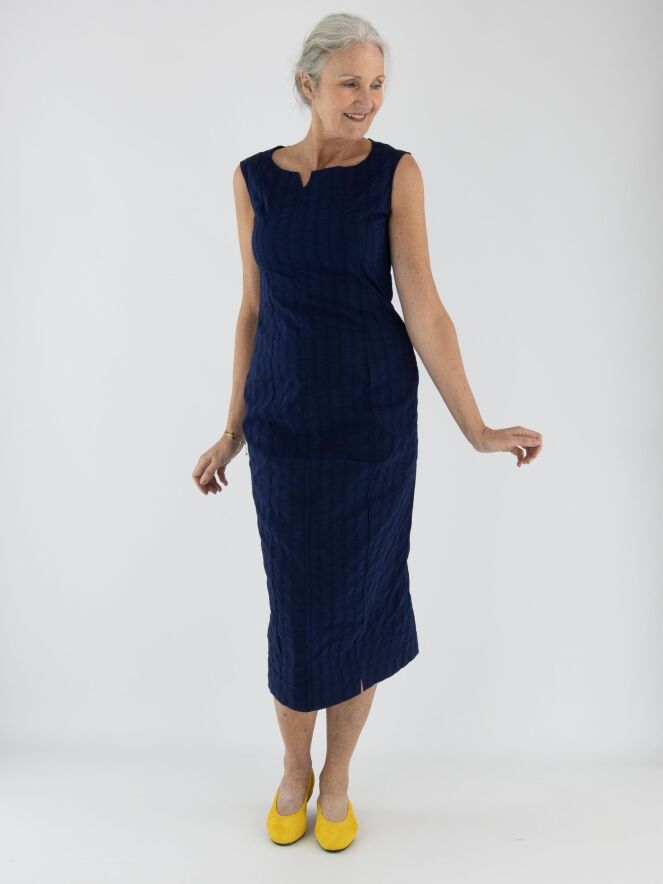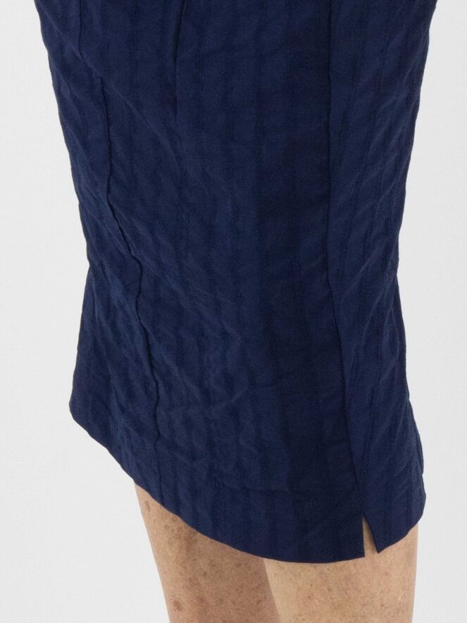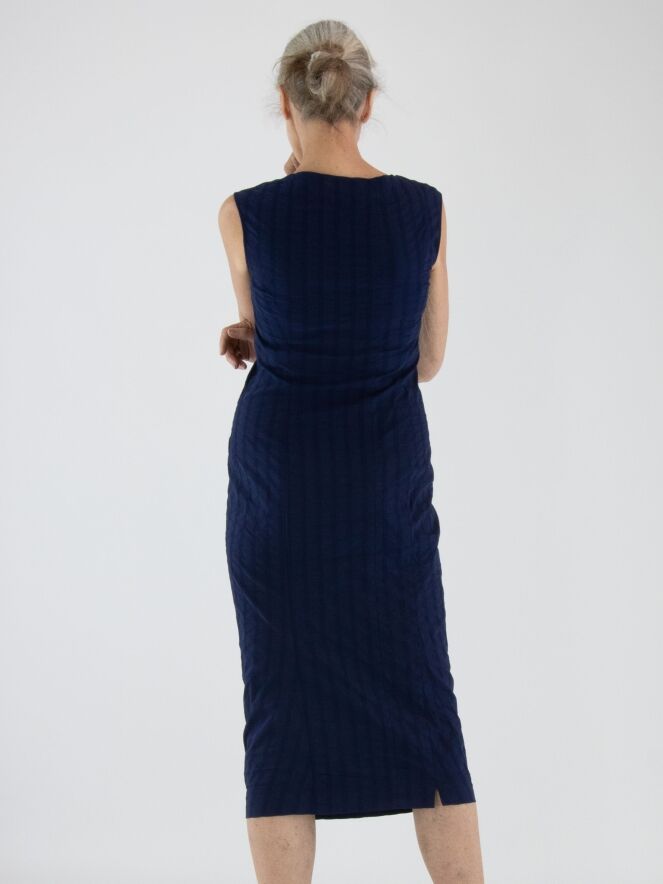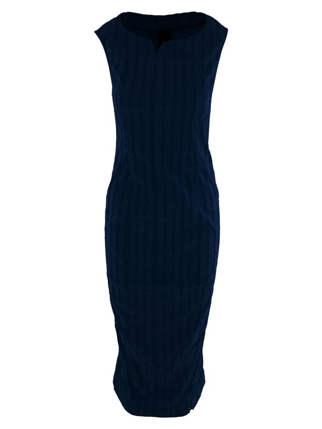 A slightly tailored dress from Rundholz Black Label in navy blue. The dress features a vertical striped pattern with stitching details. A small notch is placed at the center of the round neckline. This dress can be washed at 30 degrees.