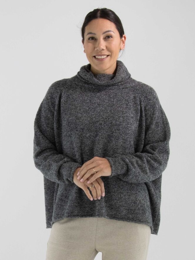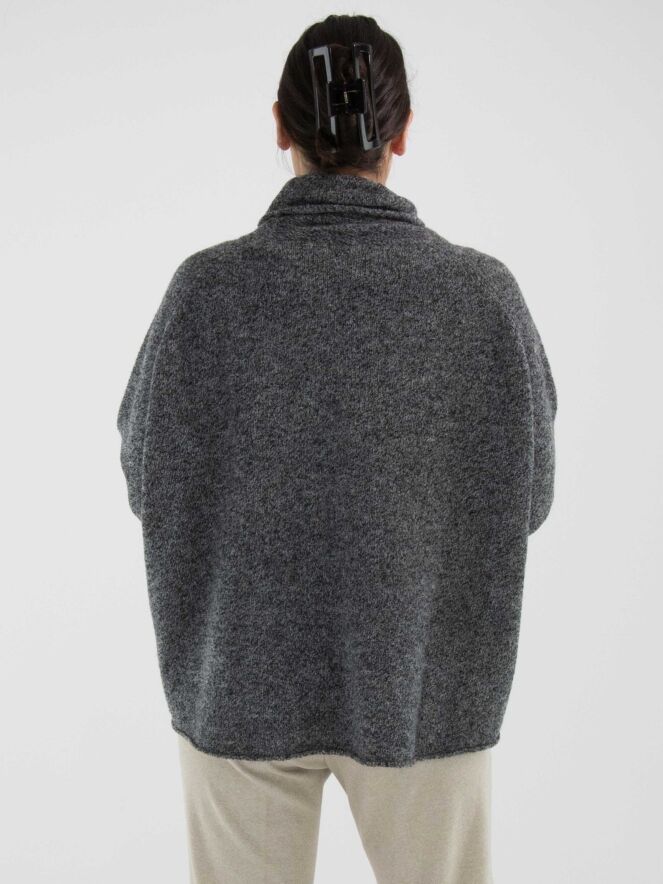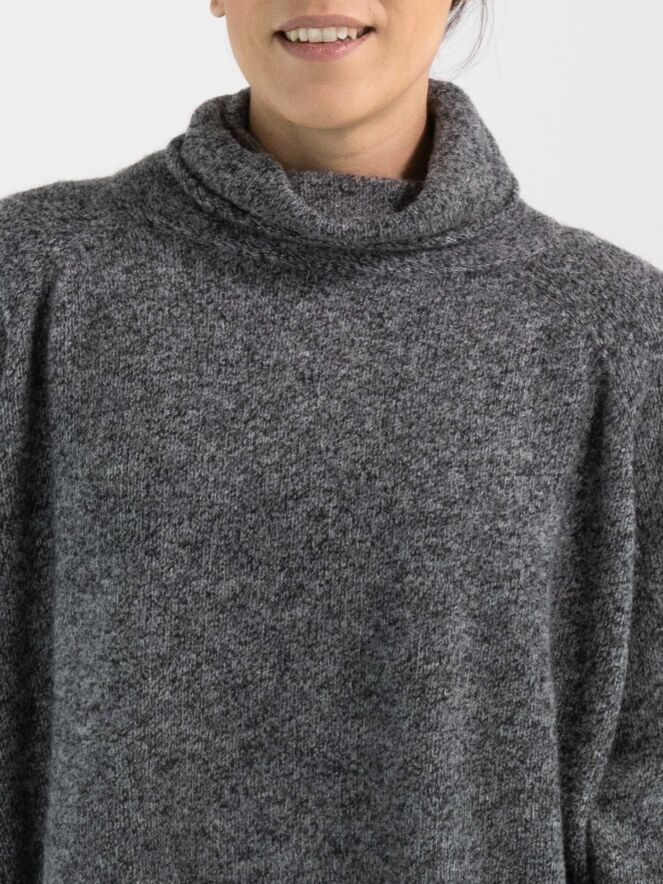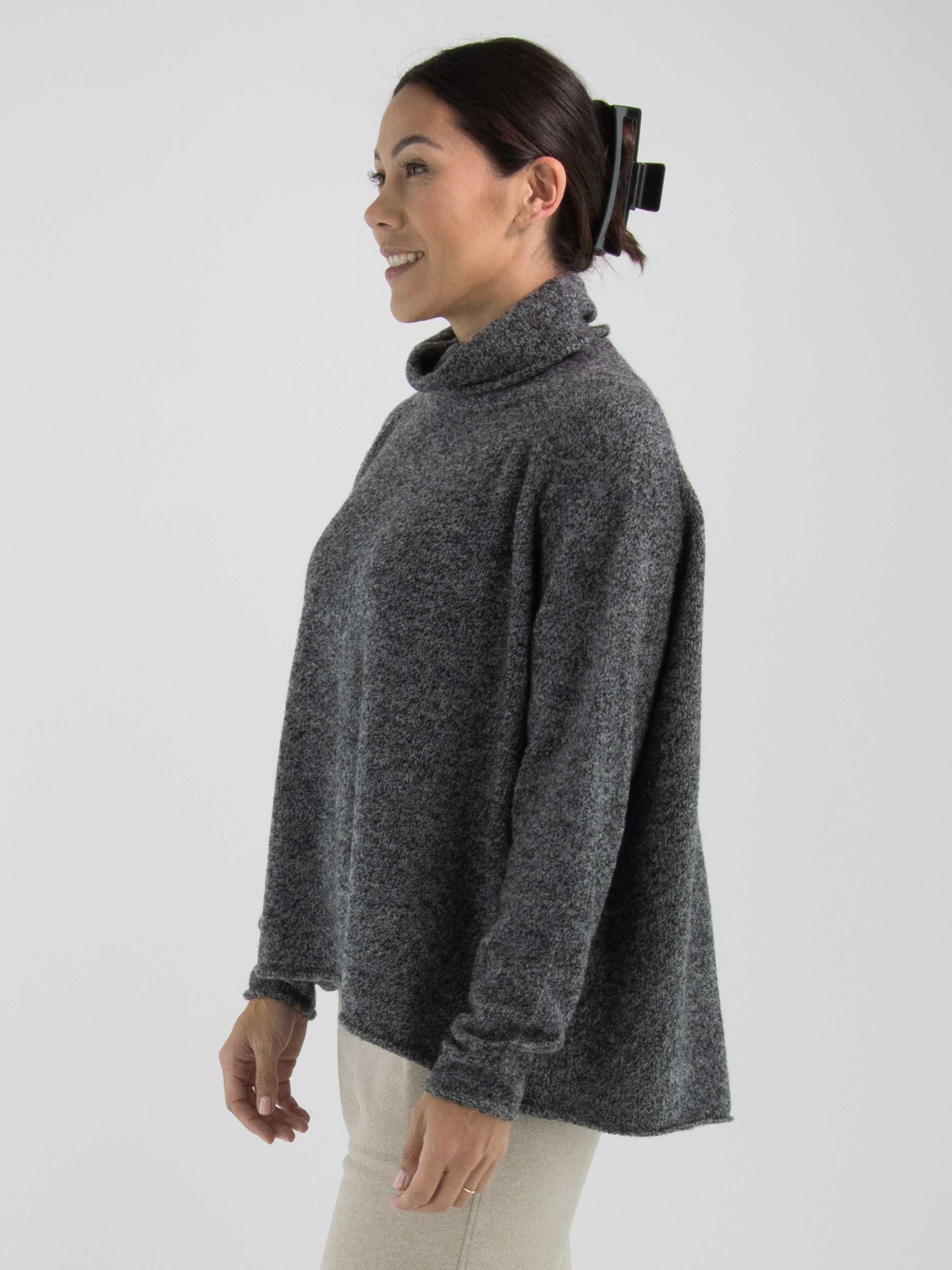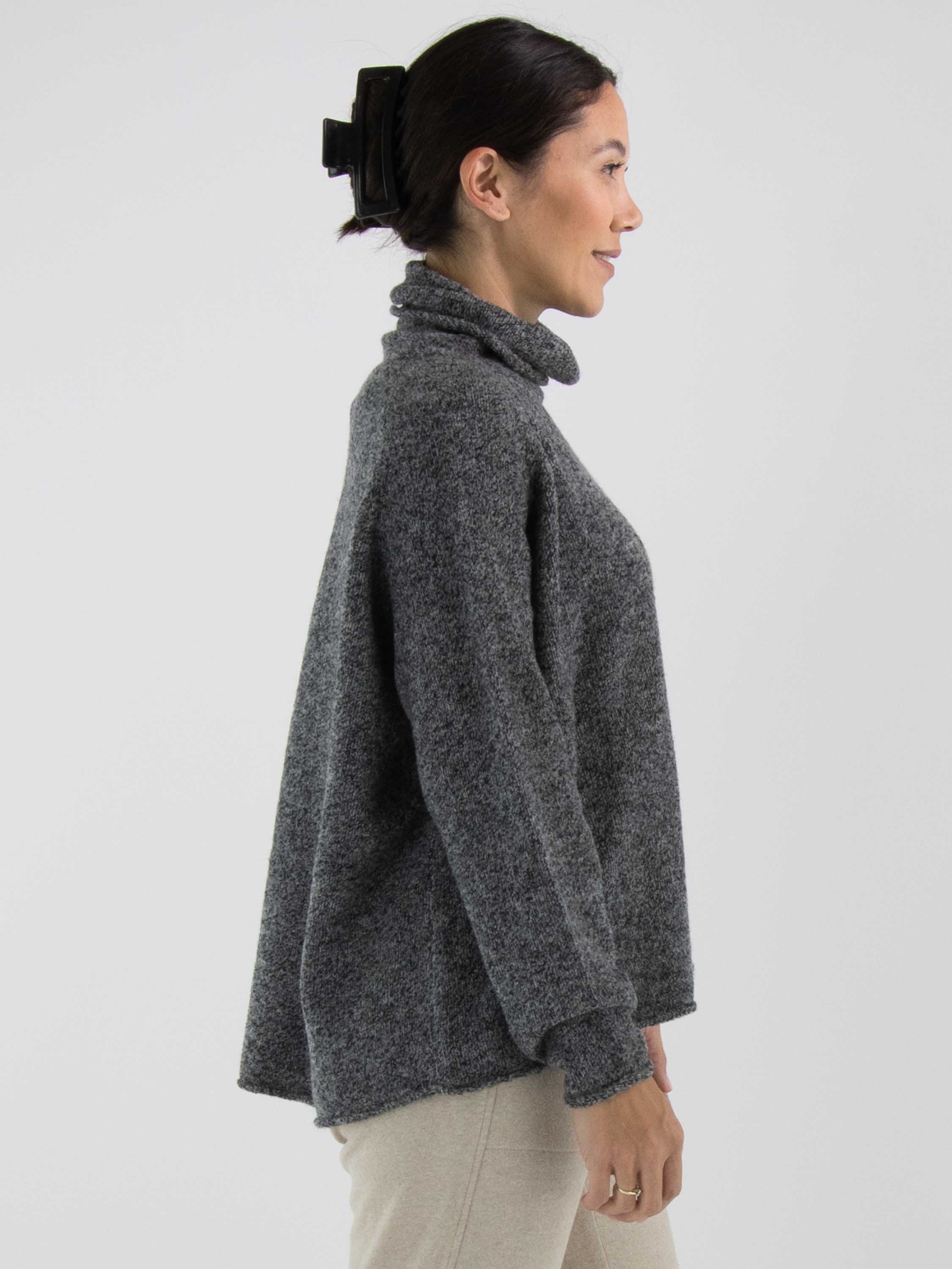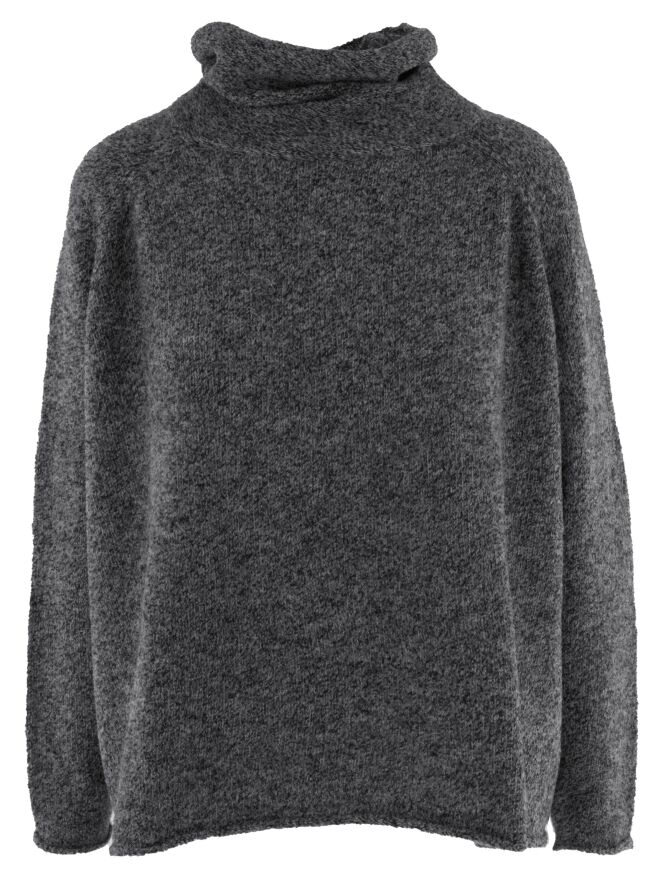 A loose, melange sweater by Rundholz Black Label in shades of grey with black. It features a draped turtleneck and must be hand-washed.