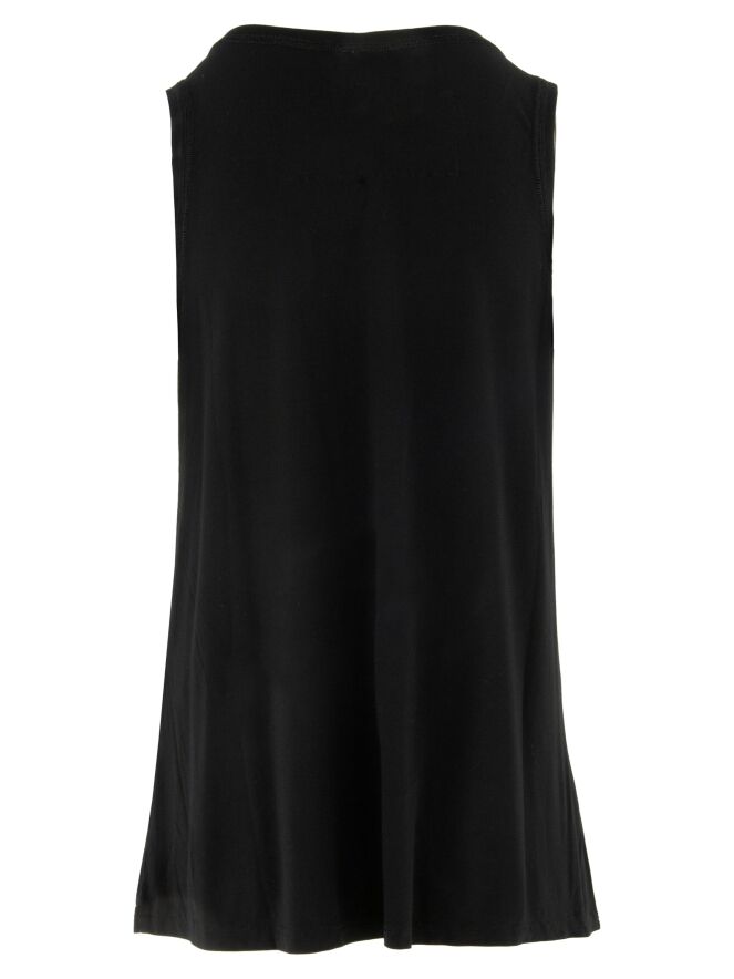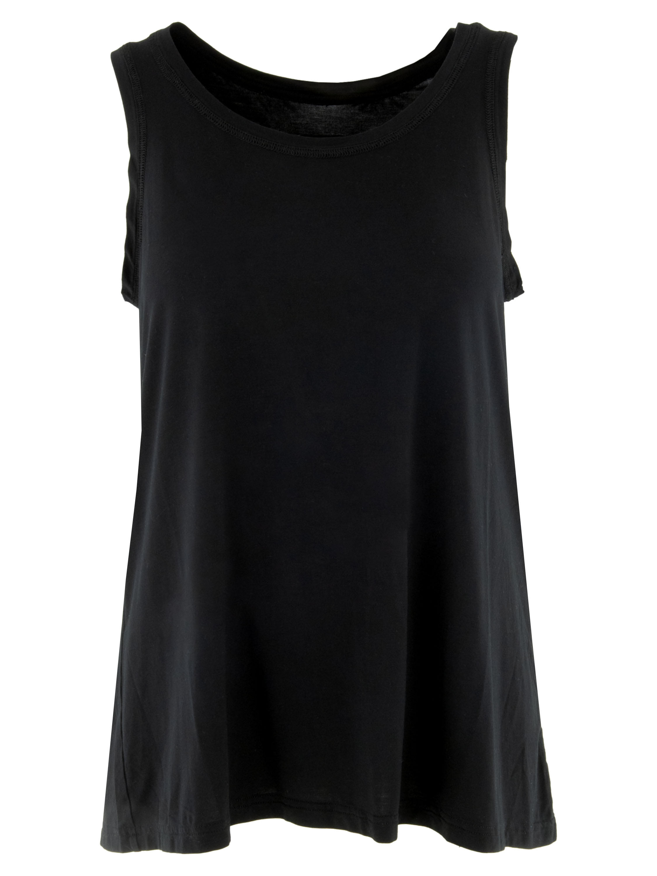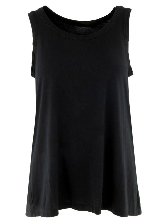 Top by Rundholz Black Label in black. The design features a wide round neckline and a subtle A-line shape, creating a relaxed and contemporary fit. The shoulder straps are approximately 3 cm wide. This top can be washed at 30 degrees.