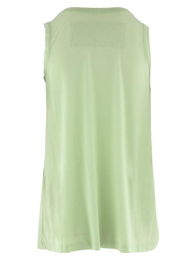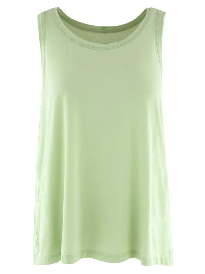 Top by Rundholz Black Label in a fresh pistachio green shade. The design features a wide round neckline and a subtle A-line silhouette, creating a fluid and modern look. The shoulder straps are approximately 3 cm wide. This top can be washed at 30 degrees.