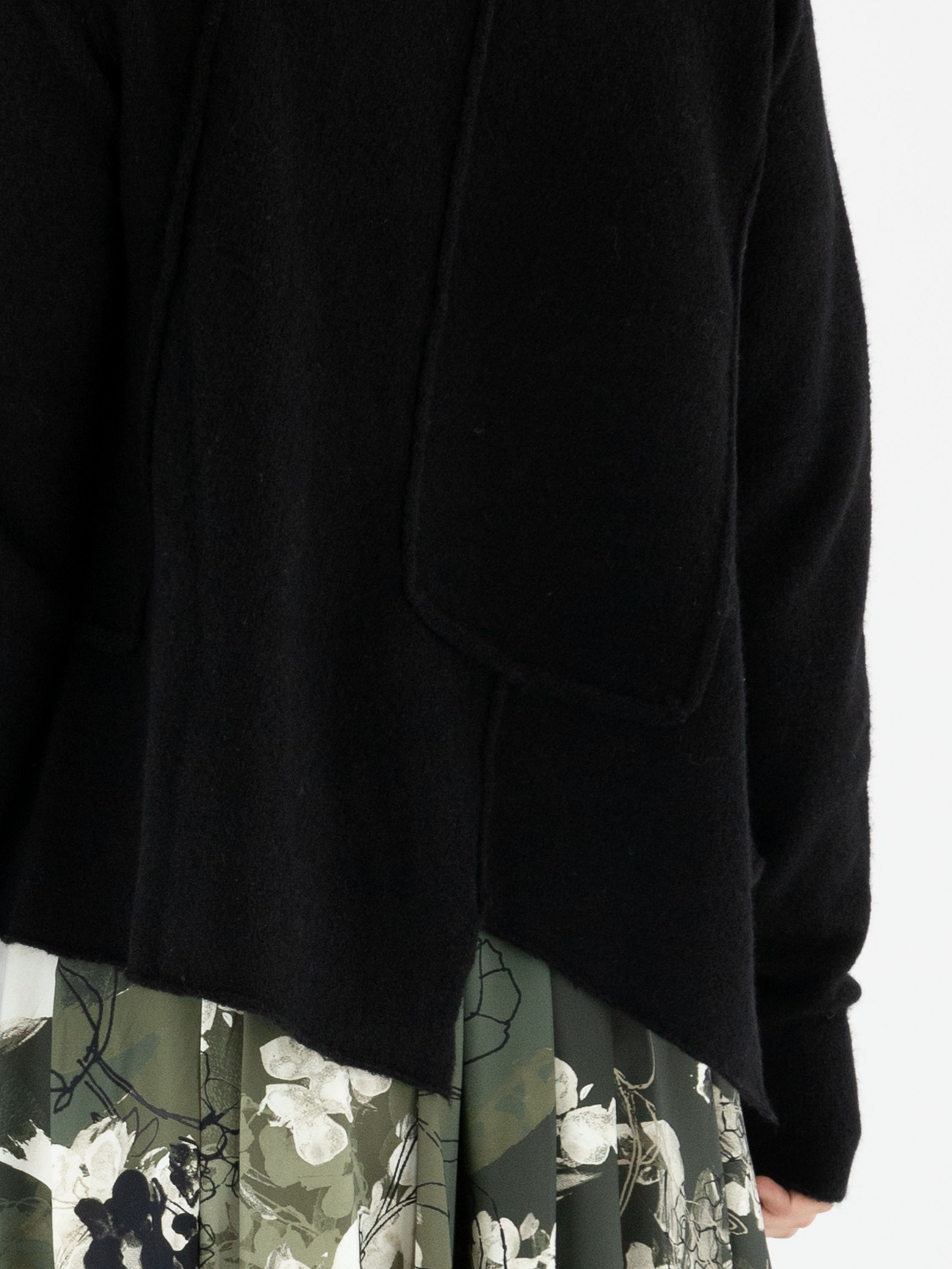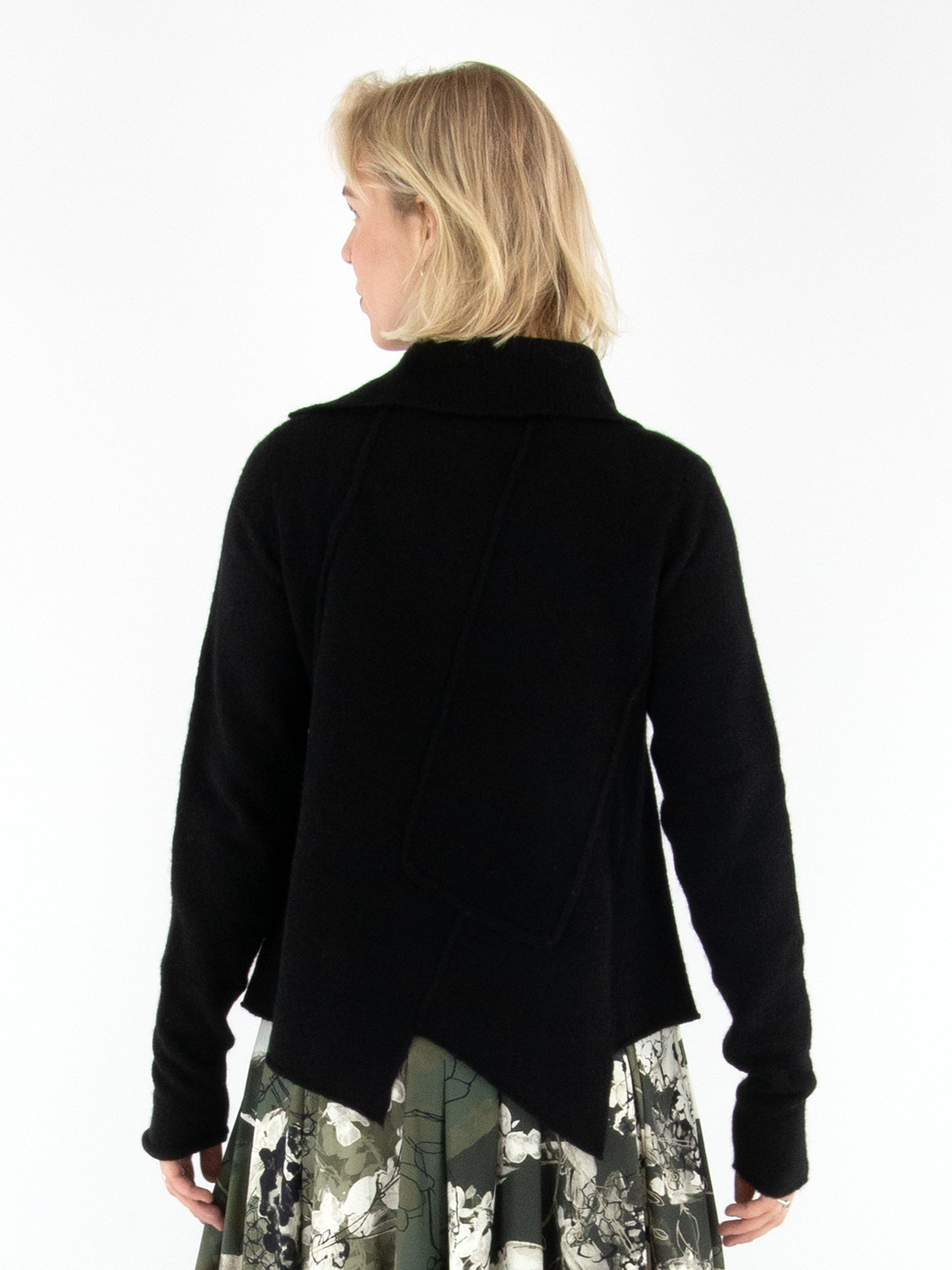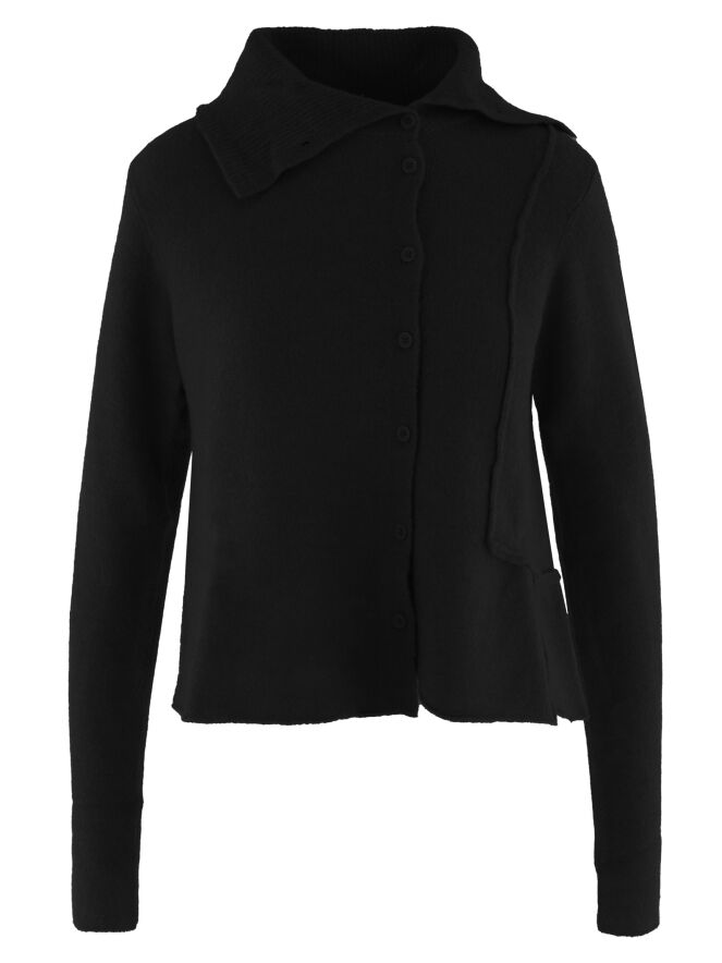 A cardigan by Rundholz Black Label in black. The front and back feature several reversed seams. The draped turtleneck is finely ribbed, and the hemline is cut asymmetrically. This cardigan should be hand washed.