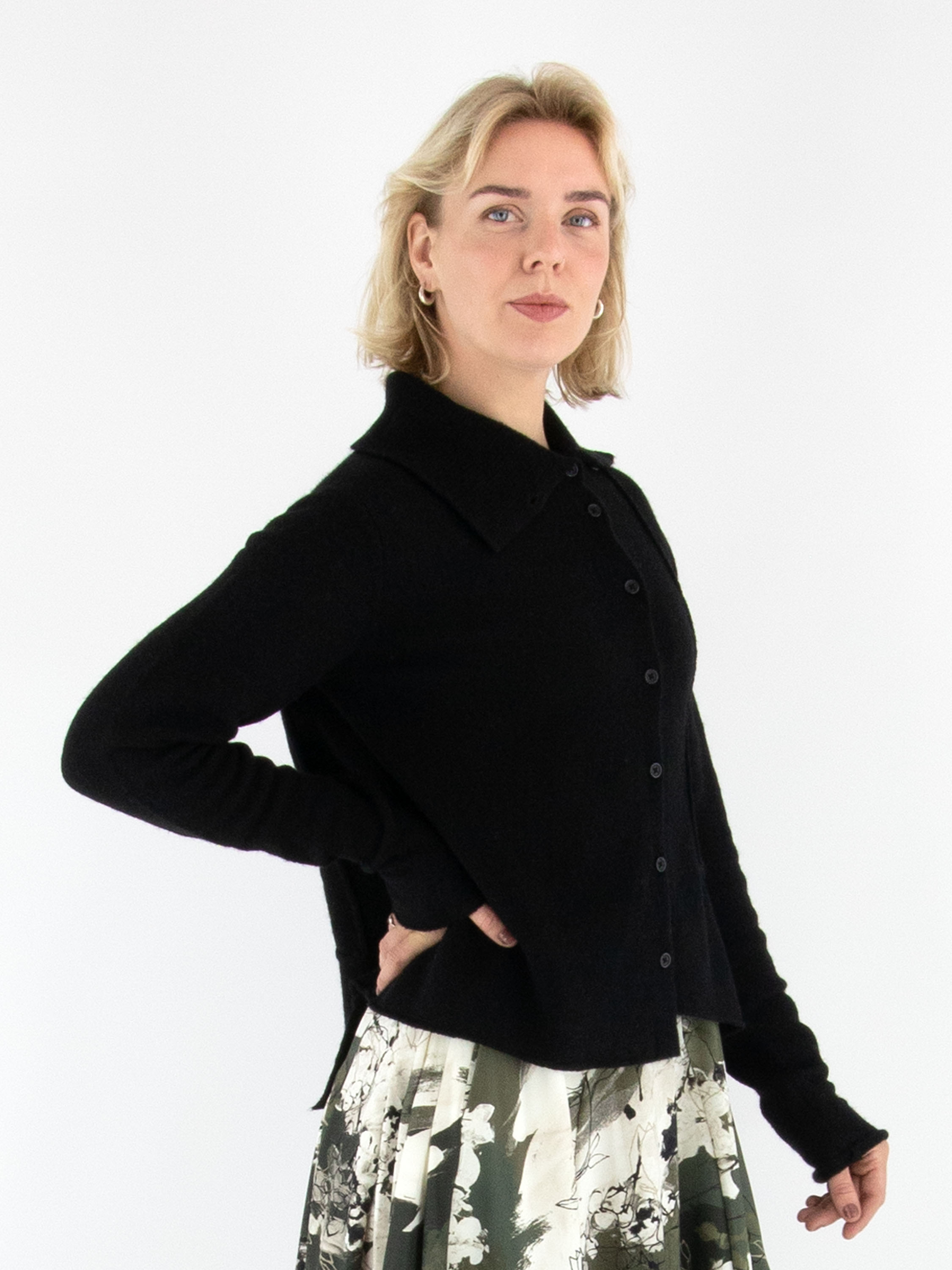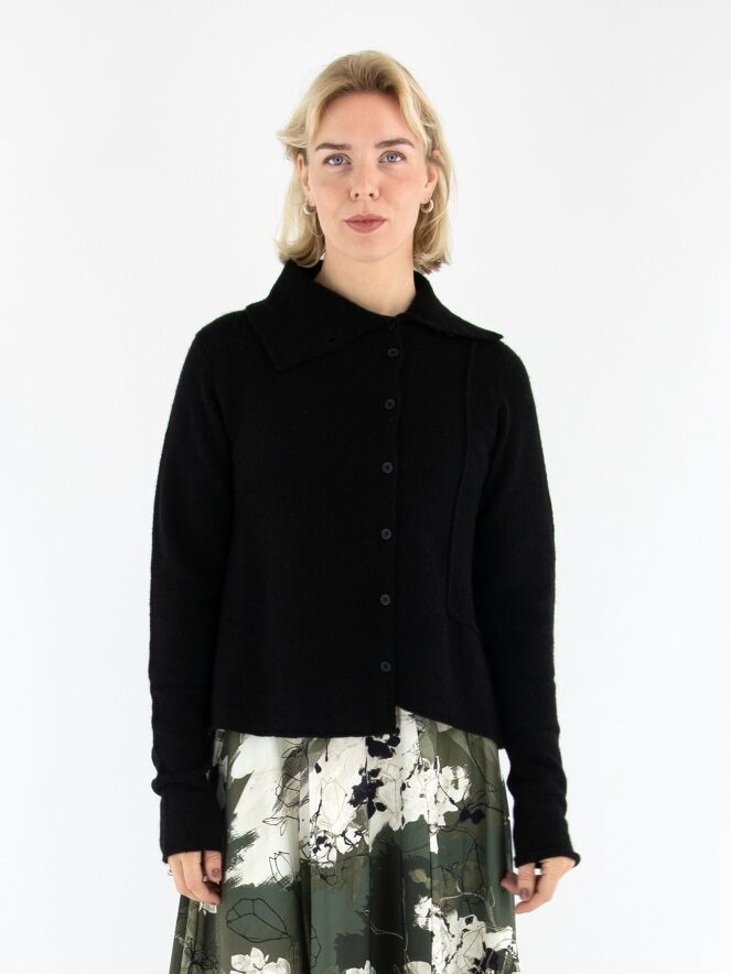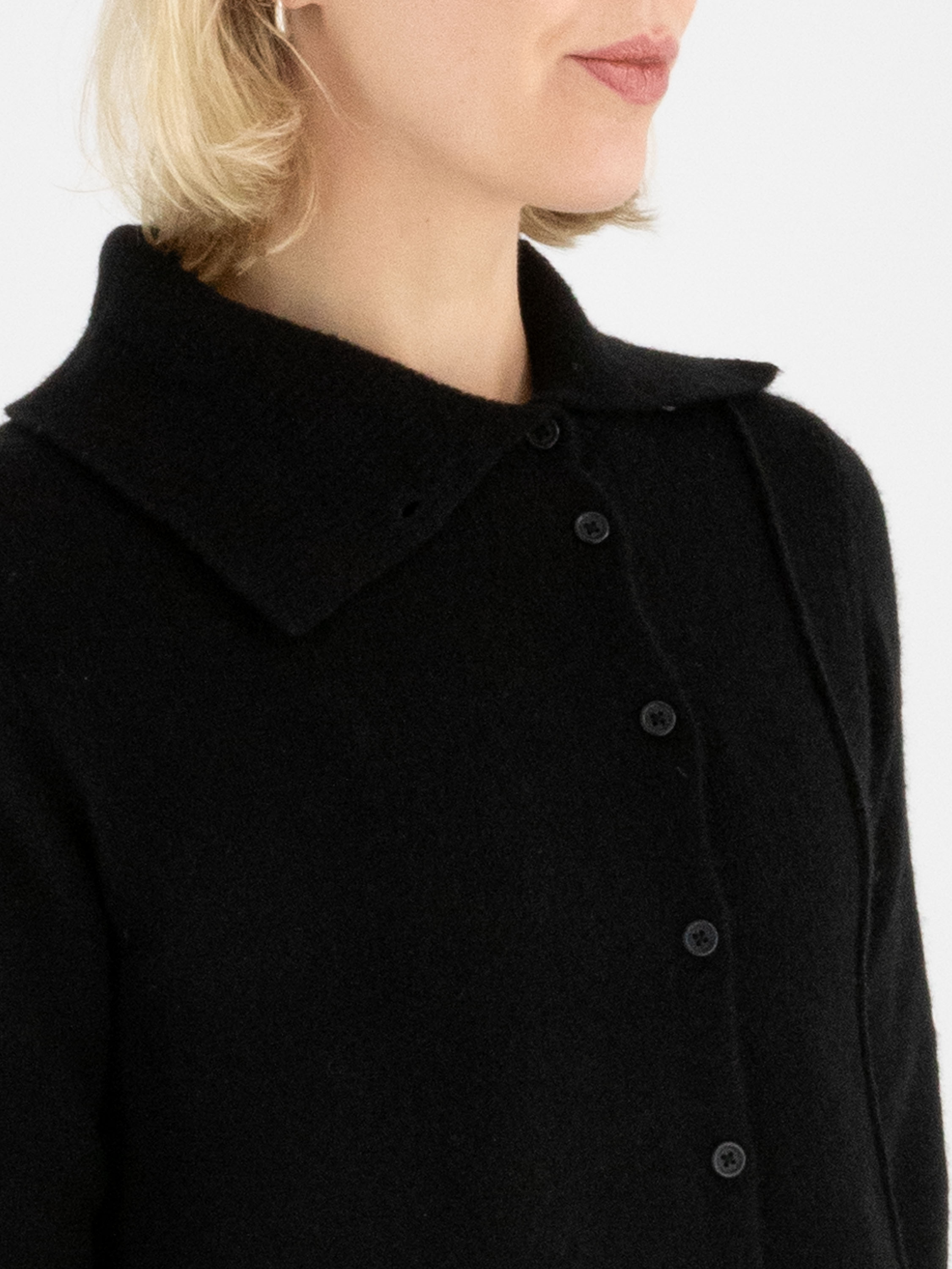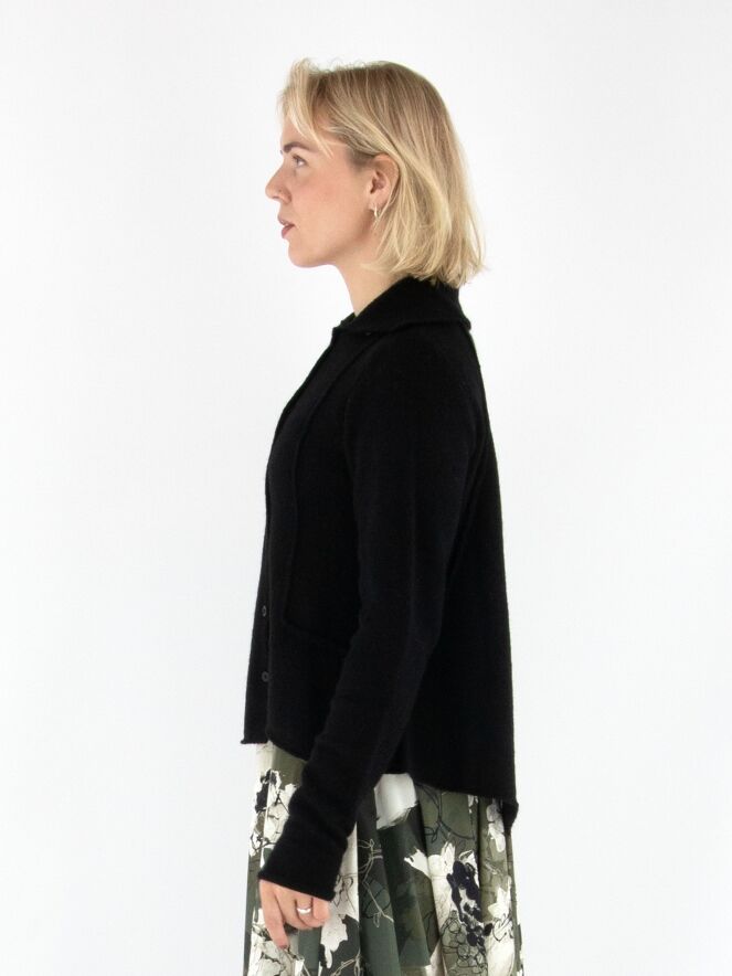 A cardigan by Rundholz Black Label in black. The front and back feature several reversed seams. The draped turtleneck is finely ribbed, and the hemline is cut asymmetrically. This cardigan should be hand washed.
