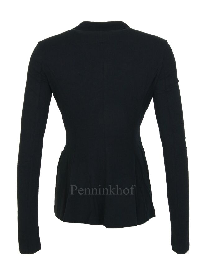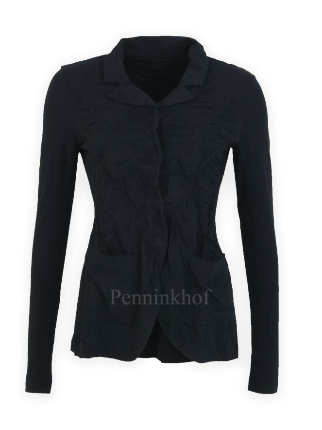 A cardigan from Rundholz in the color black. The front is shirred diagonally. The back and the sleeves are in a uni fabric. This vest can be washed at 30 degrees.