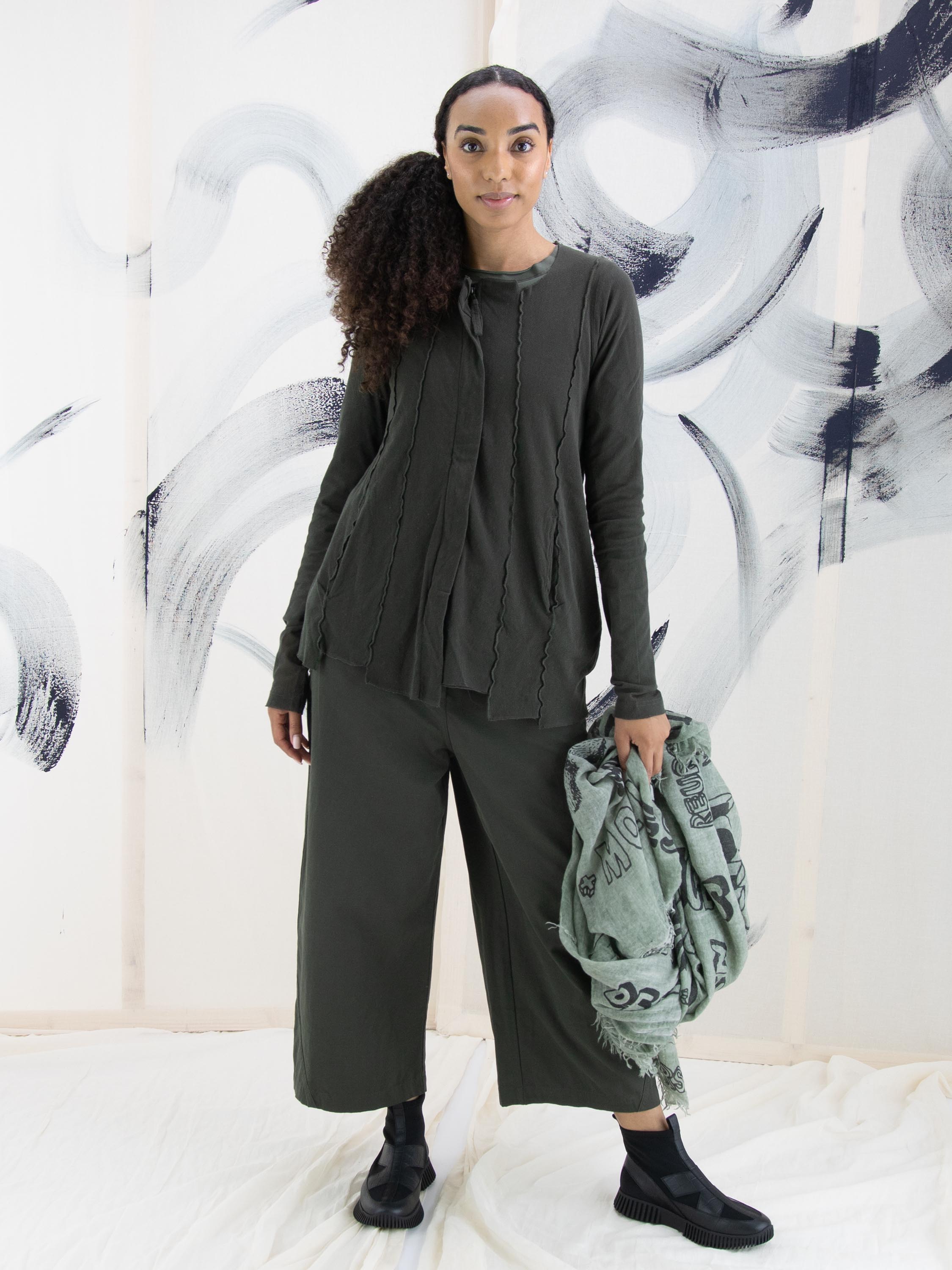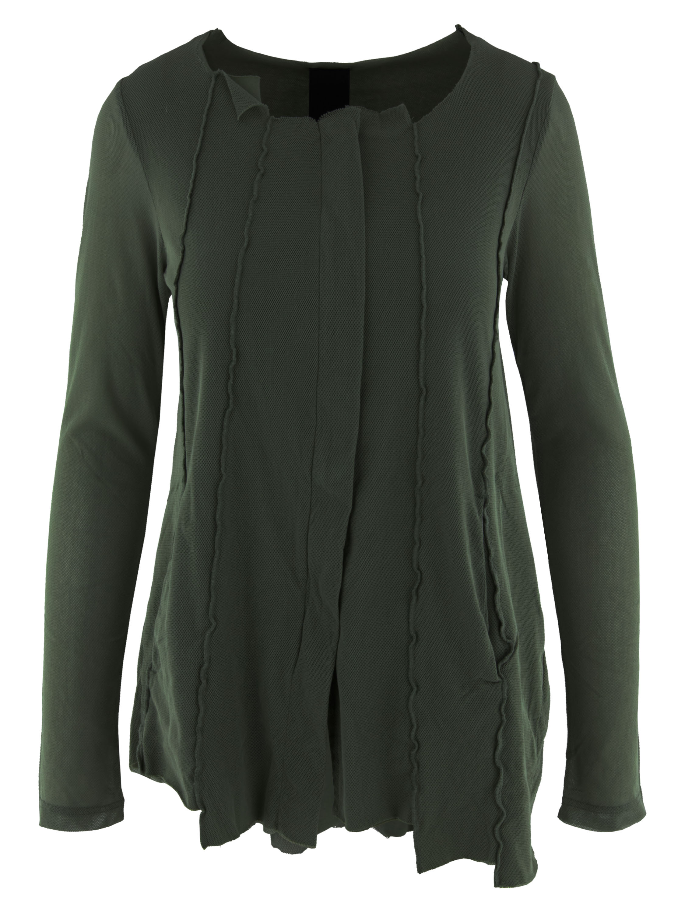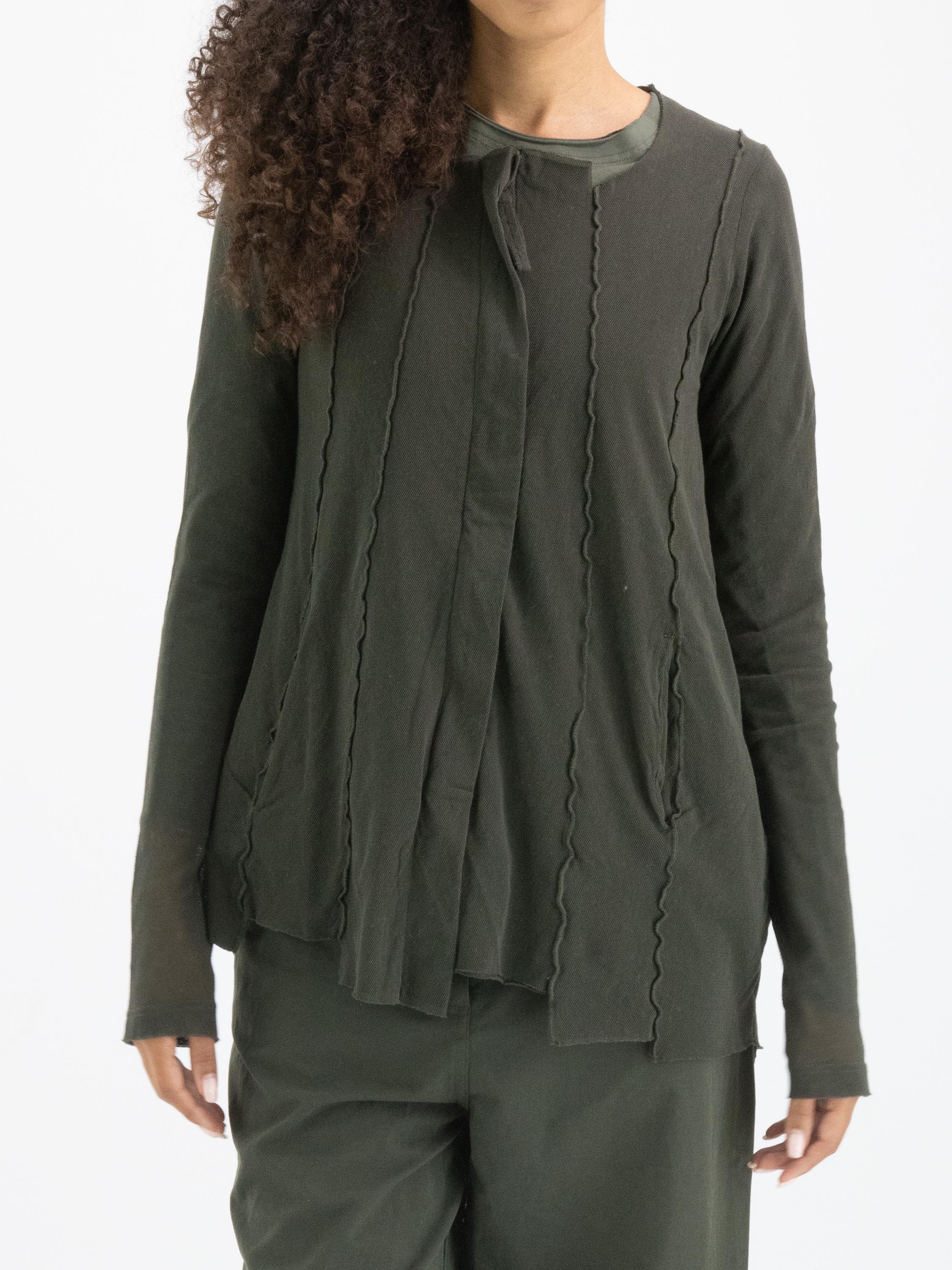 A cardigan by Rundholz Black Label in khaki color. The cardigan features a voile transparent fabric overlay that beautifully enhances the long sleeves. From the irregular round neckline, several inverted seams run downward. This cardigan can be washed at 30 degrees.