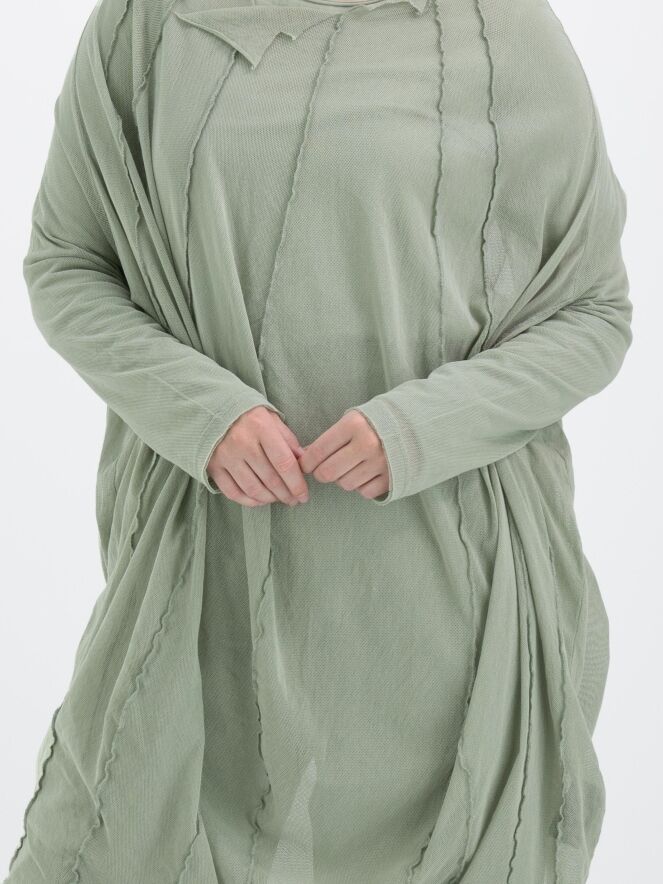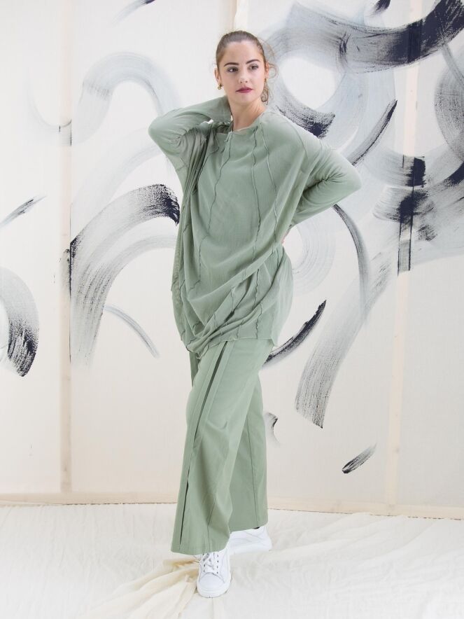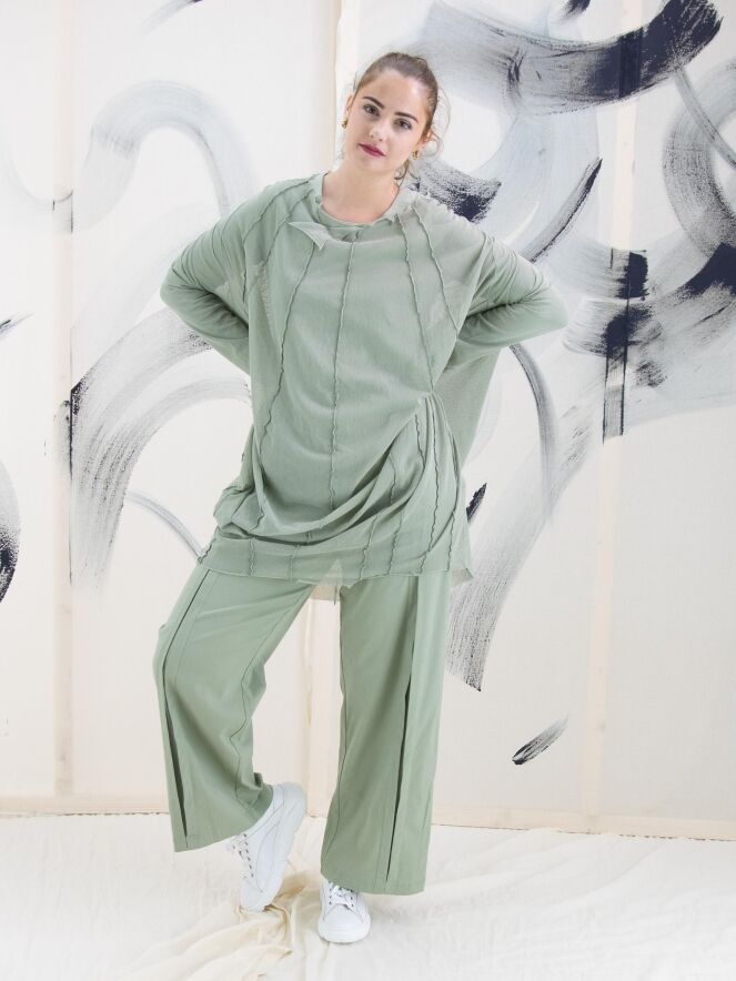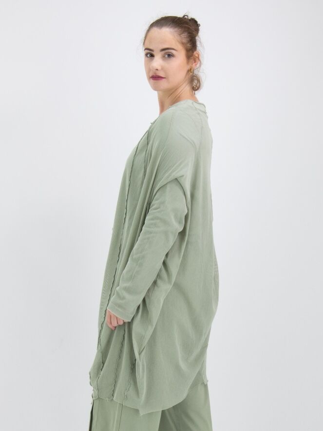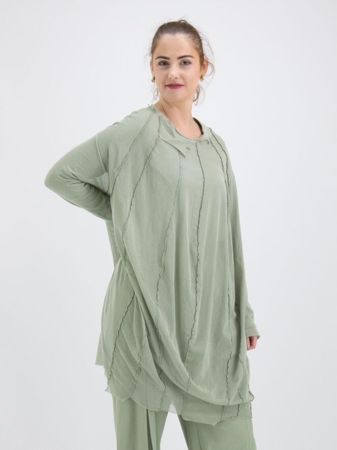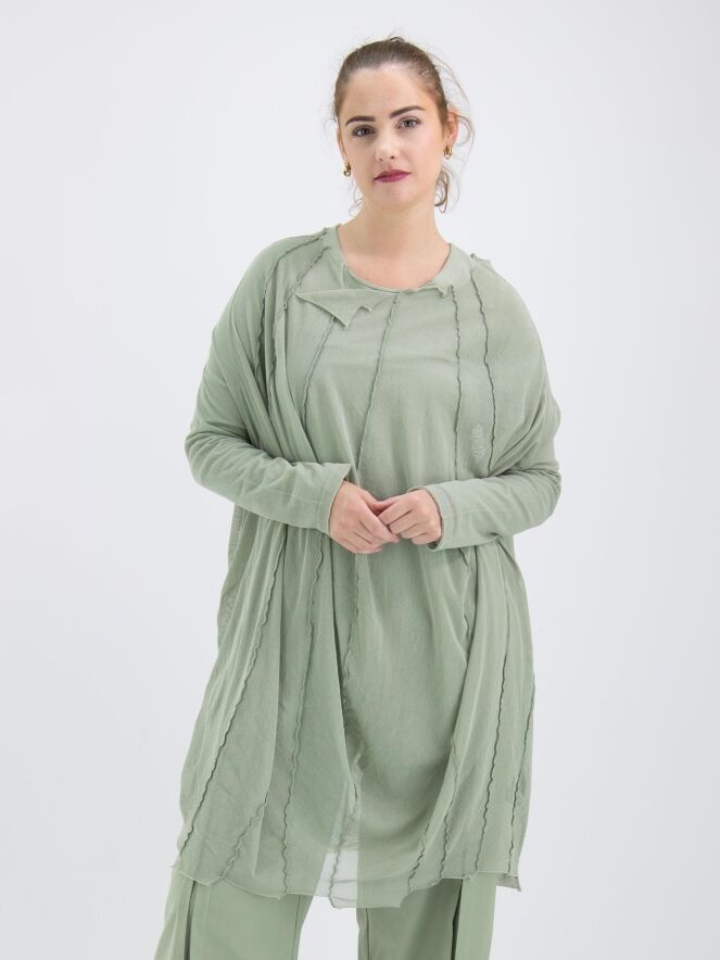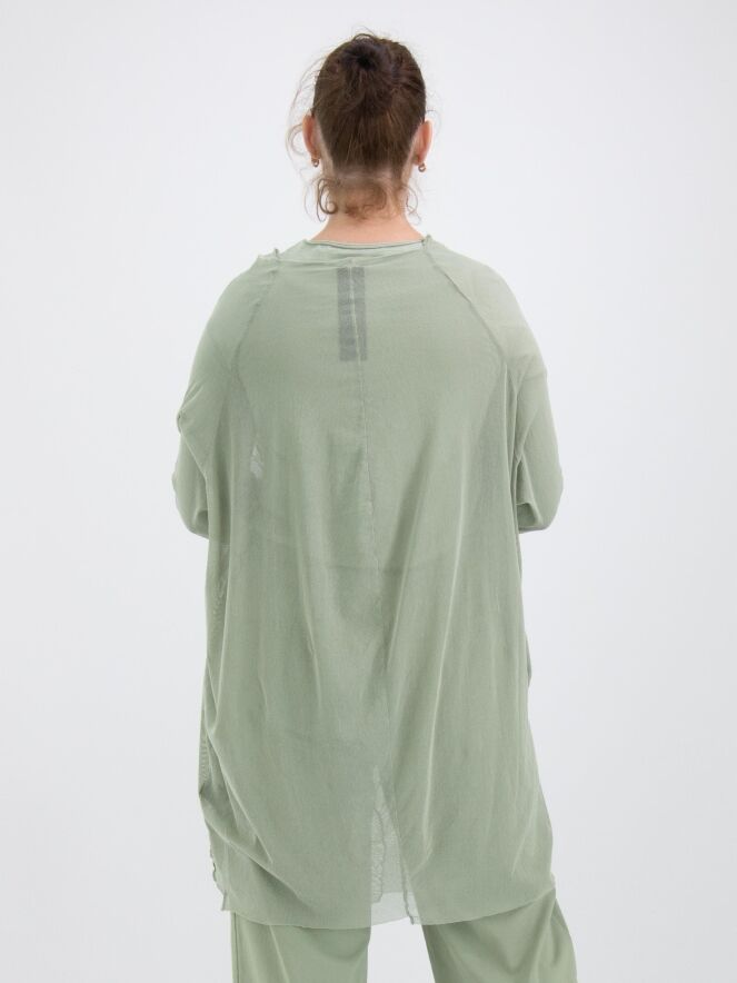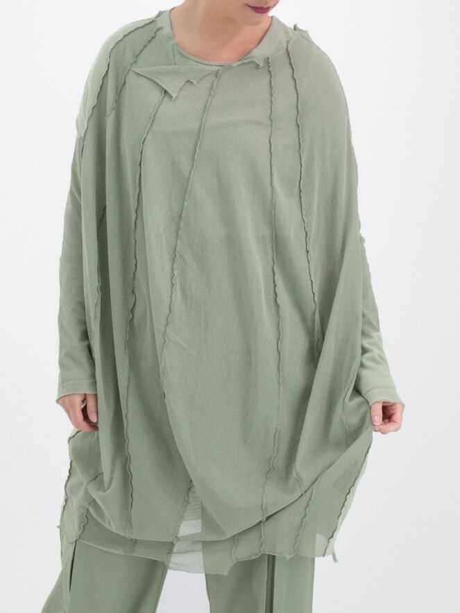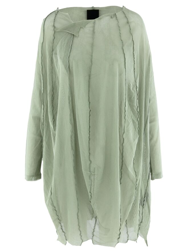 A transparent shirt by Rundholz Black Label in a soft olive color. From the wide, unfinished round neckline, several inverted seams run downward. The shirt has long sleeves and can be washed at 30 degrees.
