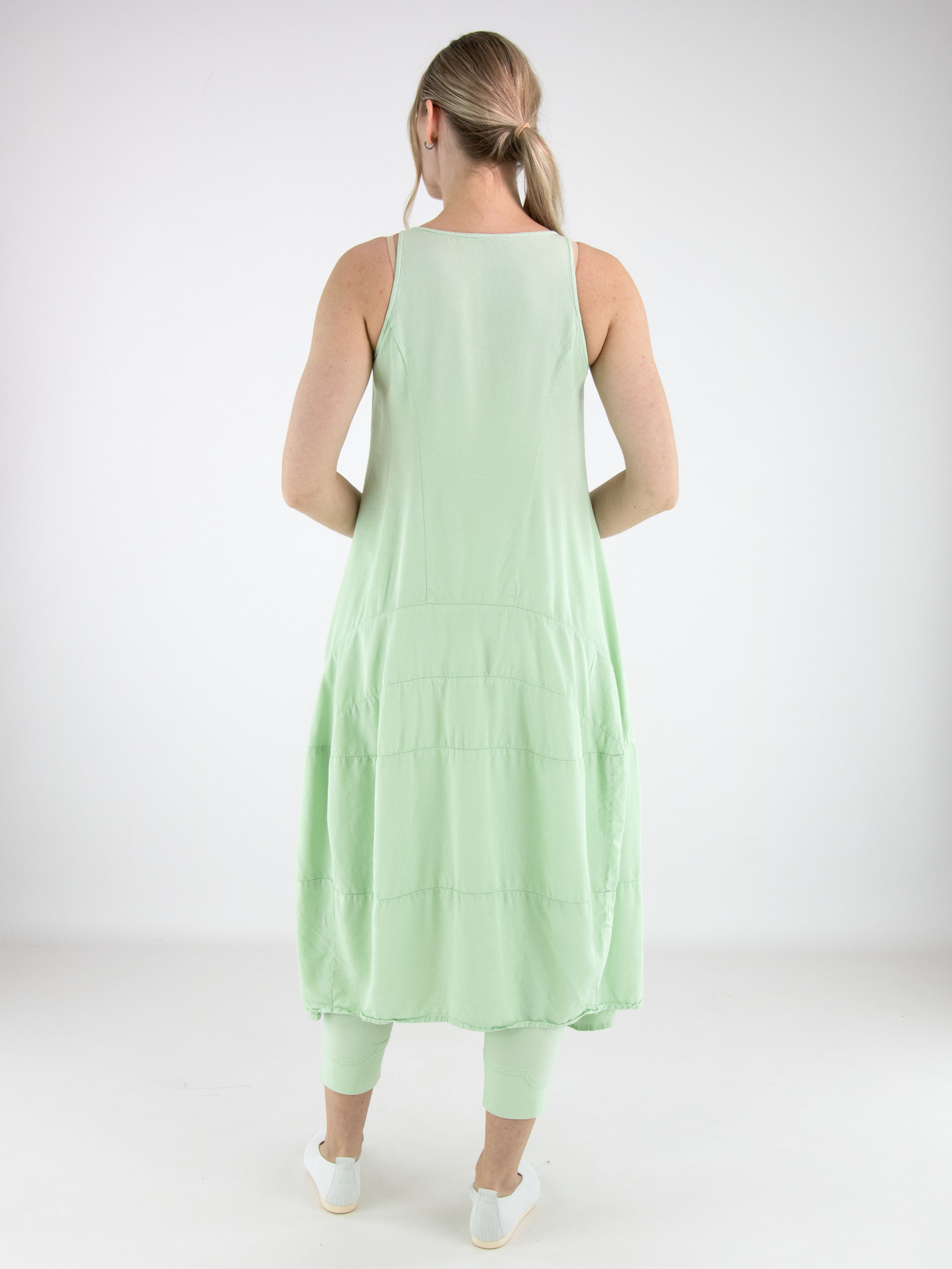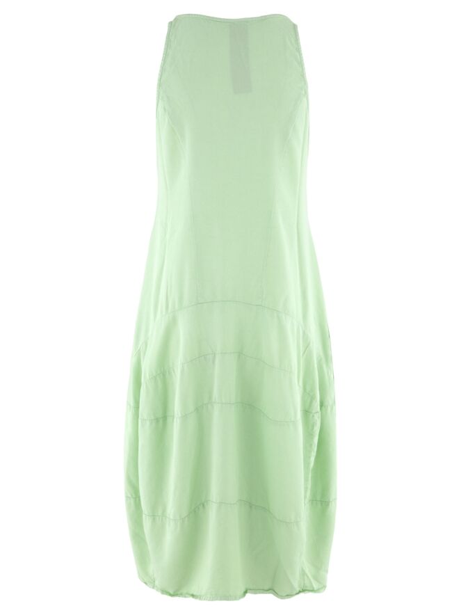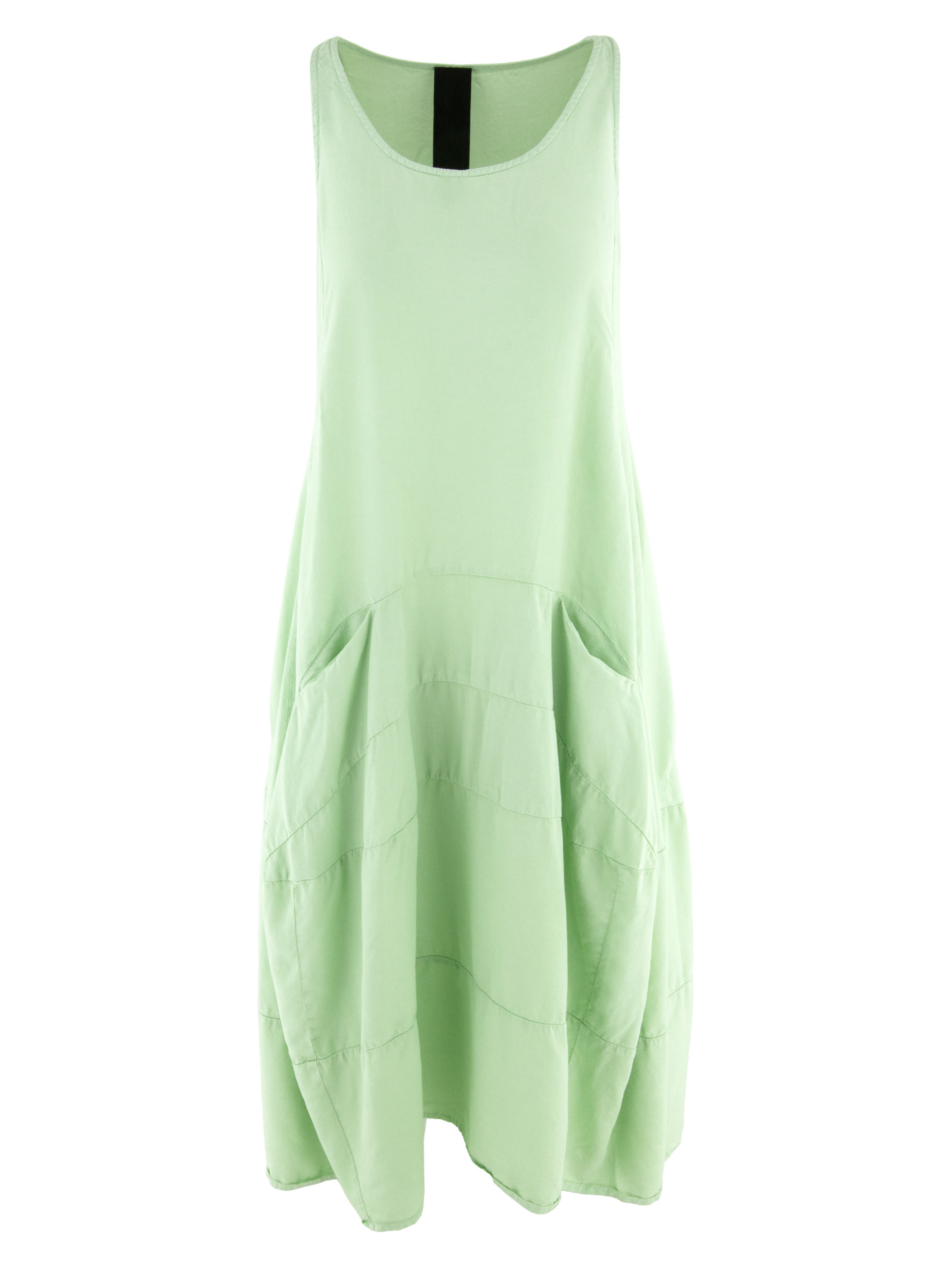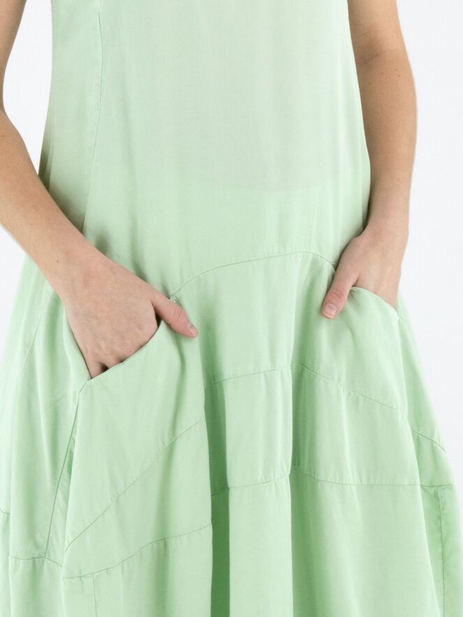 Sleeveless dress by Rundholz Black Label in a fresh pistachio green shade. Designed in a subtle A-line silhouette, multiple horizontal seams from the waist create structure and a gentle balloon shape. Side pockets at waist level add a practical yet contemporary touch. This exclusive designer dress can be washed at 30 degrees.
