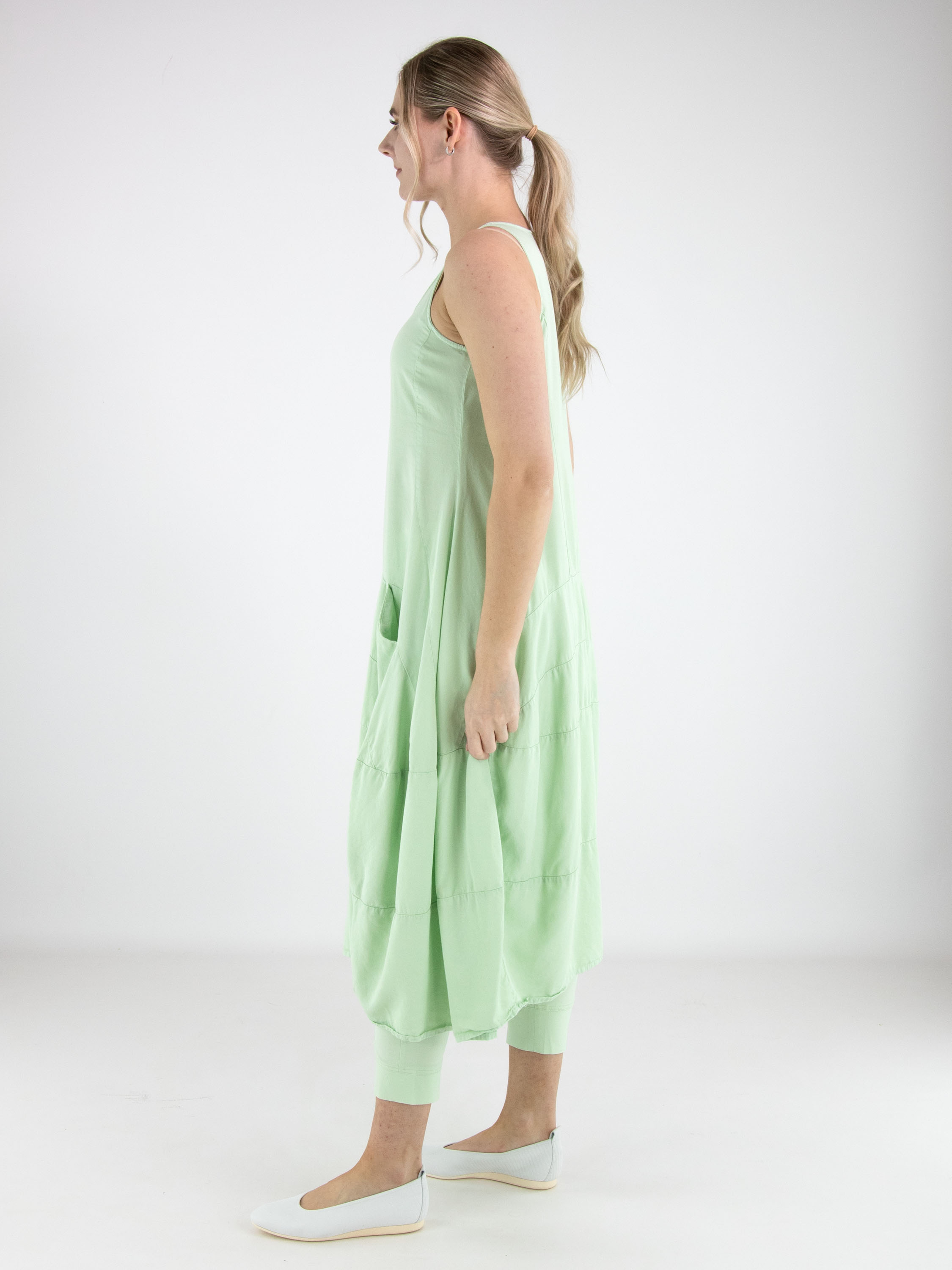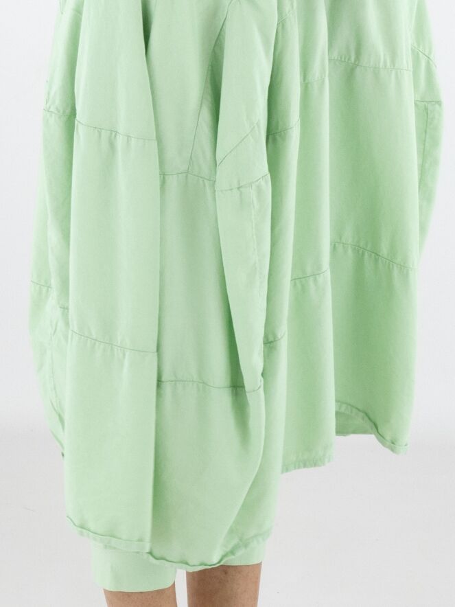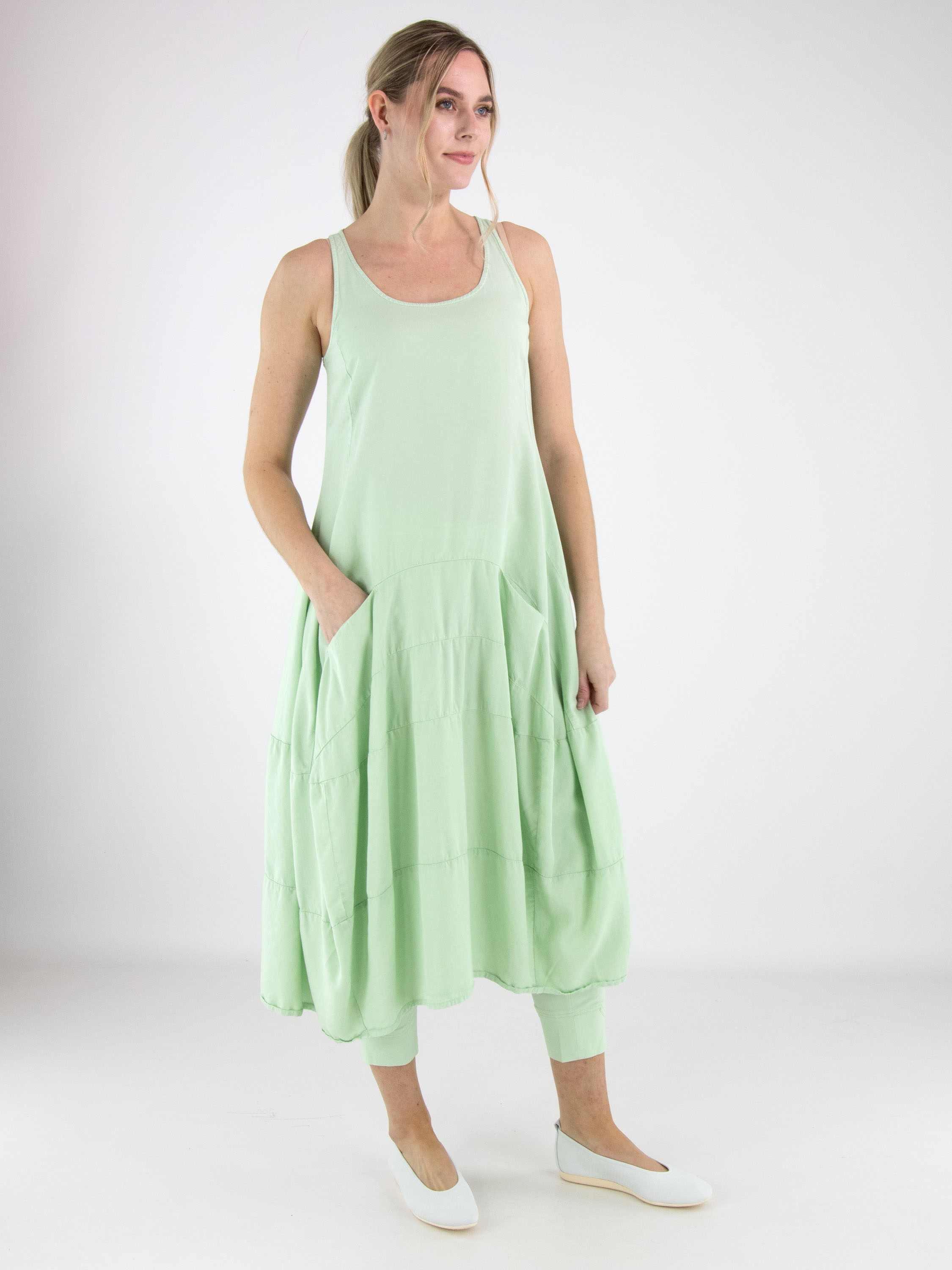 Sleeveless dress by Rundholz Black Label in a fresh pistachio green shade. Designed in a subtle A-line silhouette, multiple horizontal seams from the waist create structure and a gentle balloon shape. Side pockets at waist level add a practical yet contemporary touch. This exclusive designer dress can be washed at 30 degrees.