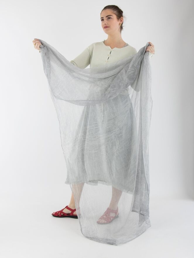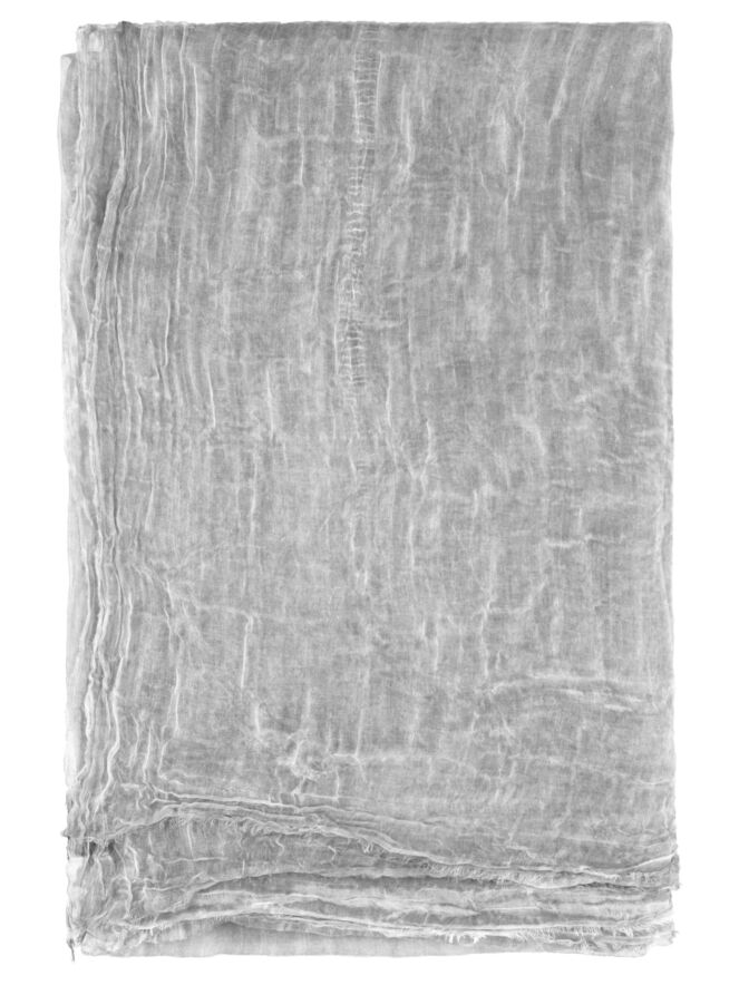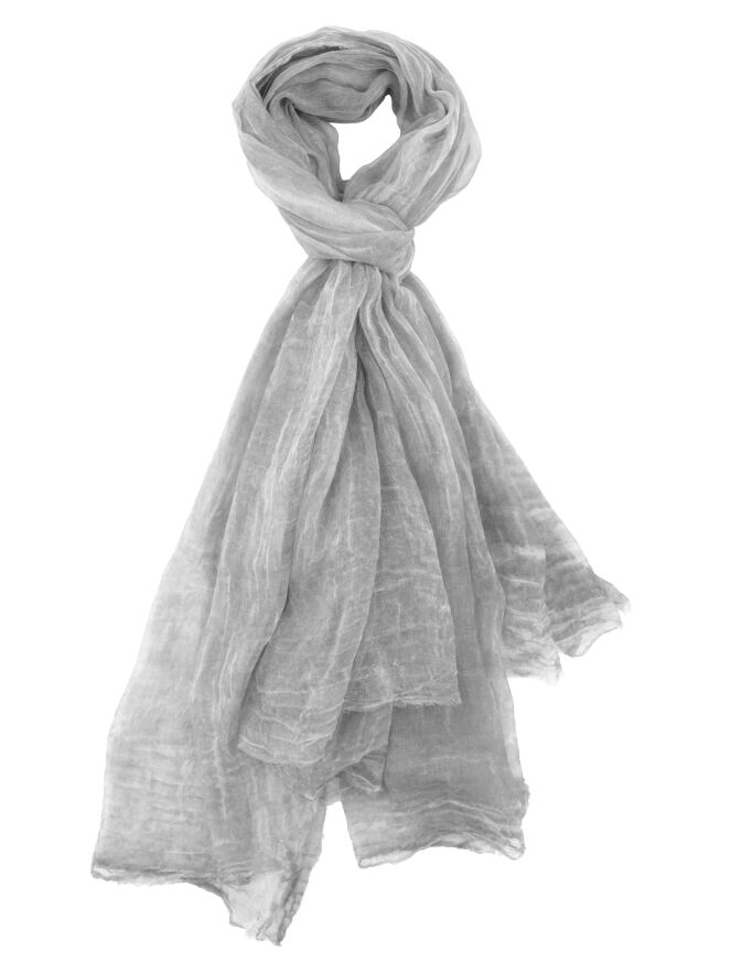 A lightly transparent, melange shawl in various shades of grey. The edges of the shawl are delicately frayed. This shawl should be hand-washed.