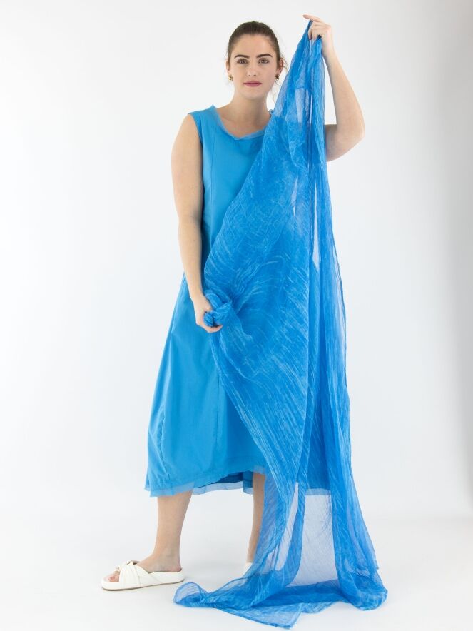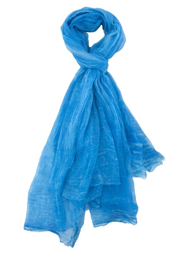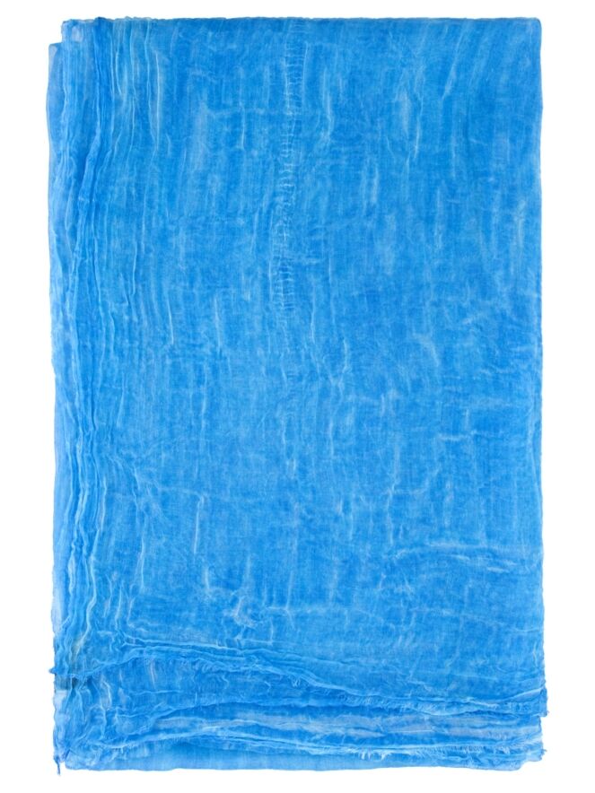 A lightly transparent, marled shawl in various shades of bright blue. The edges of the shawl are delicately frayed. This shawl should be hand-washed.