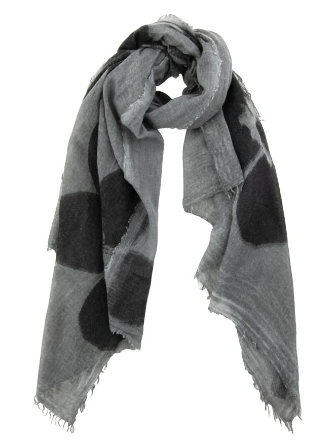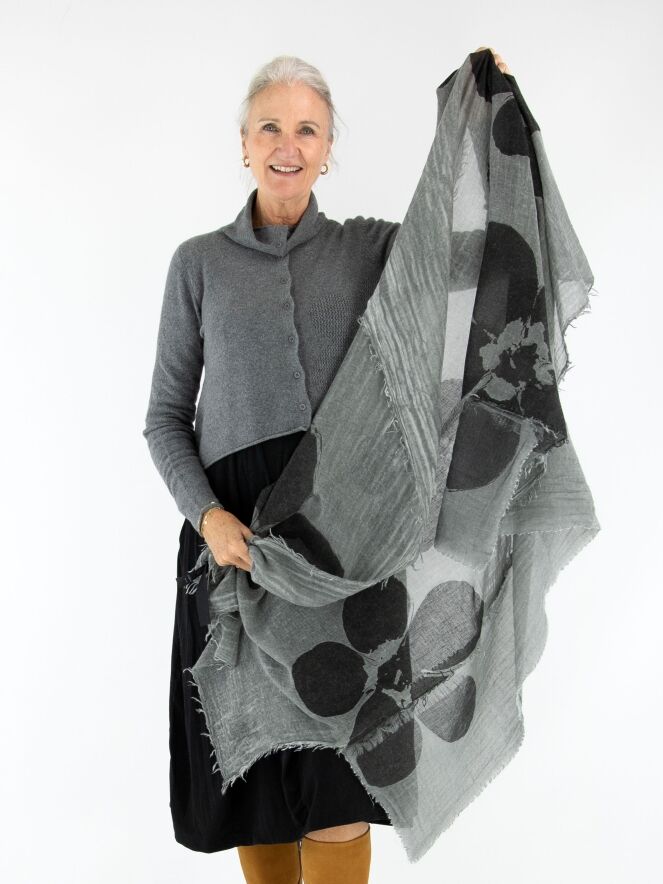 Lightweight transparent shawl by Rundholz Black Label, featuring a striking print of a large black flower on a grey background. The edges are delicately frayed, while two corners are finished with decorative cut-outs, adding a unique and artistic touch. This exclusive women’s accessory can be hand-washed.