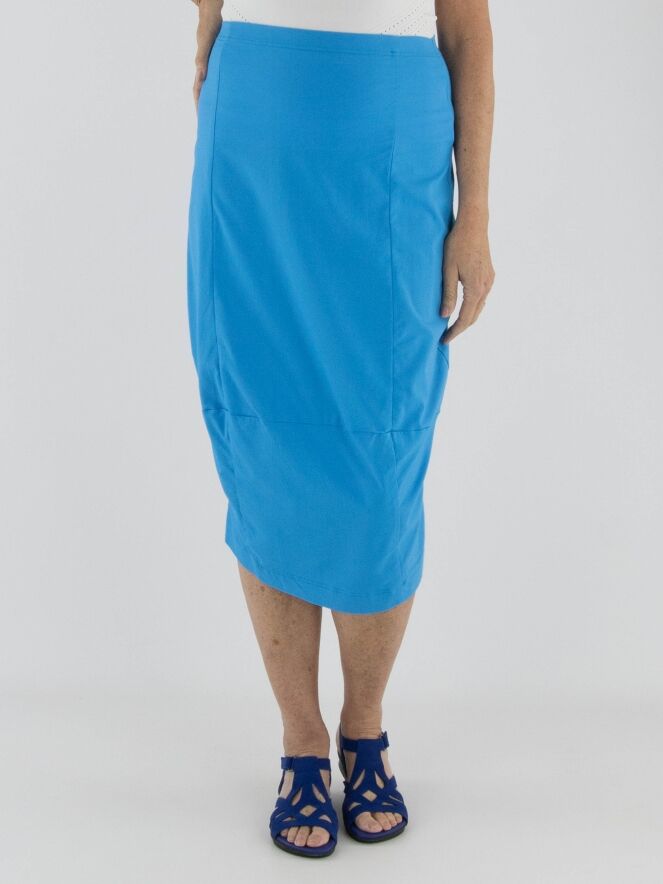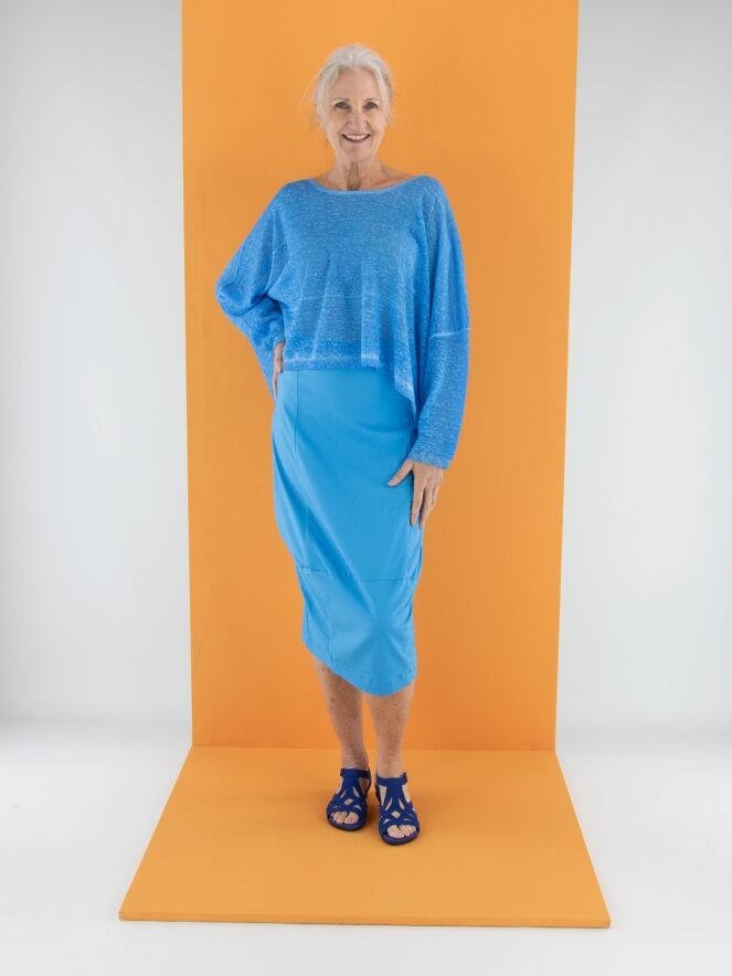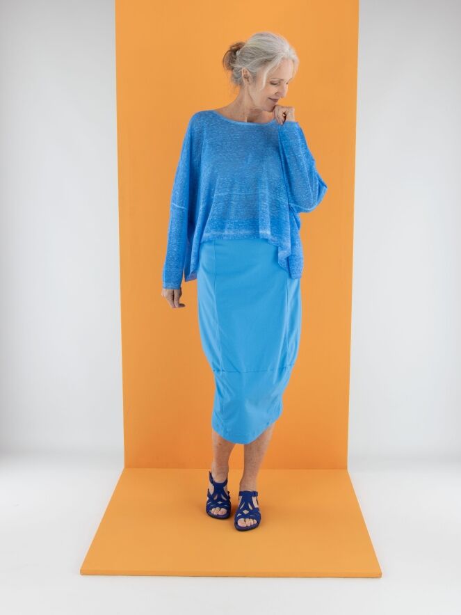 A skirt by Rundholz Black Label in bright blue. The waistband is elastic. The skirt tapers down and is unlined. This skirt can be washed at 30 degrees.