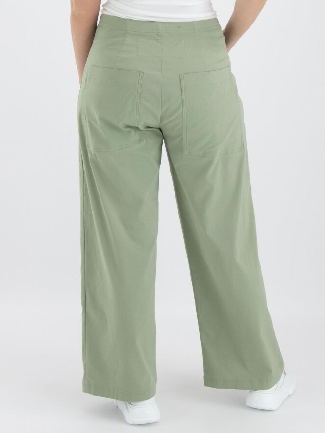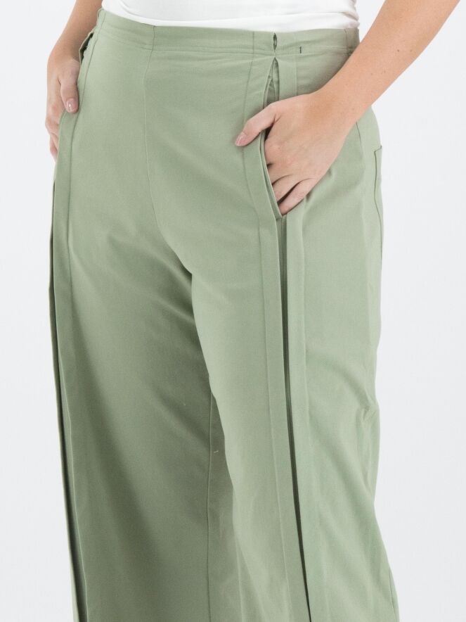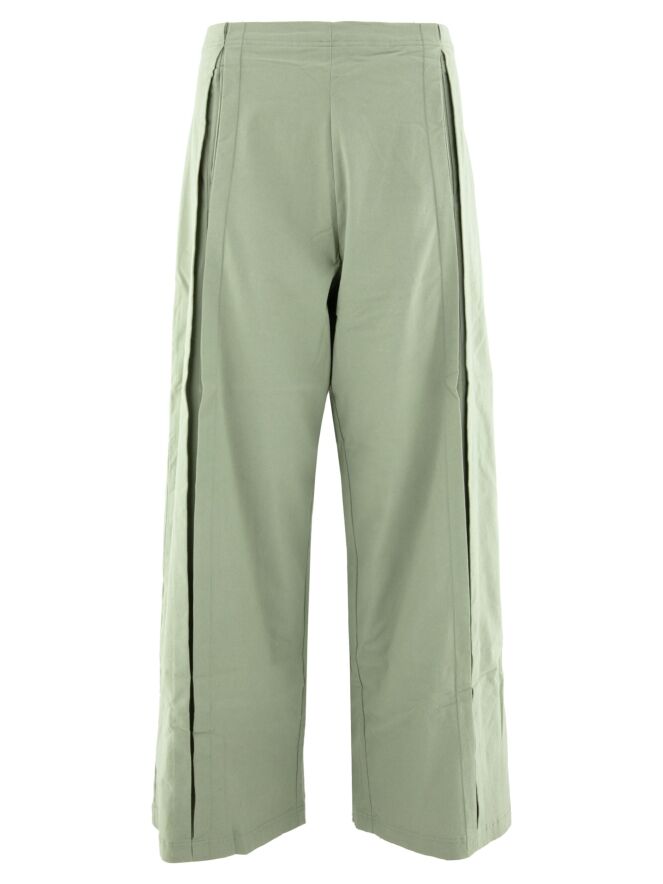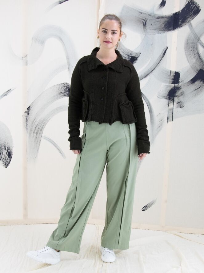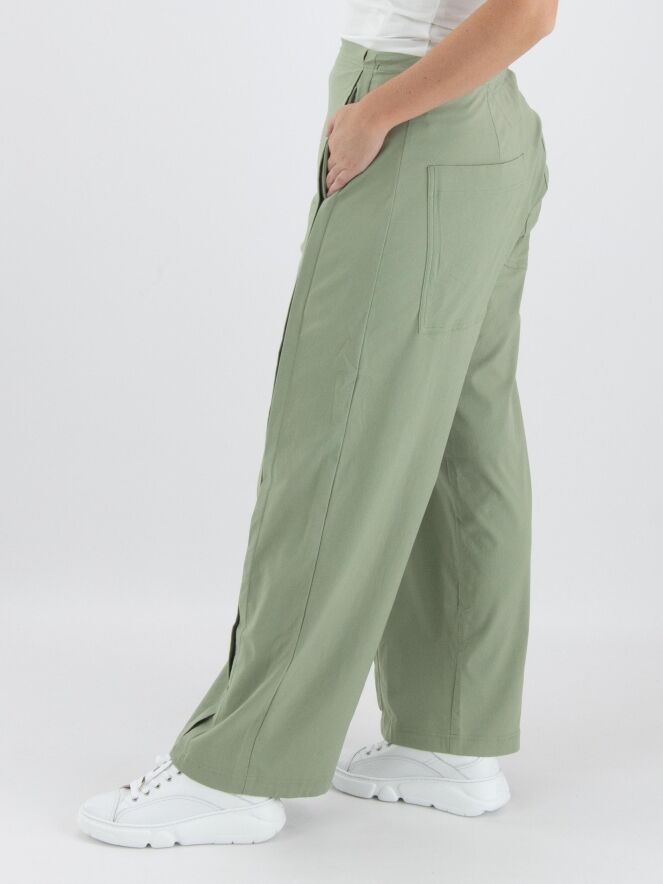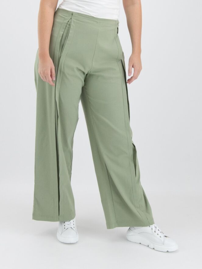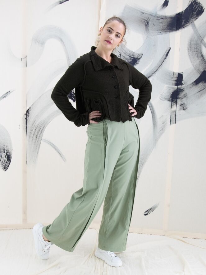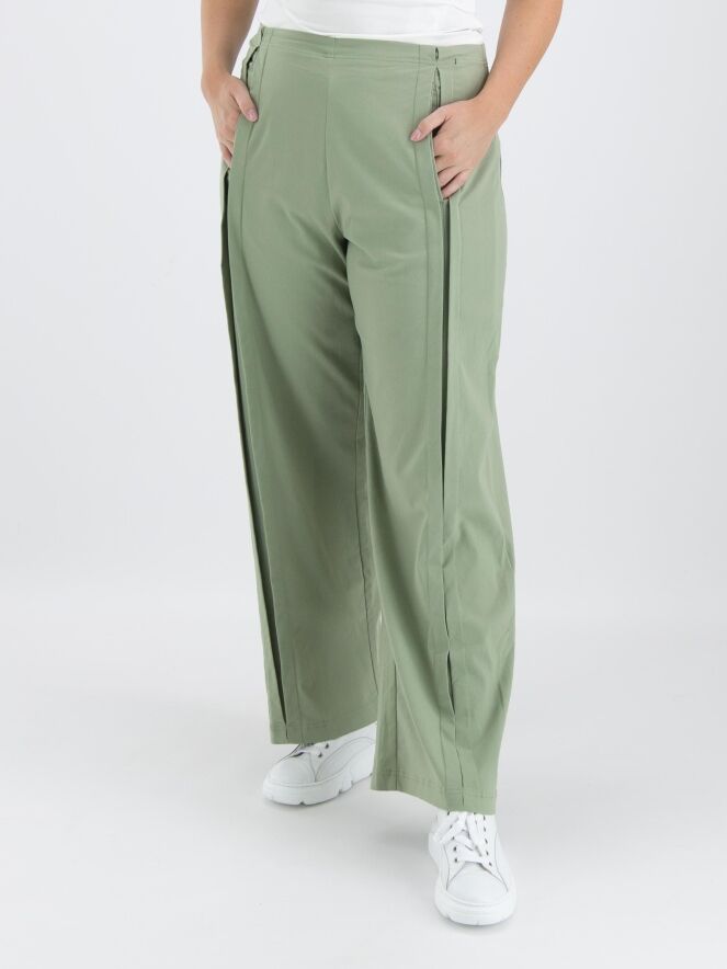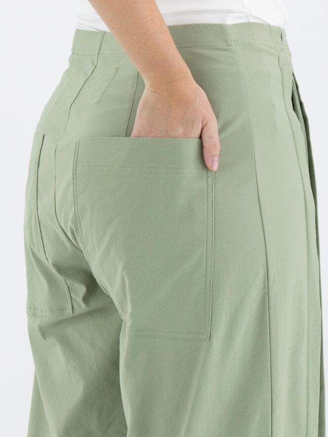 Pants by Rundholz Black Label in a soft olive color. On the front, slightly off-center, there are two vertical inverted pleats that are open, with slit pockets below the waistband. The waistband has an elastic band. At the back, there are large, spacious pockets. These pants can be washed at 30 degrees.