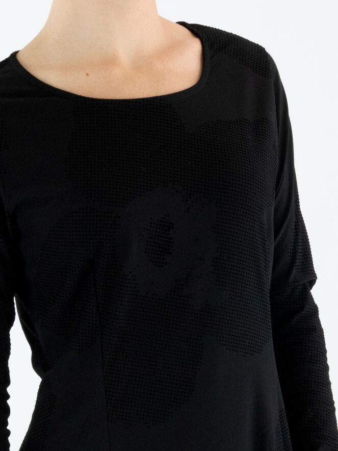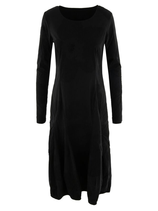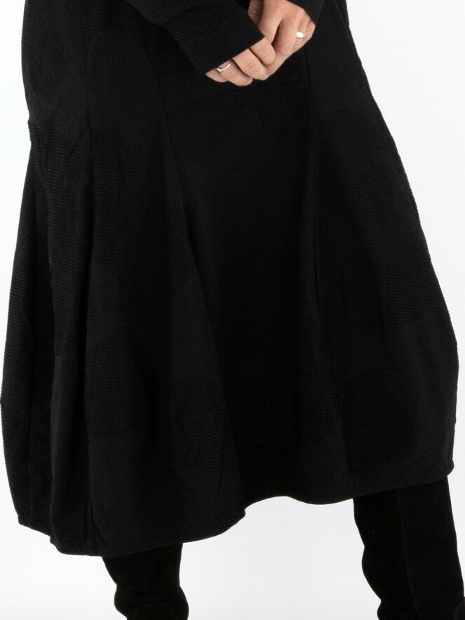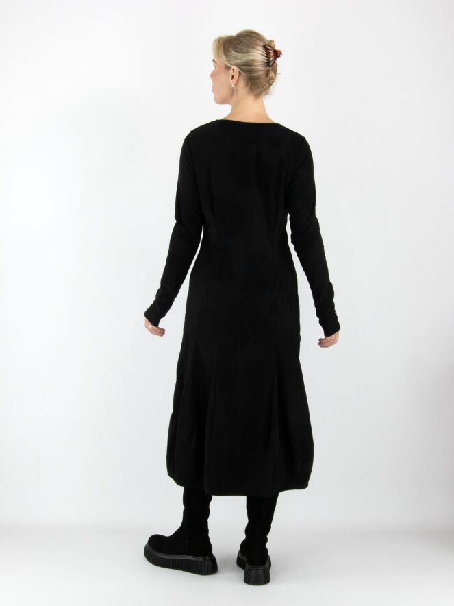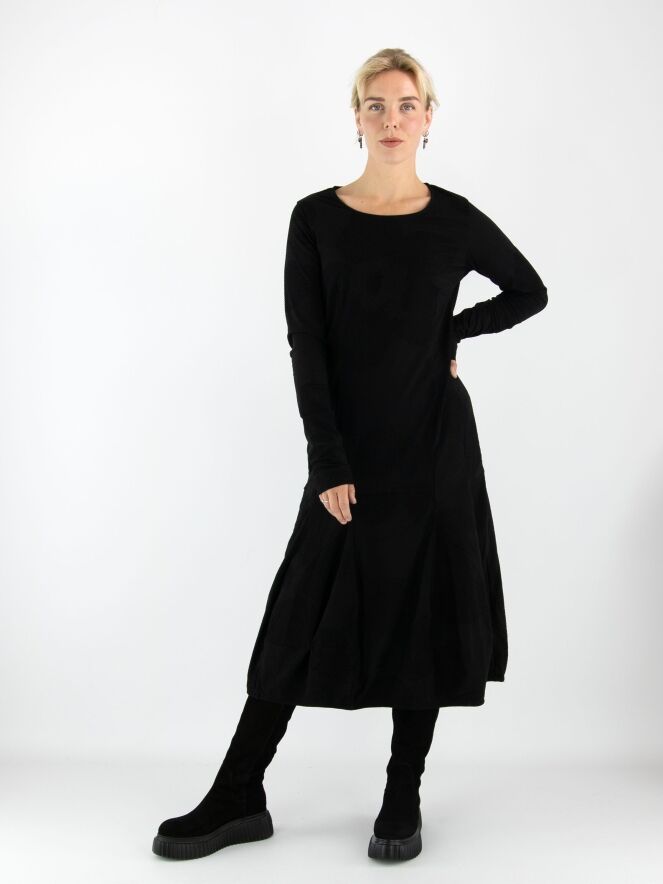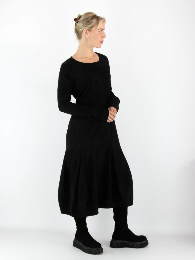 A dress by Rundholz Black Label in black. The fabric features a very fine ribbed texture with delicate velvet dots throughout. The dress has a round neckline and flares into a balloon shape from the waist. This dress is machine washable at 30 degrees.