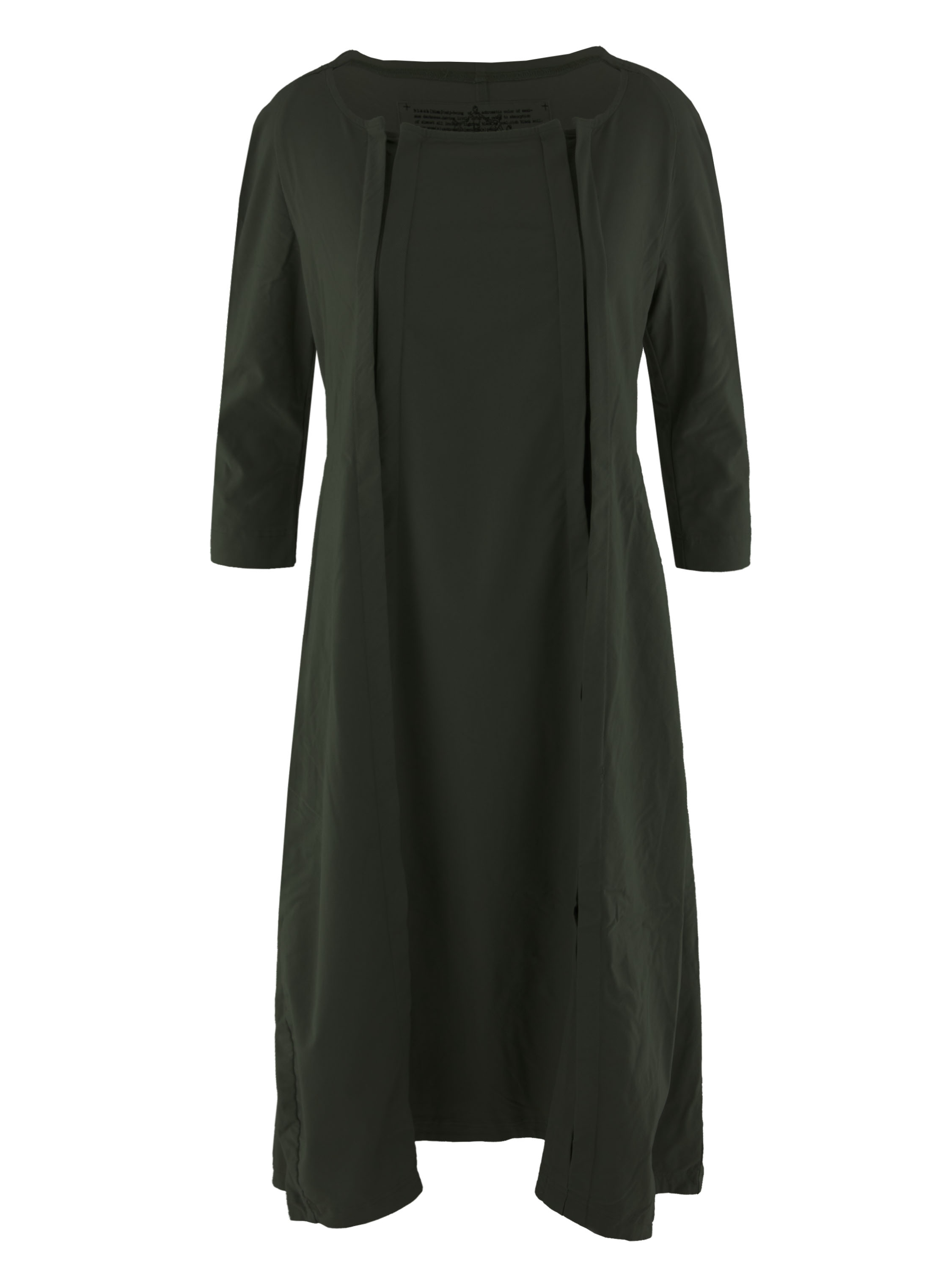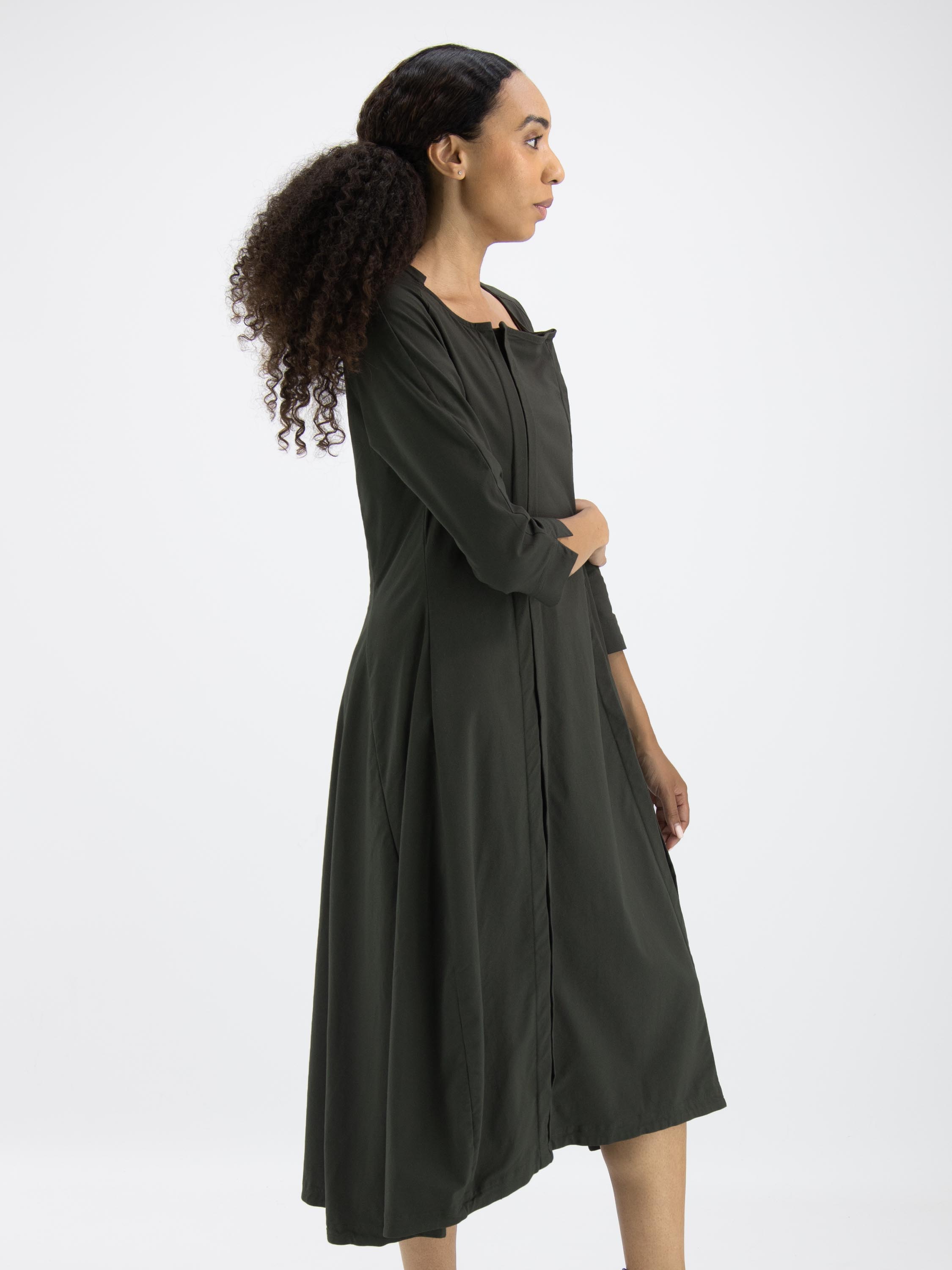 Een jurk van Rundholz Black Label in een khakikleur. Aan de voorzijde zijn twee verticale omgekeerde plooien die openstaan. De jurk heeft een lichte taillelijn en een ballonvorm vanuit de taille. De brede hals heeft vanaf de zijkanten naar de achterzijde een kleine verhoging. Aan het uiteinde van de halflange mouwen is een kort splitje. Deze jurk mag op 30 graden worden gewassen.