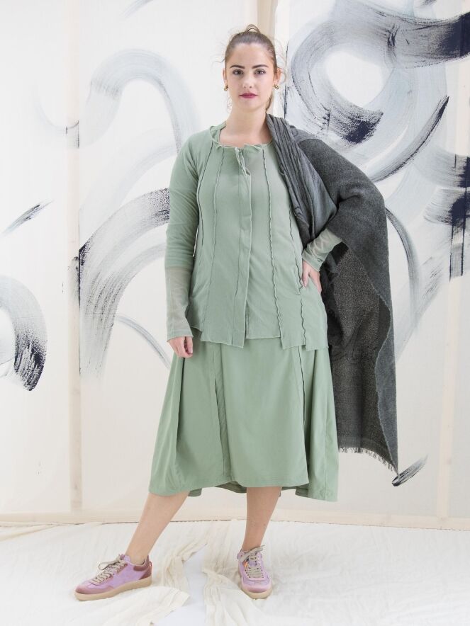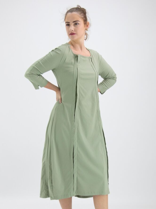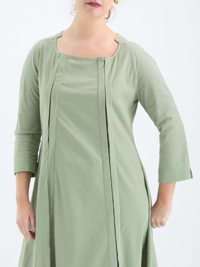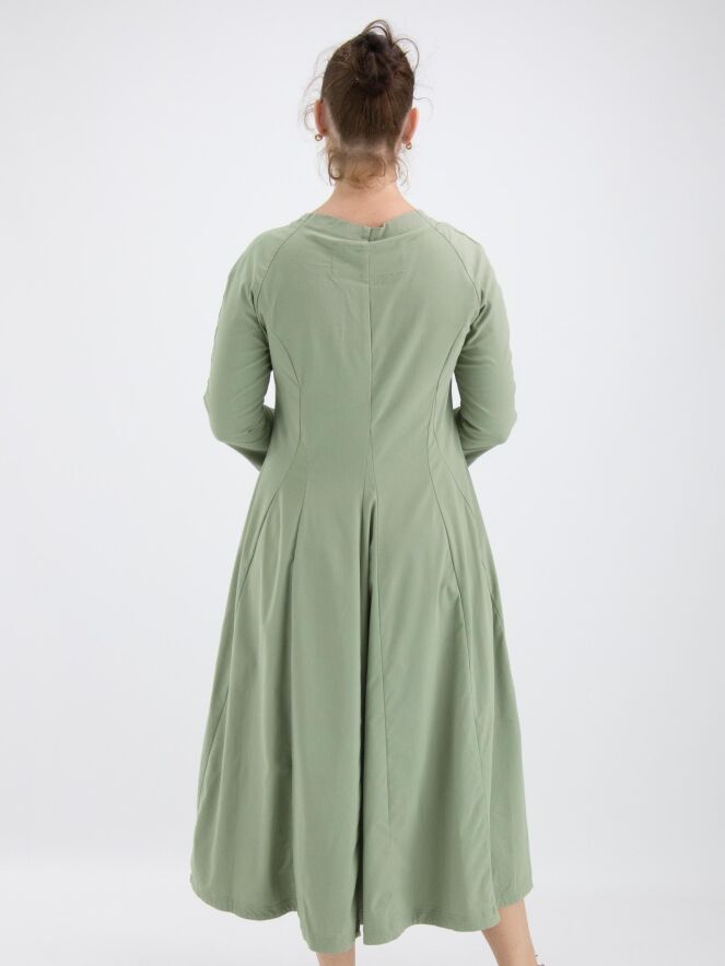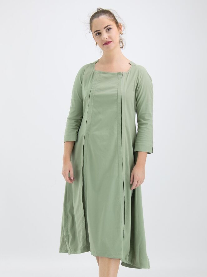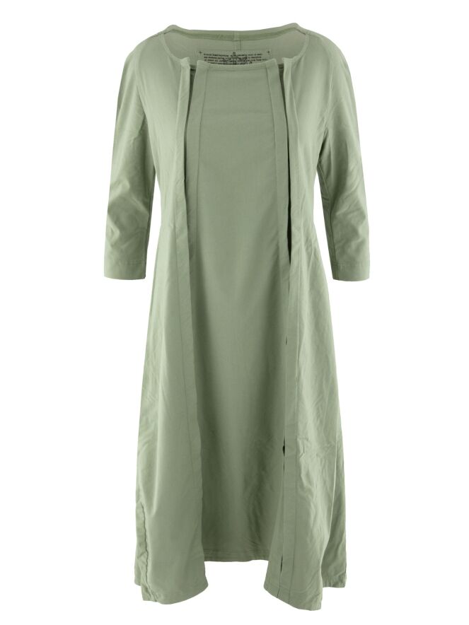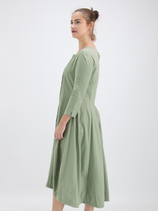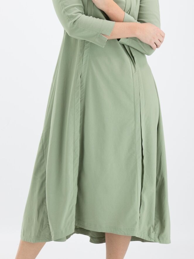 A dress by Rundholz Black Label in a soft olive color. On the front, there are two vertical inverted pleats that are open. The dress has a slight waistline and a balloon shape from the waist down. The wide neckline has a small elevation from the sides to the back. At the ends of the half-length sleeves, there is a small slit. This dress can be washed at 30 degrees.
