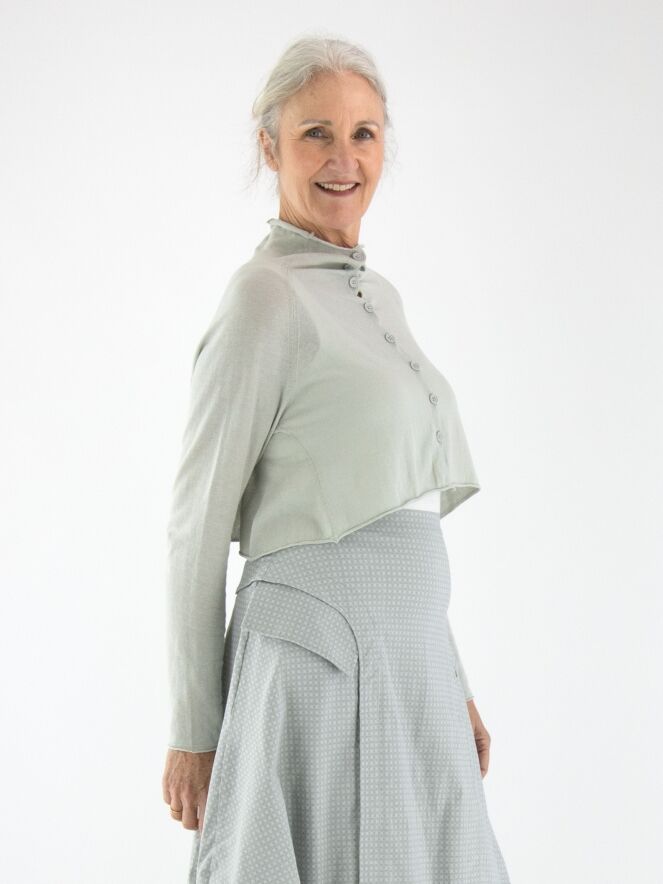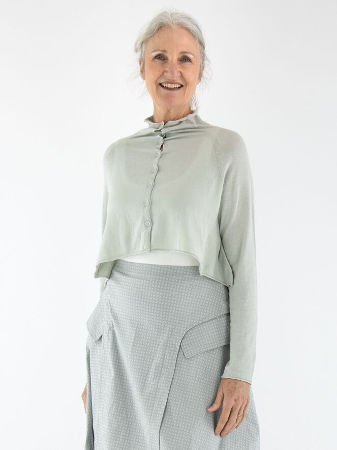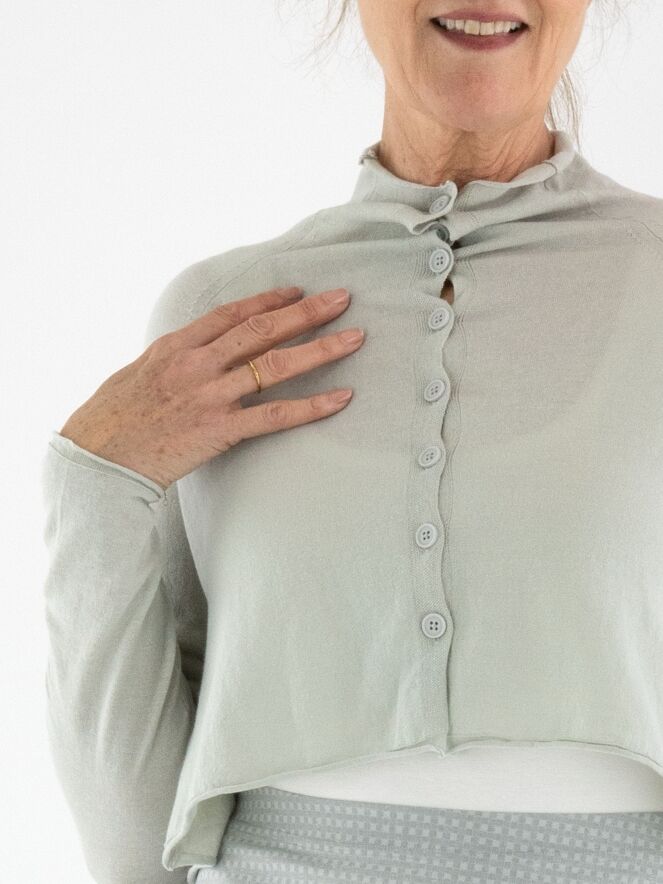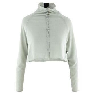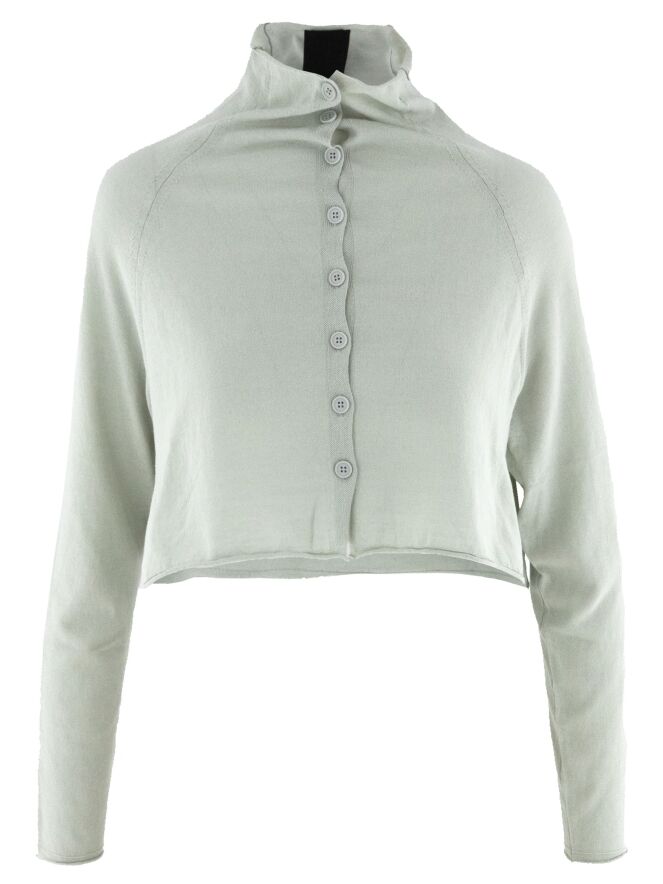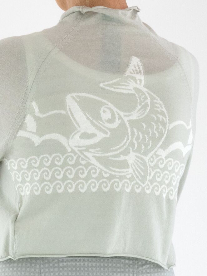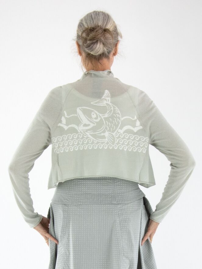 A short cardigan by Rundholz Black Label in light grey. The cardigan features a turtleneck collar. On the back, there is a woven white print of a fish in the waves. This cardigan should be hand-washed.