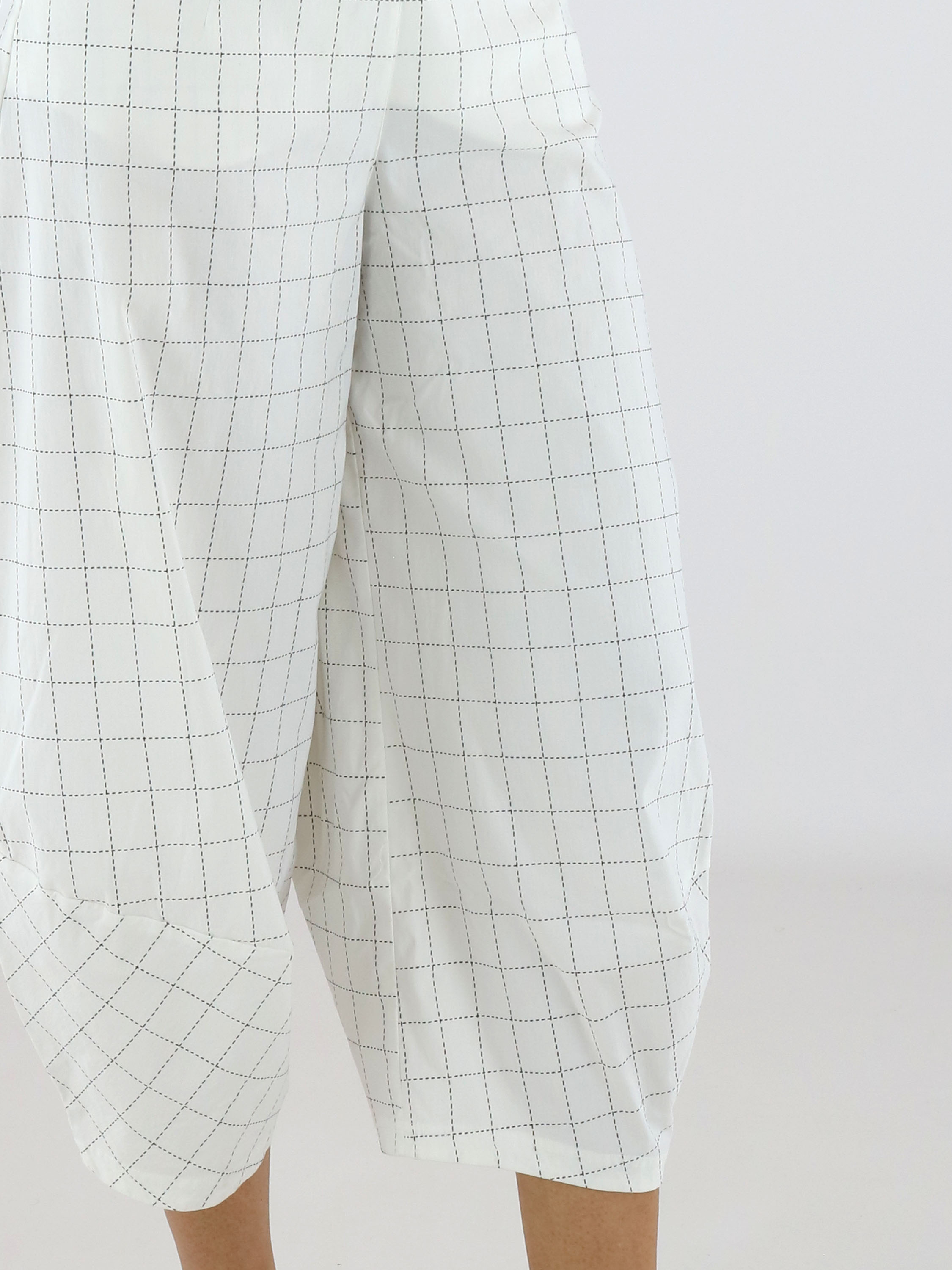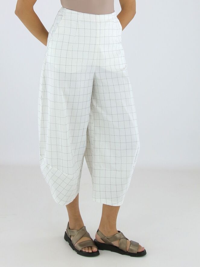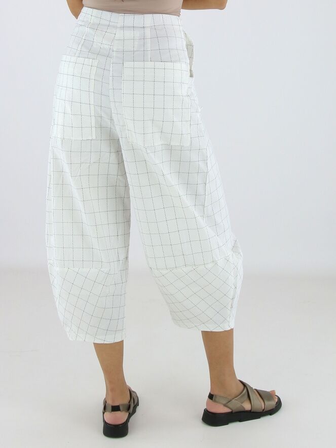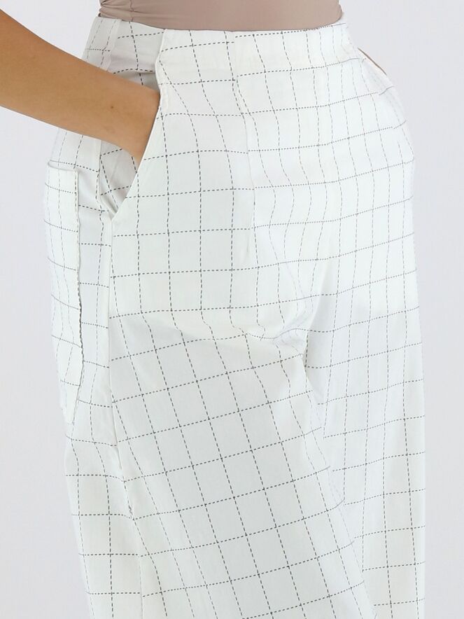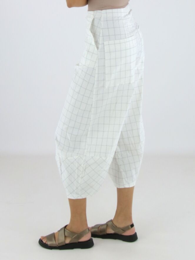 Trousers by Rundholz Black Label featuring a striped block pattern with black lines on a white background. The front is designed with large, spacious pockets that add a distinctive and contemporary character. The legs taper slightly towards the hem. These trousers can be washed at 30 degrees.