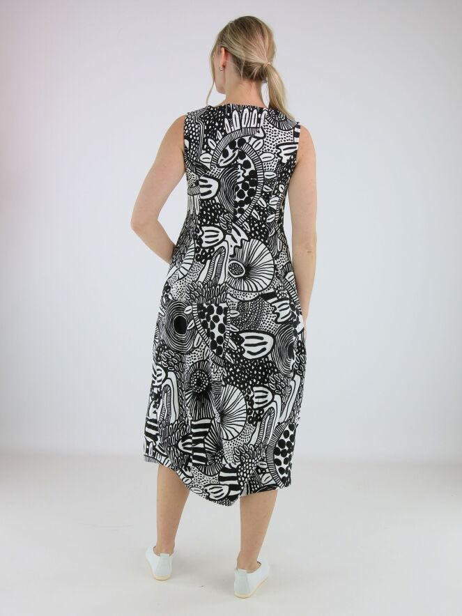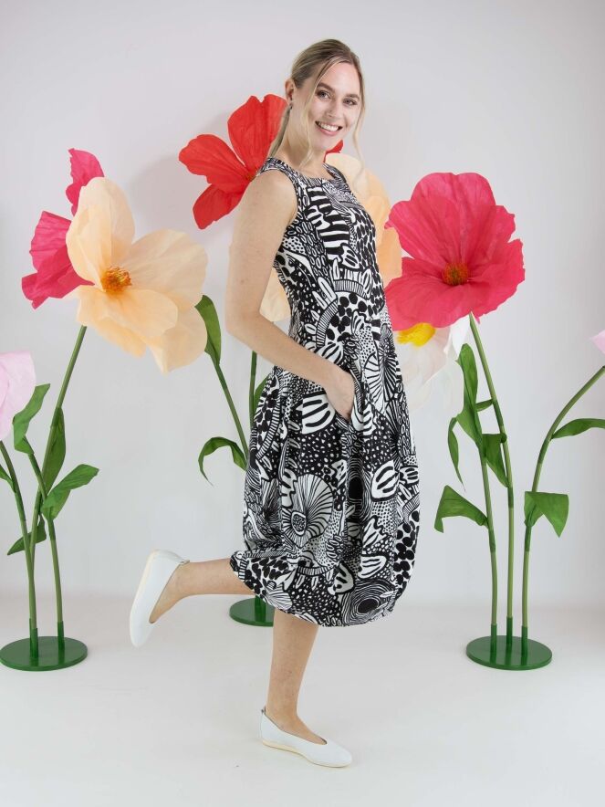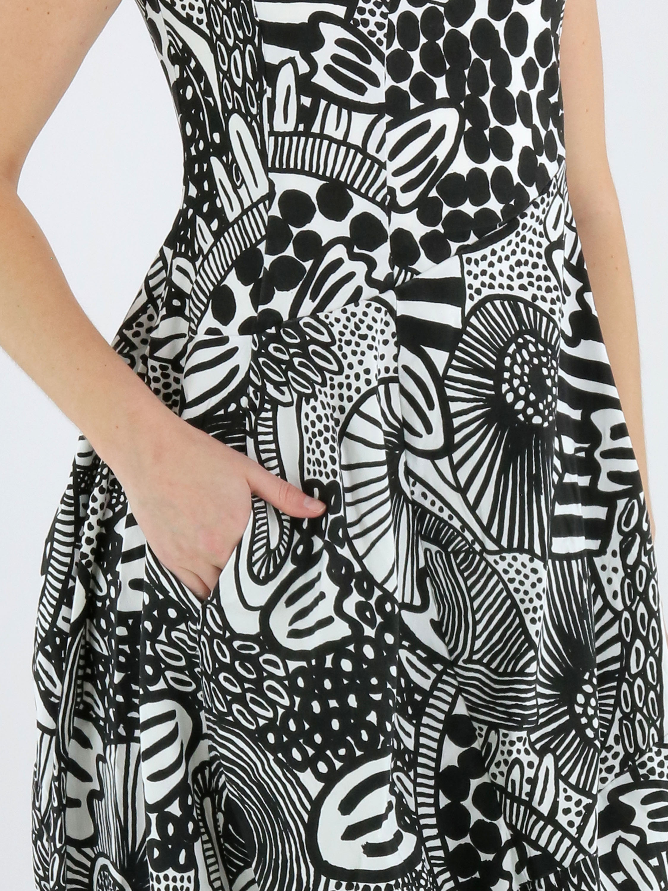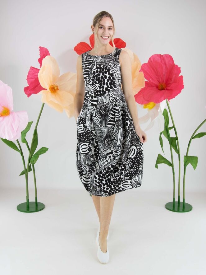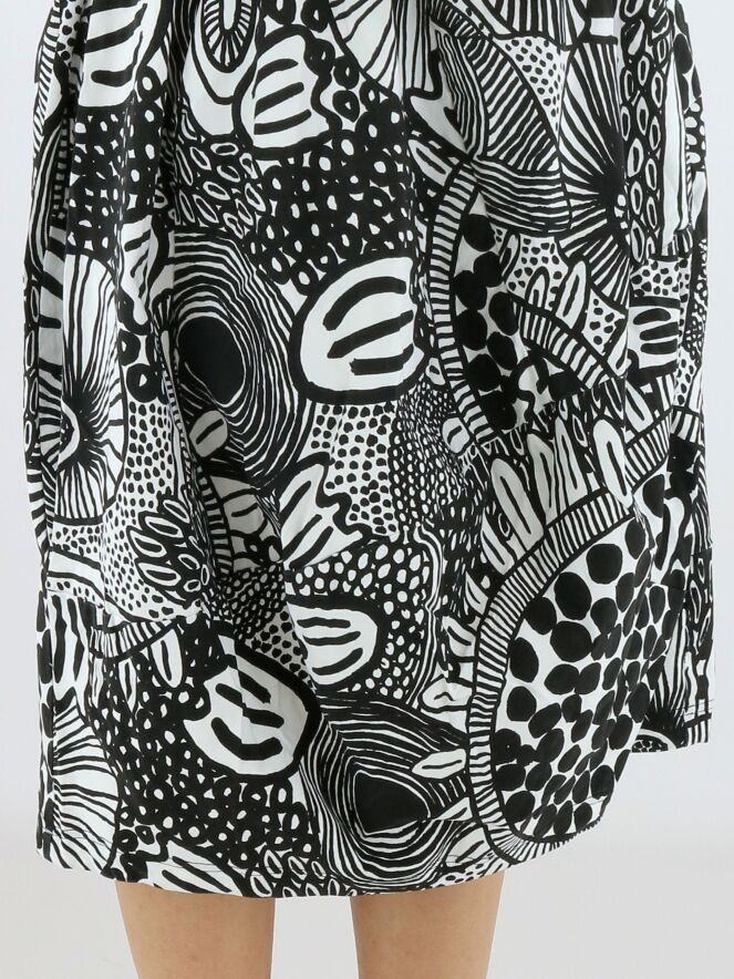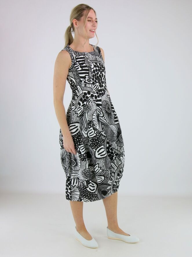 Dress by Rundholz Black Label featuring a graphic black and white pattern. Designed with a round neckline, the silhouette develops into a subtle balloon shape from the waist, creating a contemporary and playful look. Side pockets are placed at waist level. This dress can be washed at 30 degrees.
