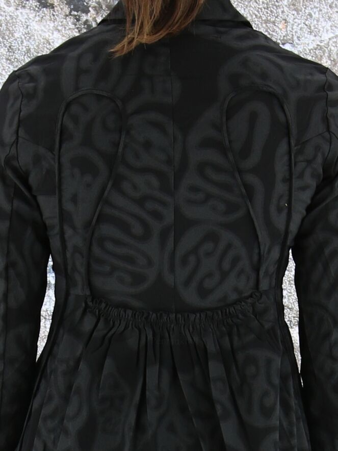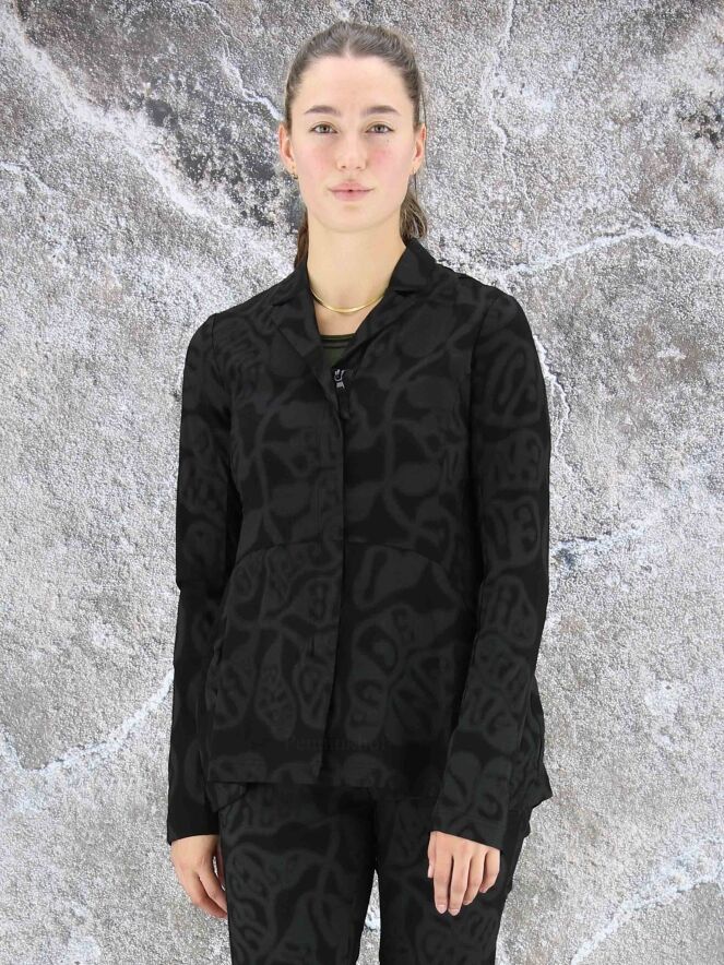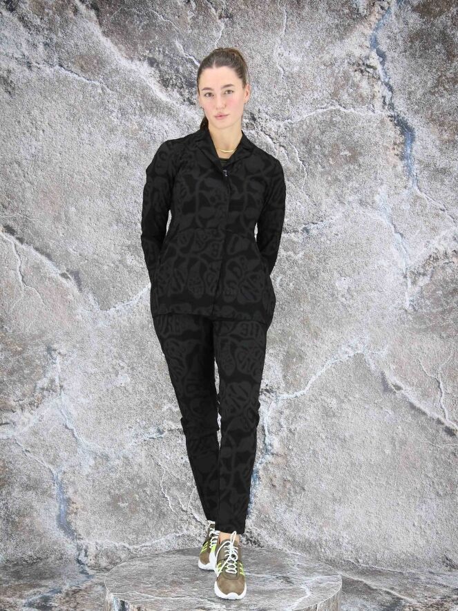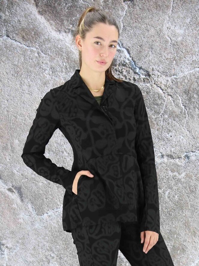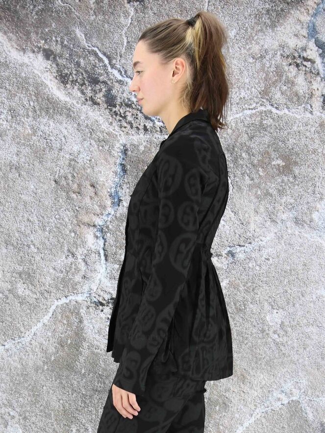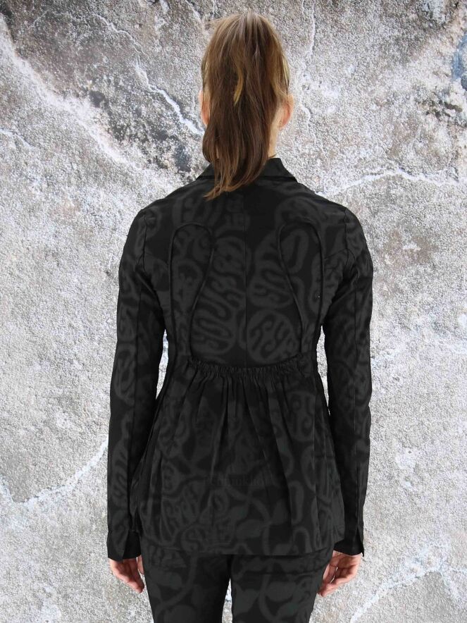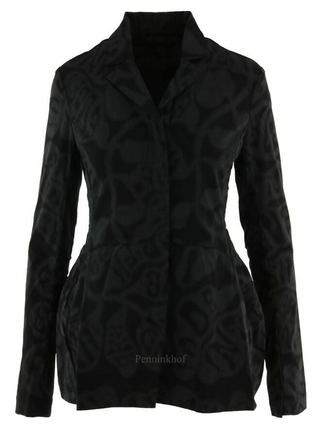 A blazer by Rundholz black label in a baroque print with the colors gray and black. In the waist at the back is a finely pleated elastic band. The blazer has a hidden zipper. This blazer can be washed at 30 degrees.