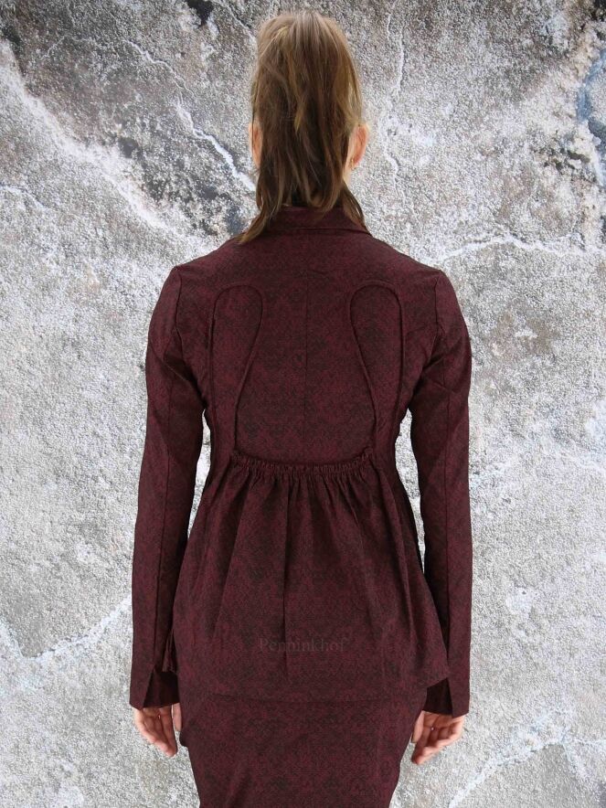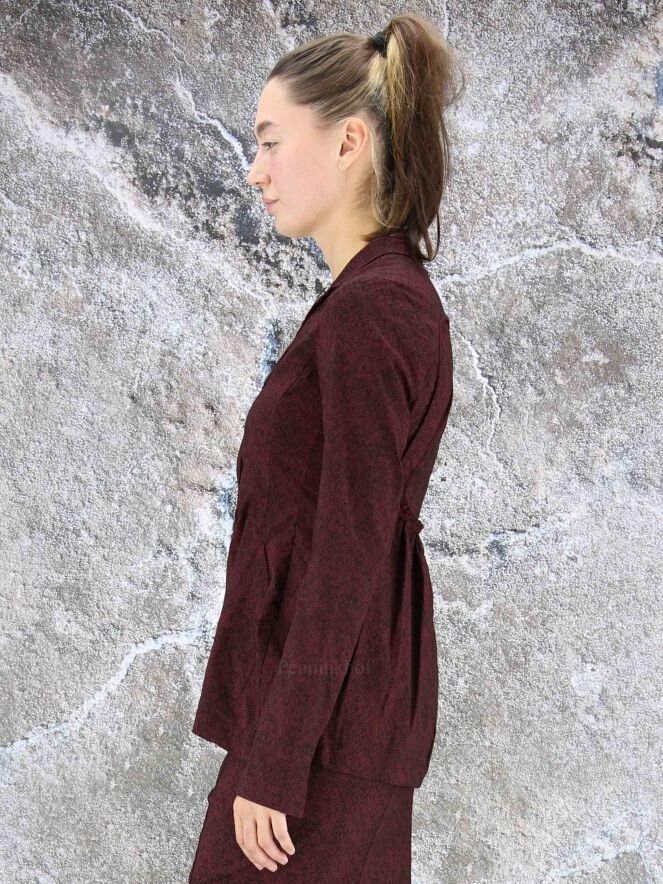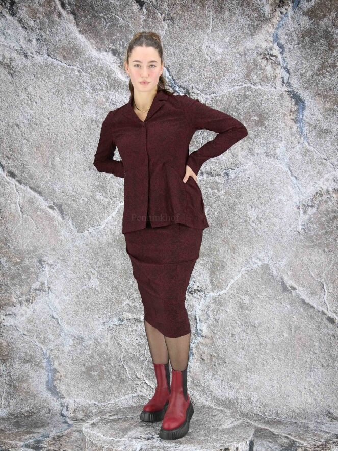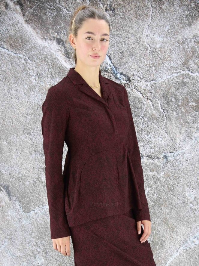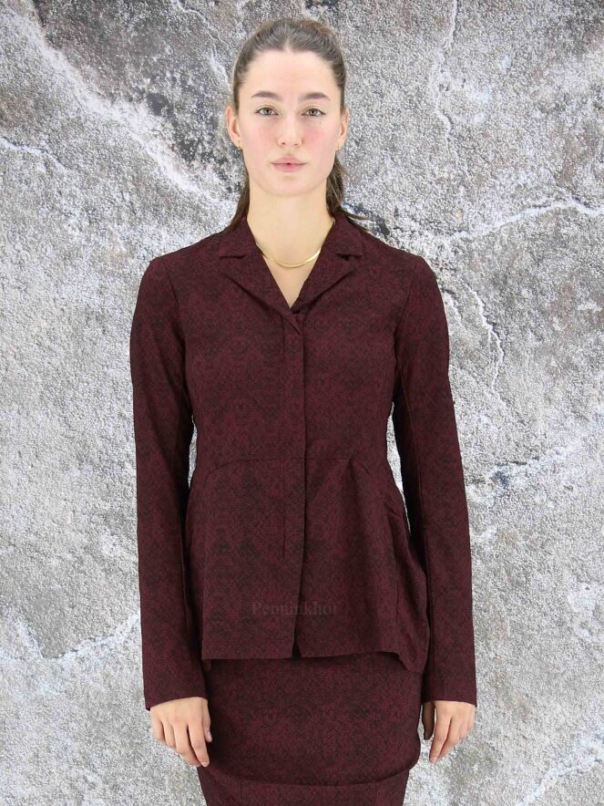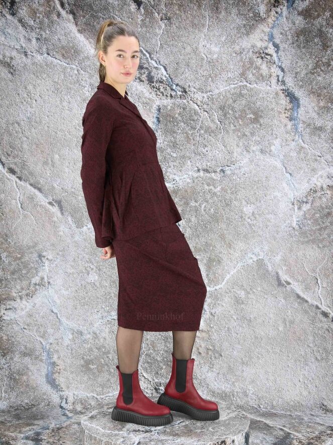 A blazer by Rundholz black label in a print with the colors bordeaux red and black. In the waist at the back is a finely pleated elastic band. The blazer has a hidden zipper. This blazer can be washed at 30 degrees.