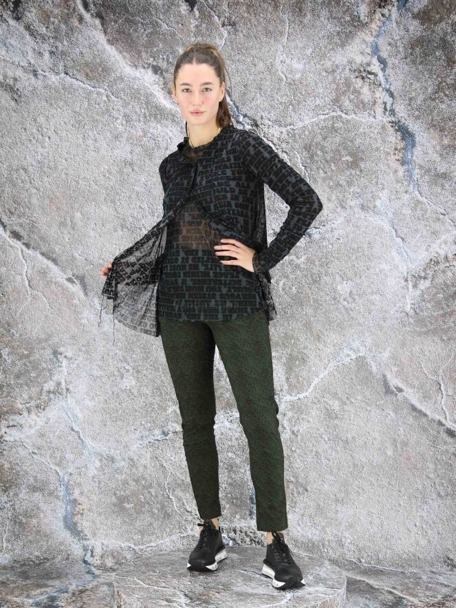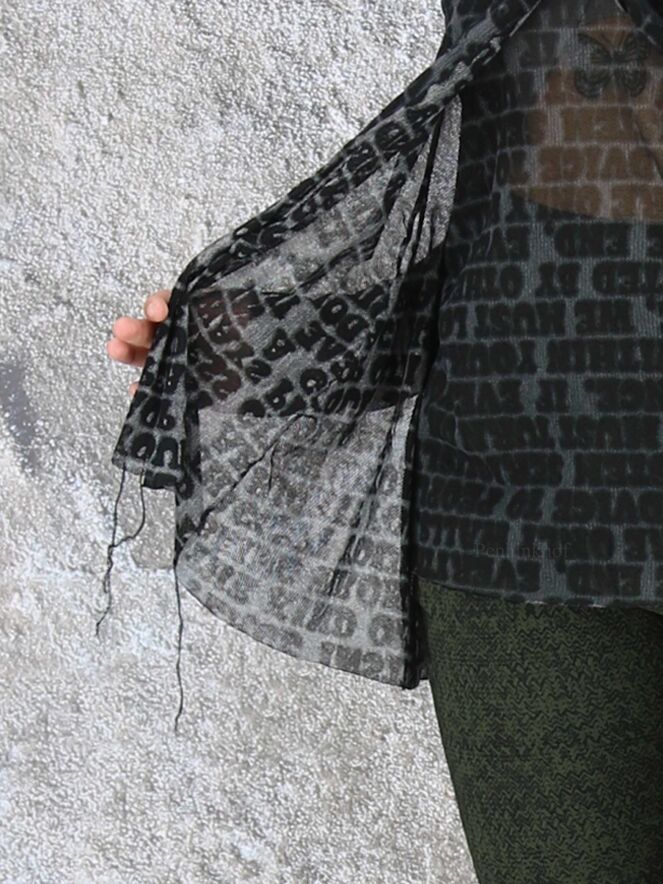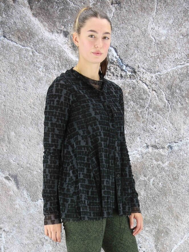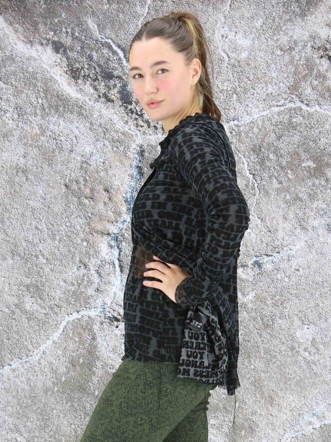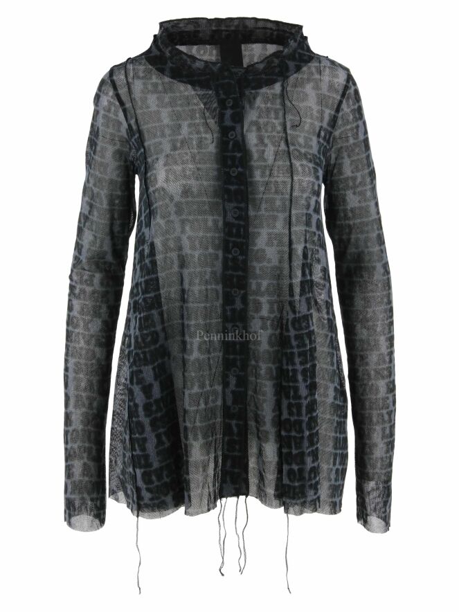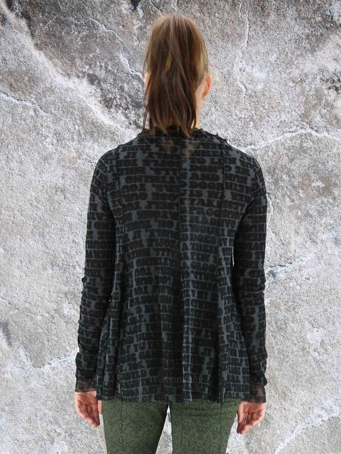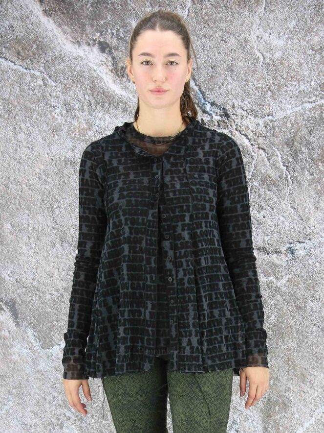 A transparent cardigan by Rundholz black label in a letter print with the colors petrol blue, black and grey. The shirt has a round neckline with a double fabric trim and long sleeves. The vest has an A-Line and can be washed at 30 degrees.