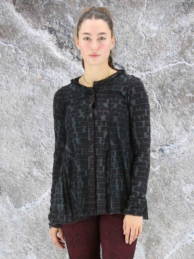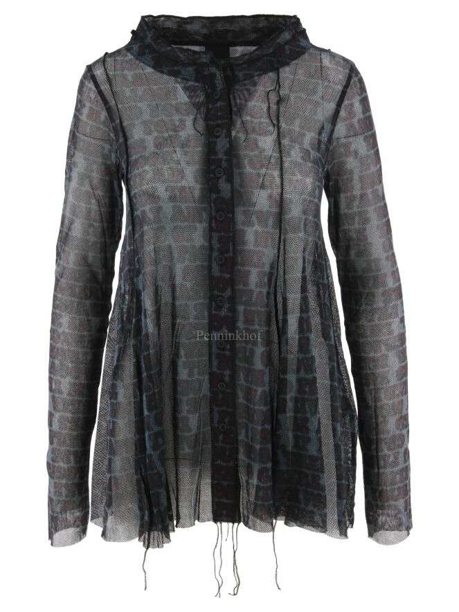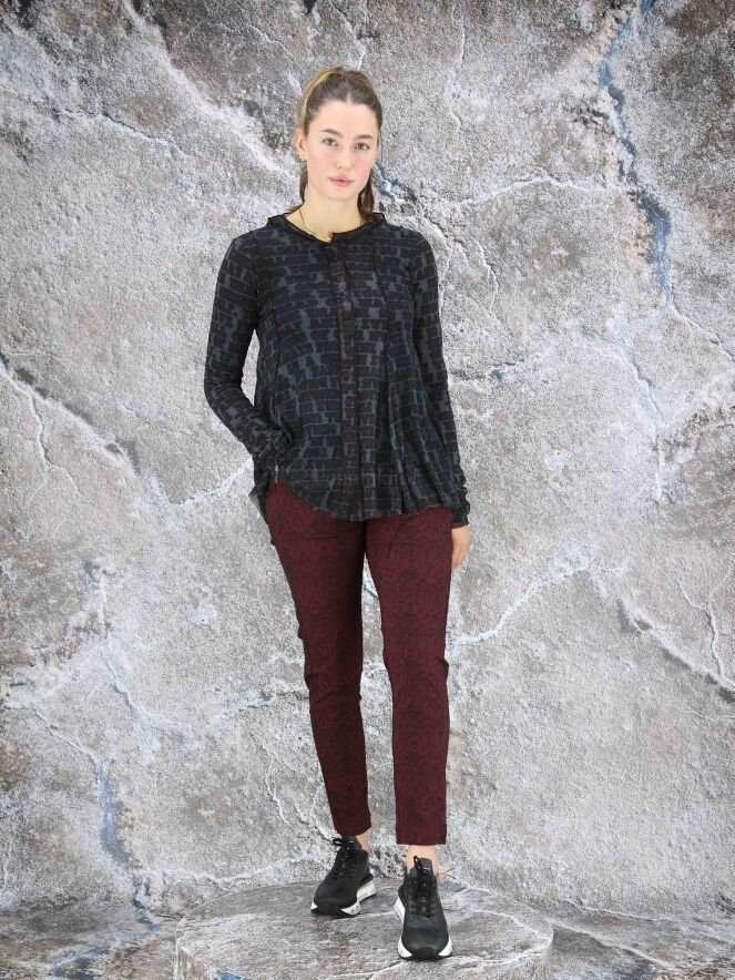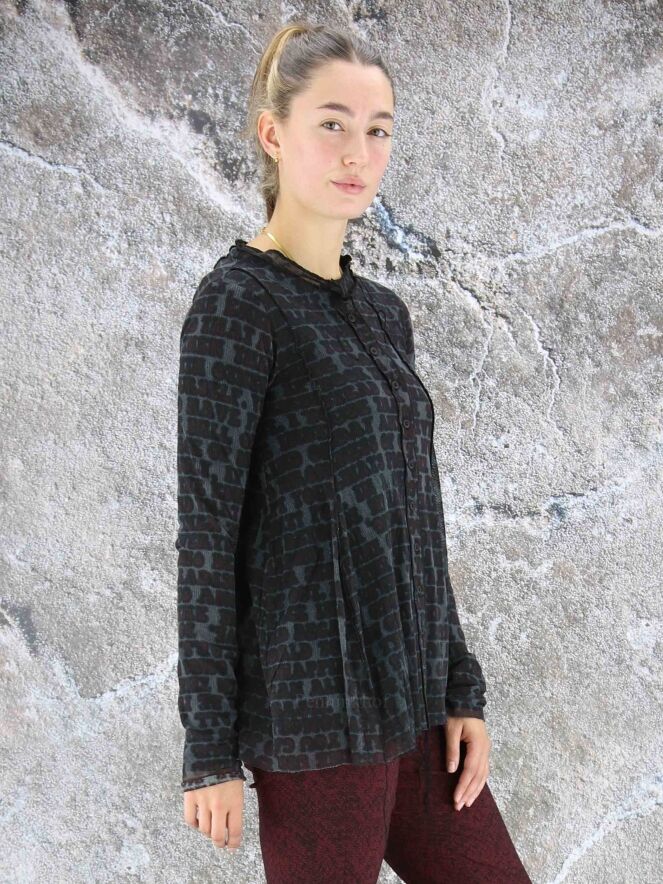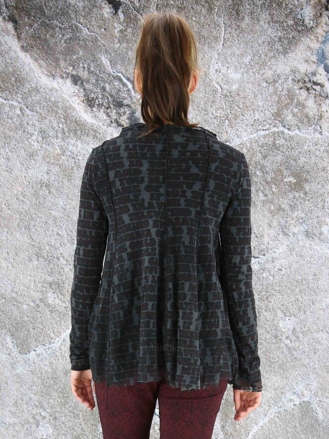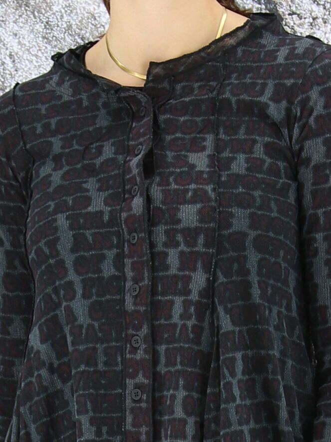 A transparent cardigan by Rundholz black label in a letter print with the colors burgundy red, black and grey. The shirt has a round neckline with a double fabric trim and long sleeves. The vest has an A-Line and can be washed at 30 degrees.
