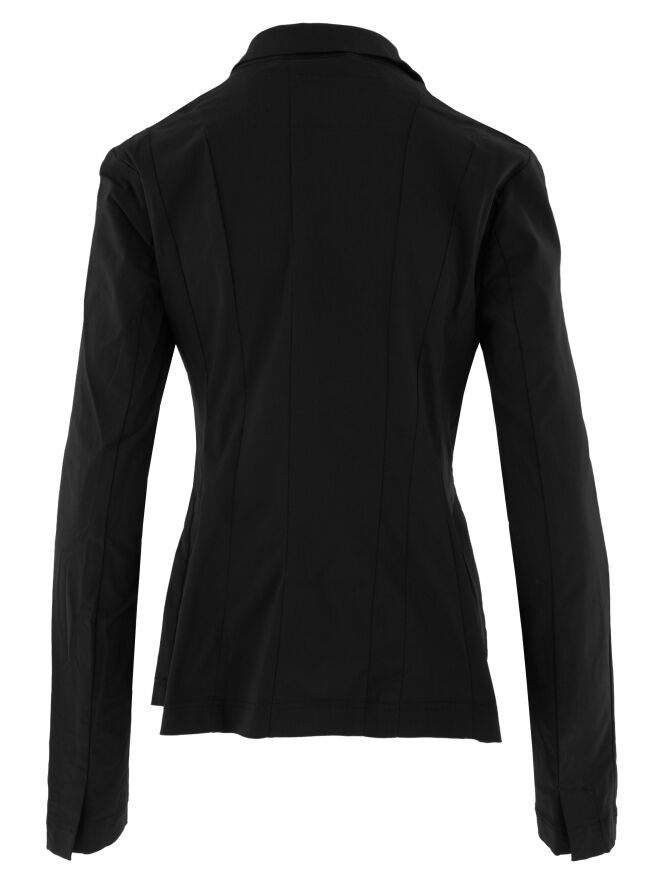 A blazer by Rundholz Black Label in black. The blazer features a hidden closure with 5 buttons and is unlined. Multiple seams from the shoulders accentuate a slight waistline. The long sleeves have the same decorative seams. This blazer can be washed at 30 degrees.
