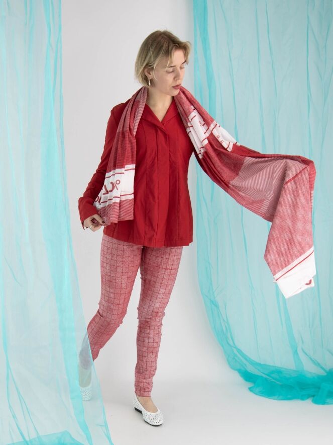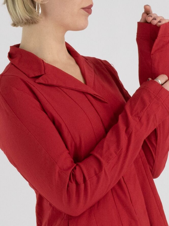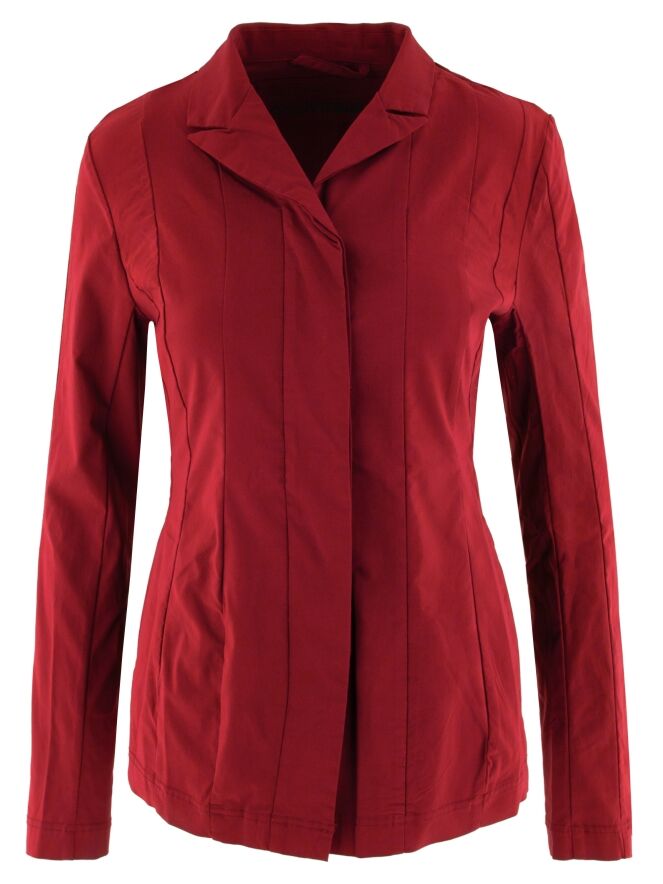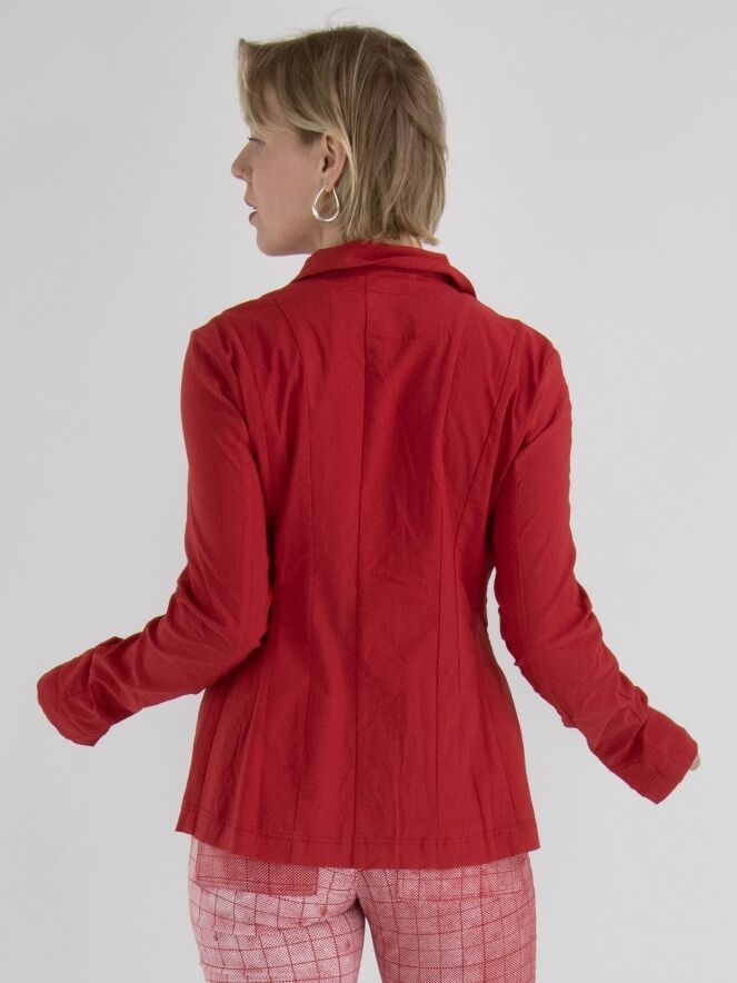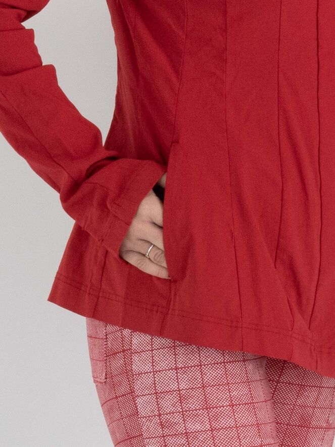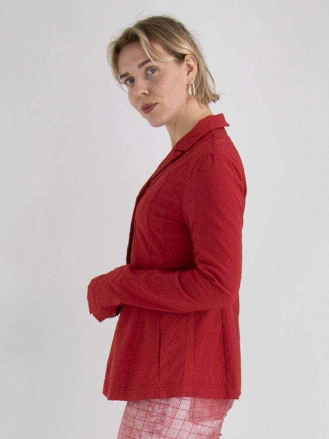 A blazer by Rundholz Black Label in red. The blazer features a hidden closure with 5 buttons and is unlined. Multiple seams from the shoulders accentuate a slight waistline. The long sleeves have the same decorative seams. This blazer can be washed at 30 degrees.