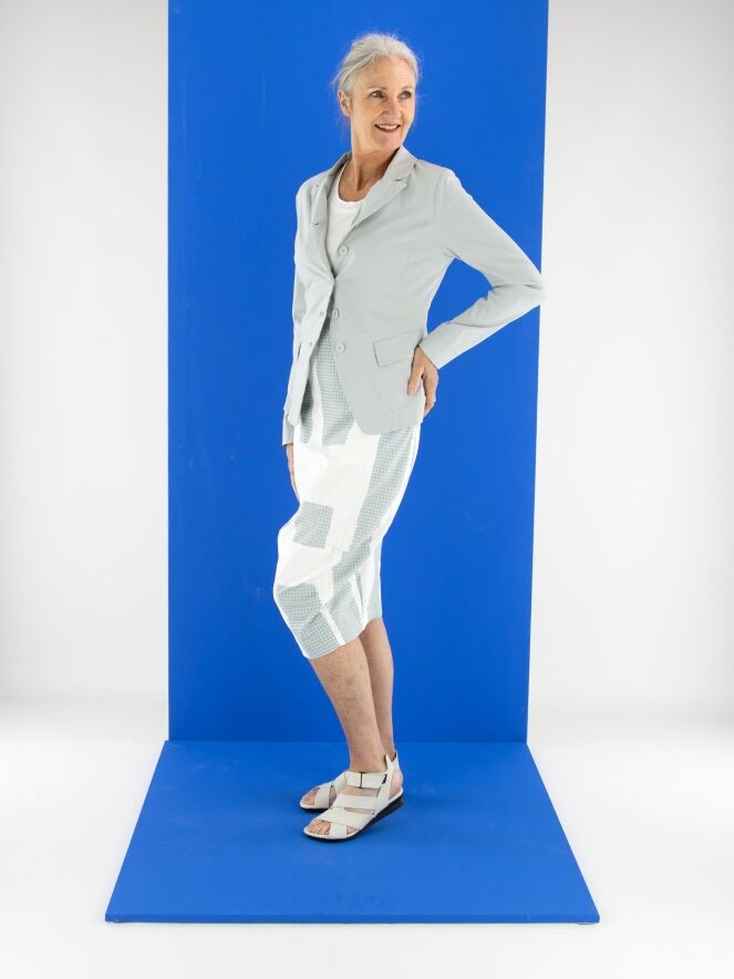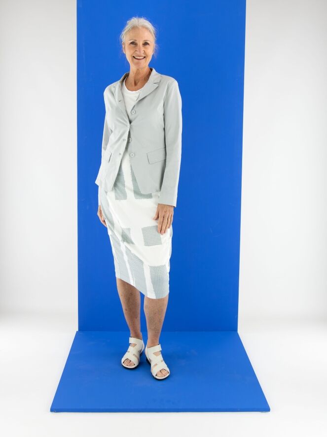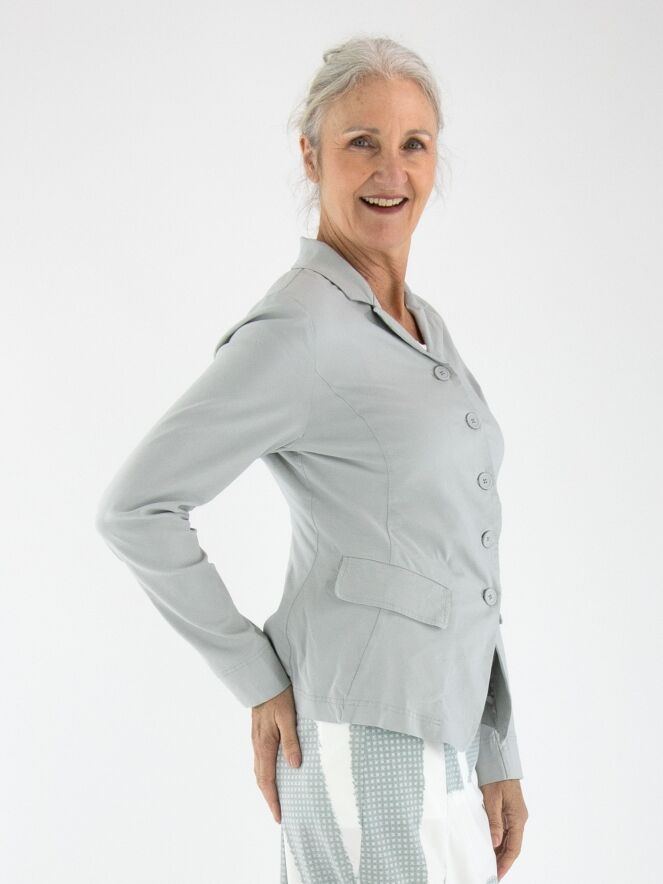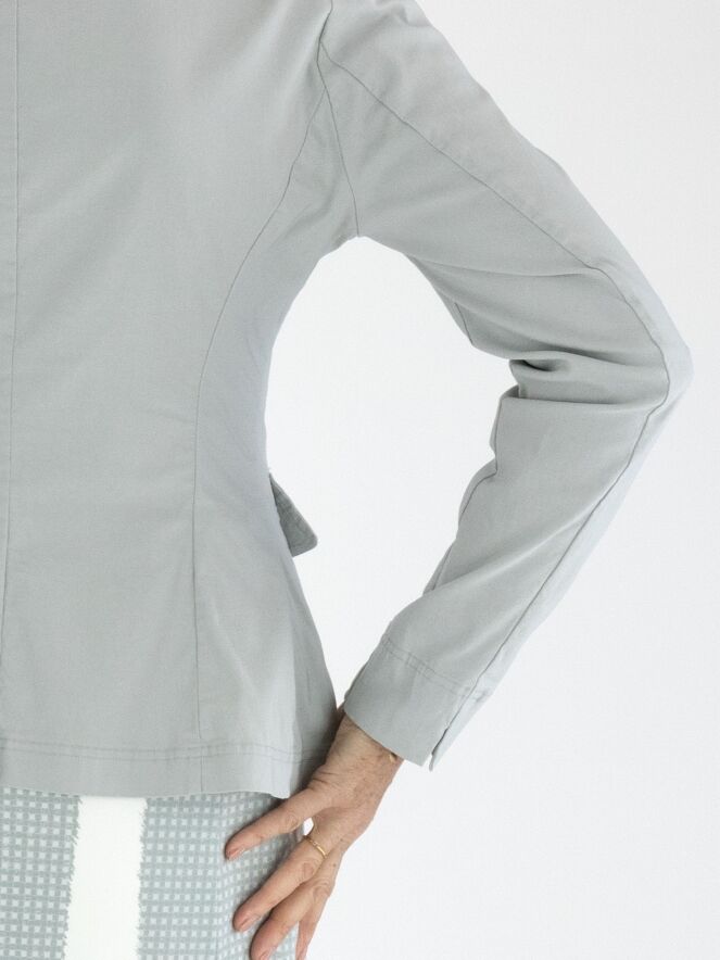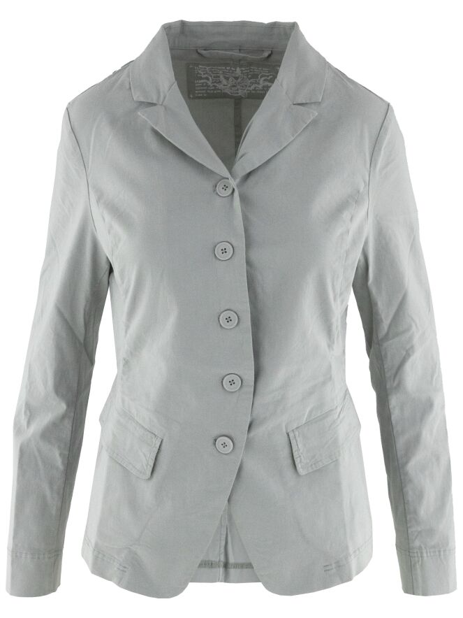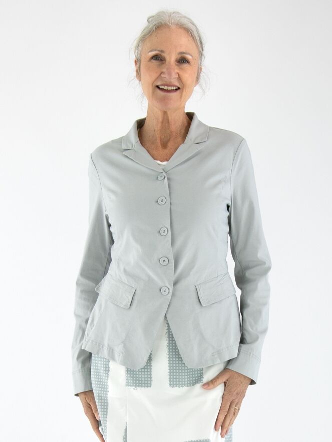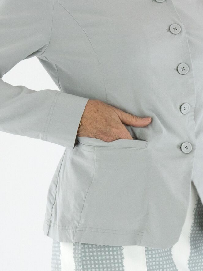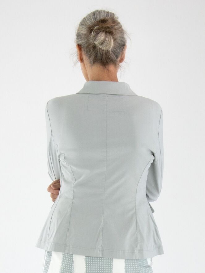 A blazer from Rundholz Black Label in a light grey color. The blazer features a five-button closure and is unlined. The bottom edge is rounded. This blazer can be washed at 30 degrees.