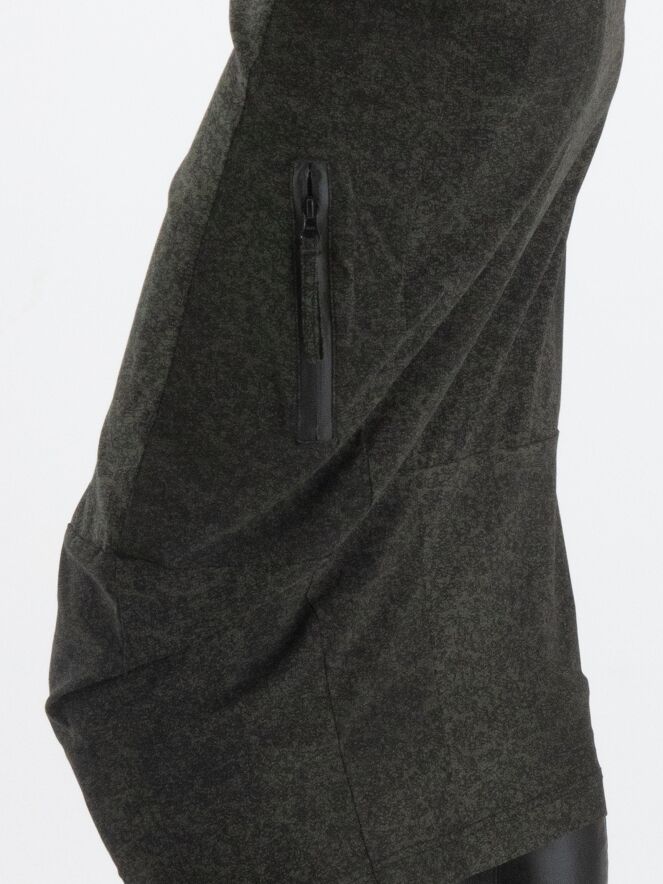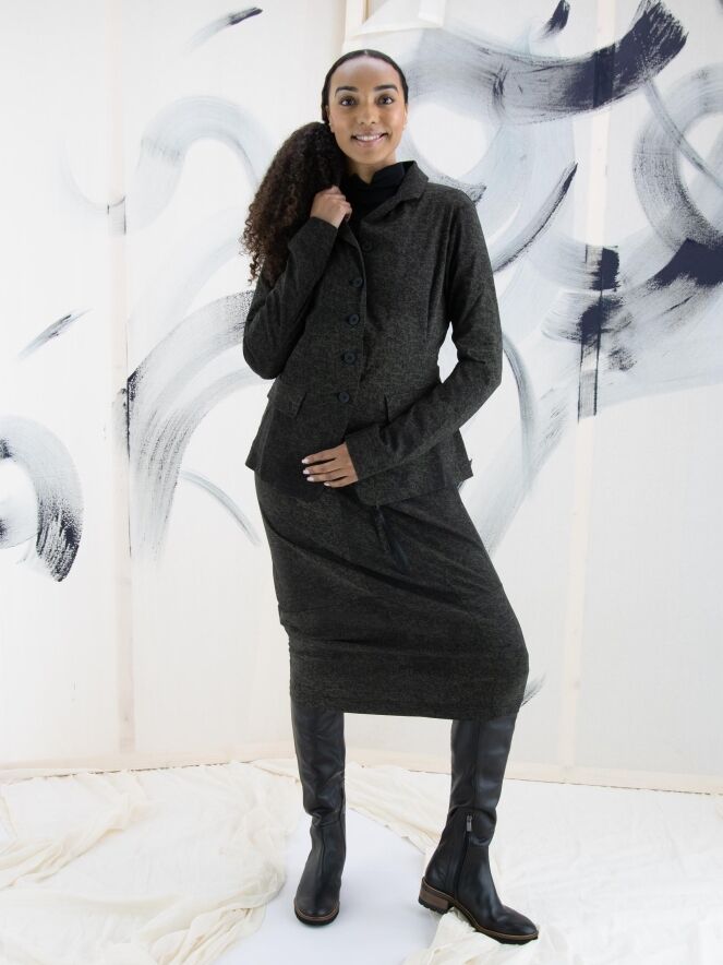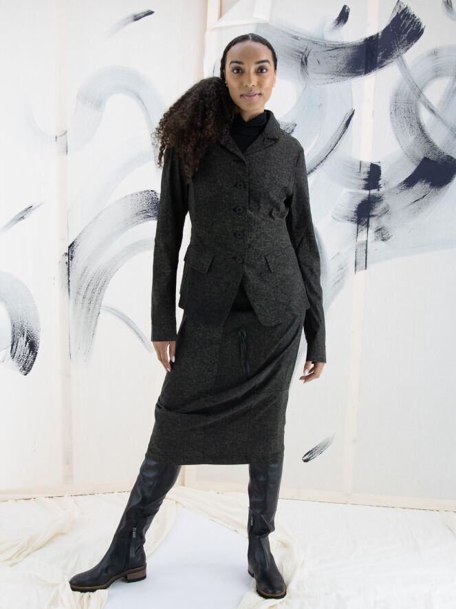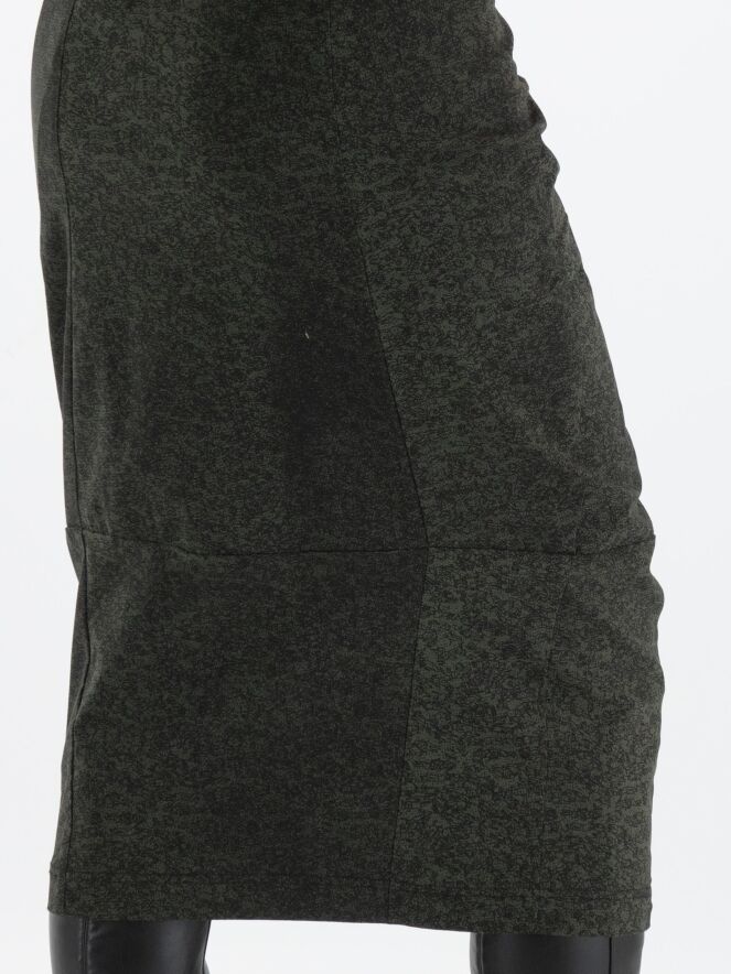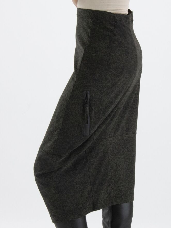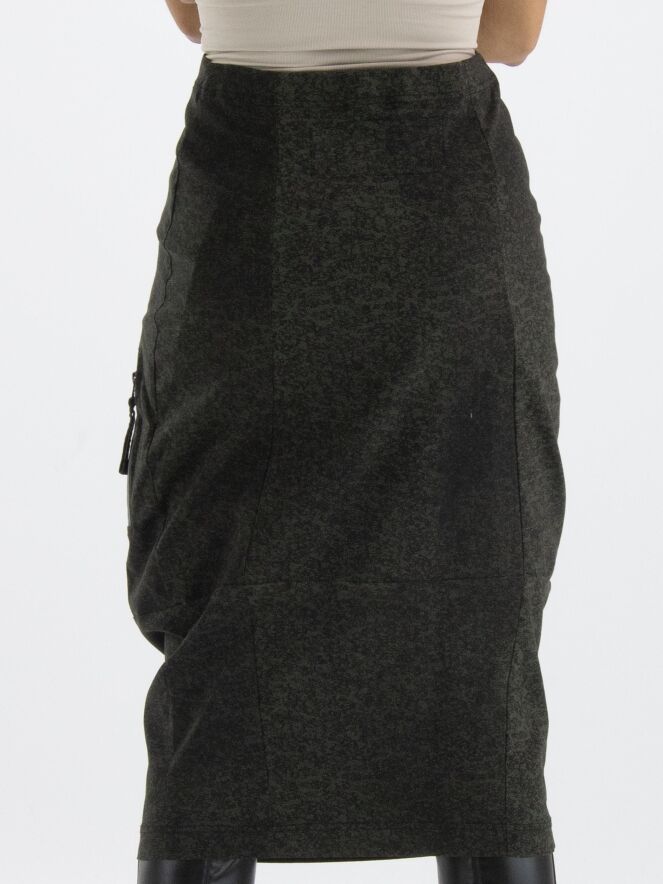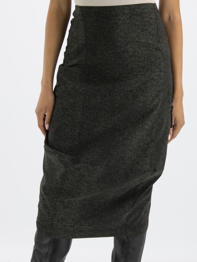 A skirt by Rundholz Black Label in a graphic print with black and khaki colors. The waistband features an elastic band. The skirt tapers slightly from the knee down. This skirt can be washed at 30 degrees.