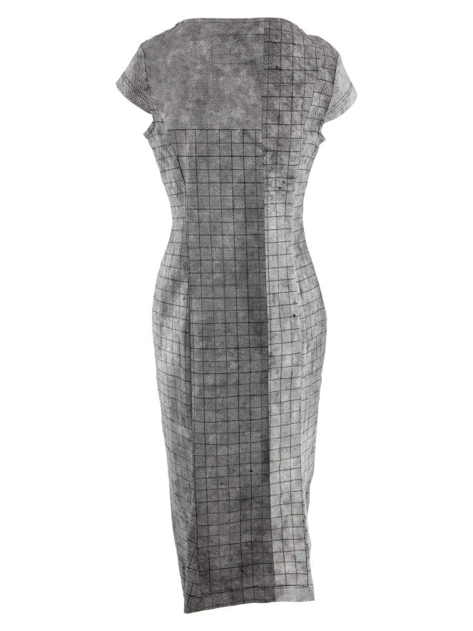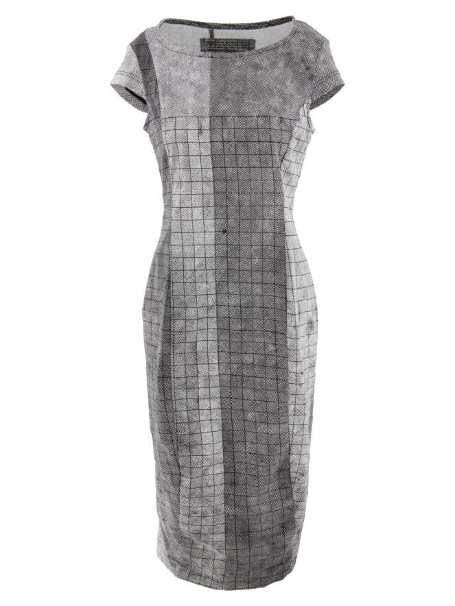 A dress by Rundholz Black Label featuring a varied graphic diamond print in black and white. The dress has a wide neckline and cap sleeves. This dress can be washed at 30 degrees.