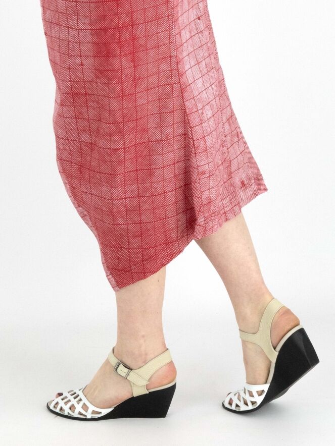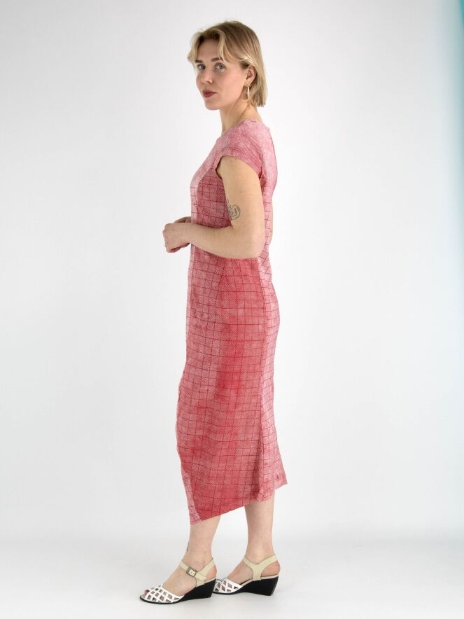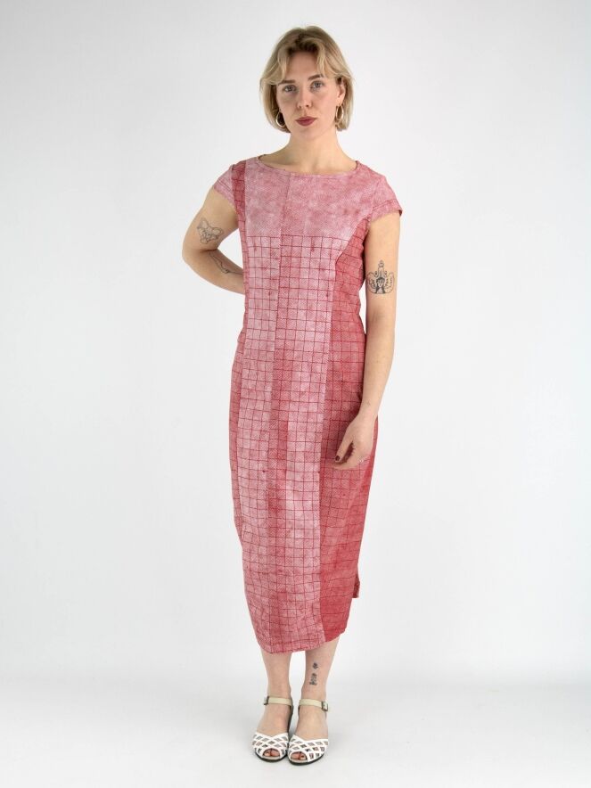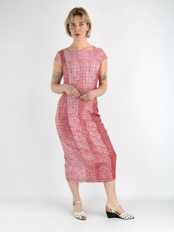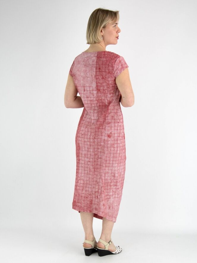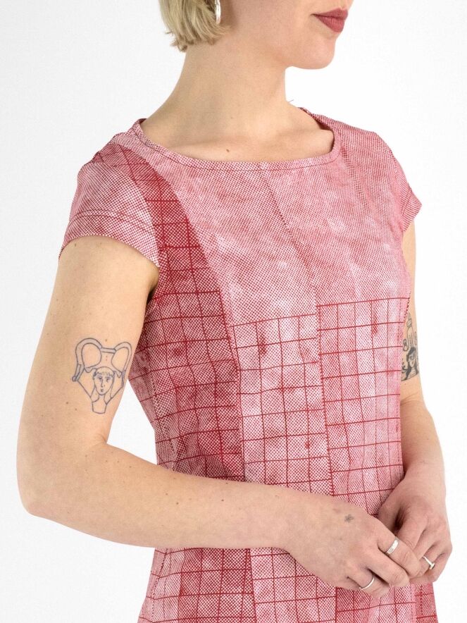 A dress by Rundholz Black Label featuring a varied graphic diamond print in red and white. The dress has a wide neckline and cap sleeves. This dress can be washed at 30 degrees.
