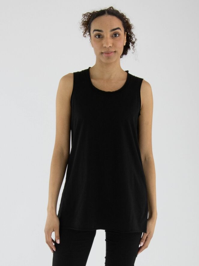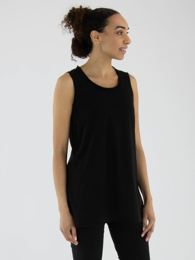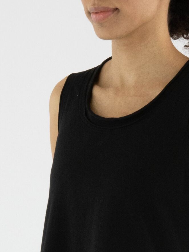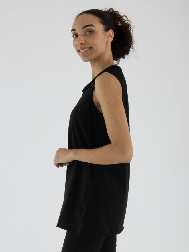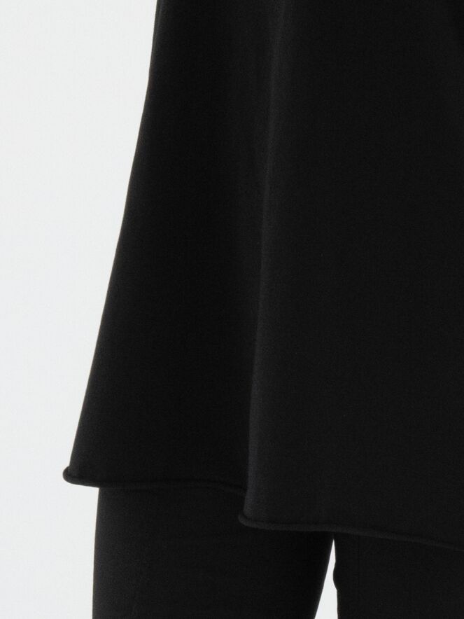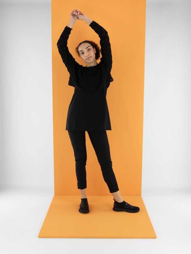 A top by Rundholz Black Label in black. Along the round neckline and armholes, there is a slightly transparent trim with a ruched effect. The fabric is also ruched at the hem. This top can be washed at 30 degrees.
