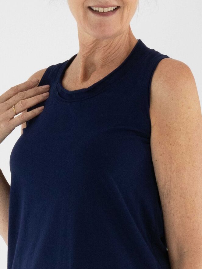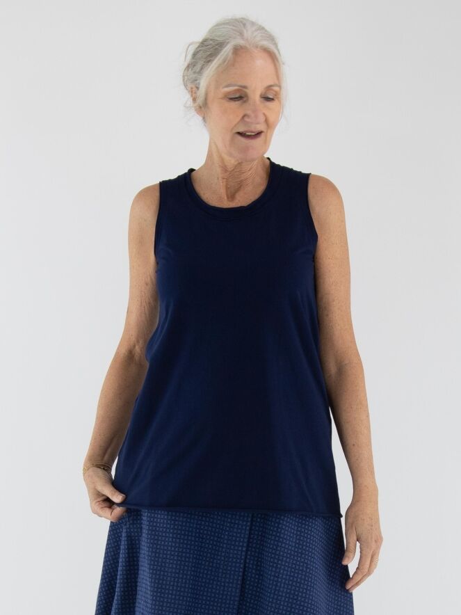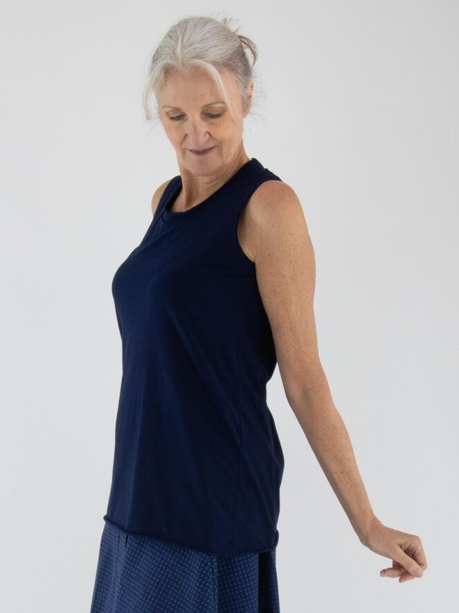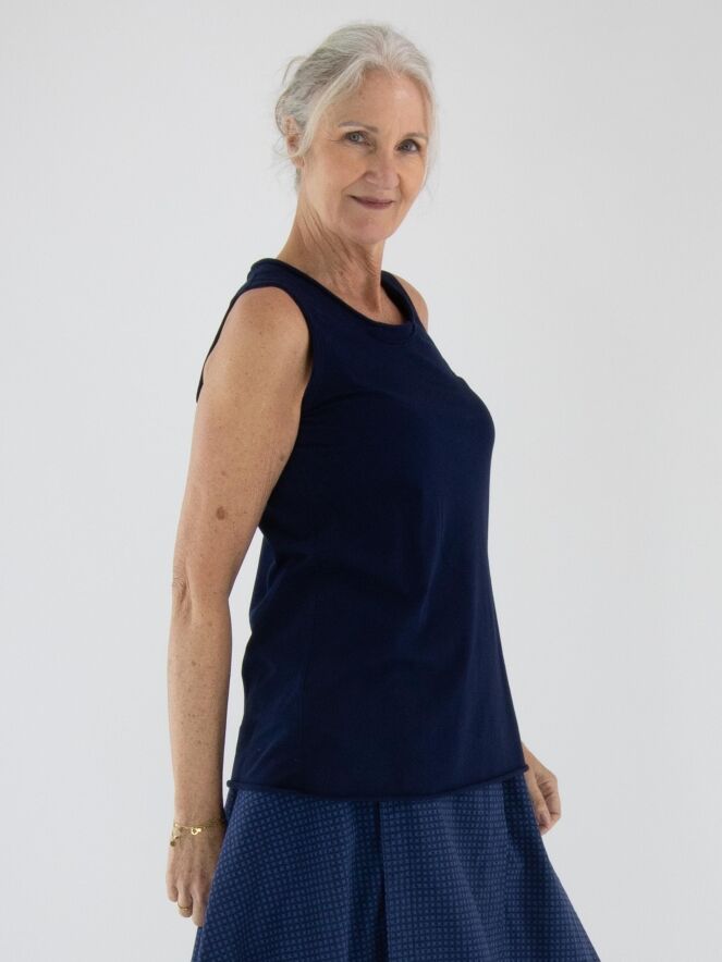 A top by Rundholz Black Label in navy blue. Along the round neckline and armholes, there is a slightly transparent trim with a ruched effect. The hemline is also ruched. This top can be washed at 30 degrees.