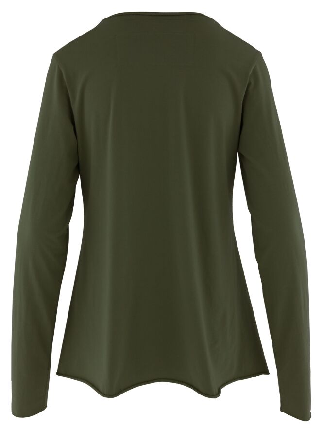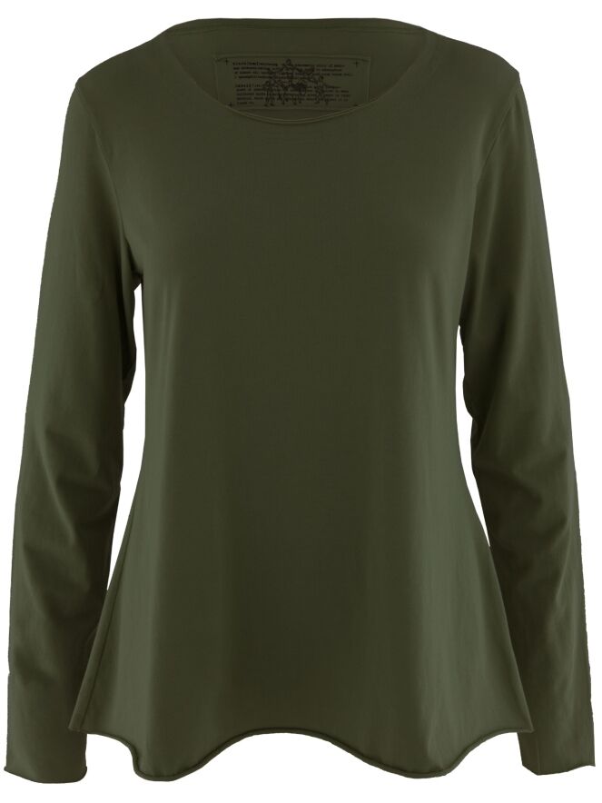 A shirt by Rundholz Black Label in dark olive green color. The shirt has a round neckline and long sleeves. The hem is ruffled, and this shirt can be washed at 30 degrees.