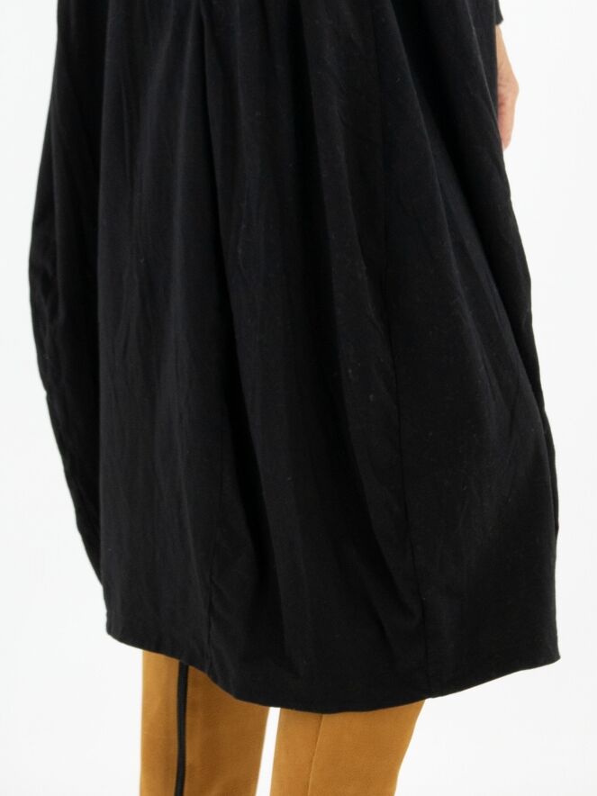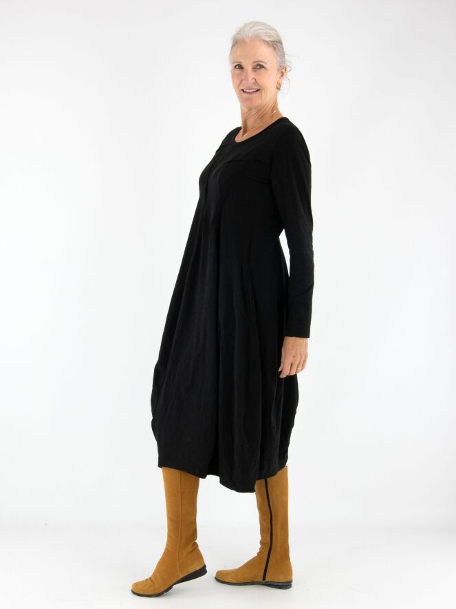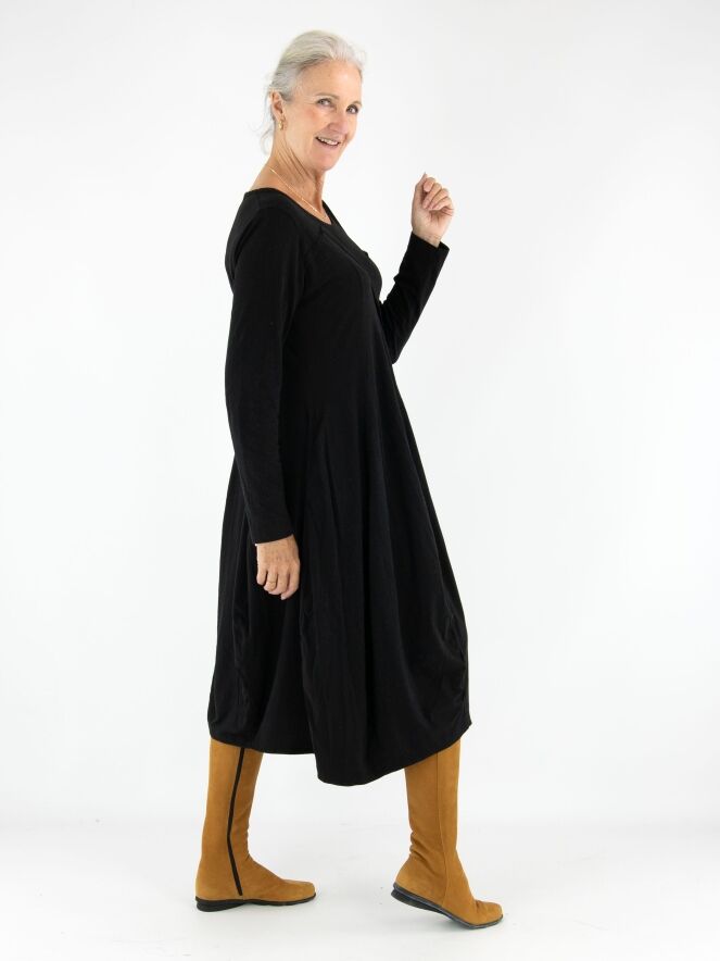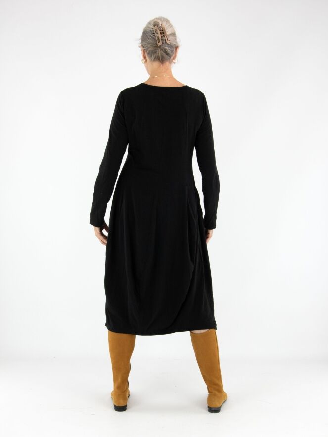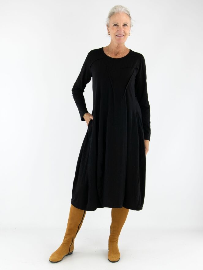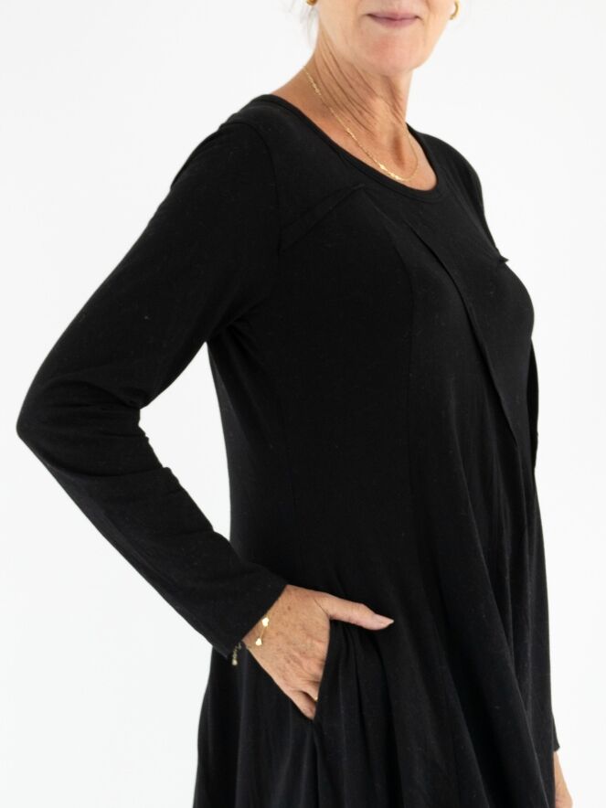A dress from Rundholz Black Label in black. Above the waist, several decorative seams with double-layered fabric create a modern and playful effect. The dress features a round neckline and long sleeves. Practical slit pockets are placed at the waist. This dress can be washed at 30 degrees.