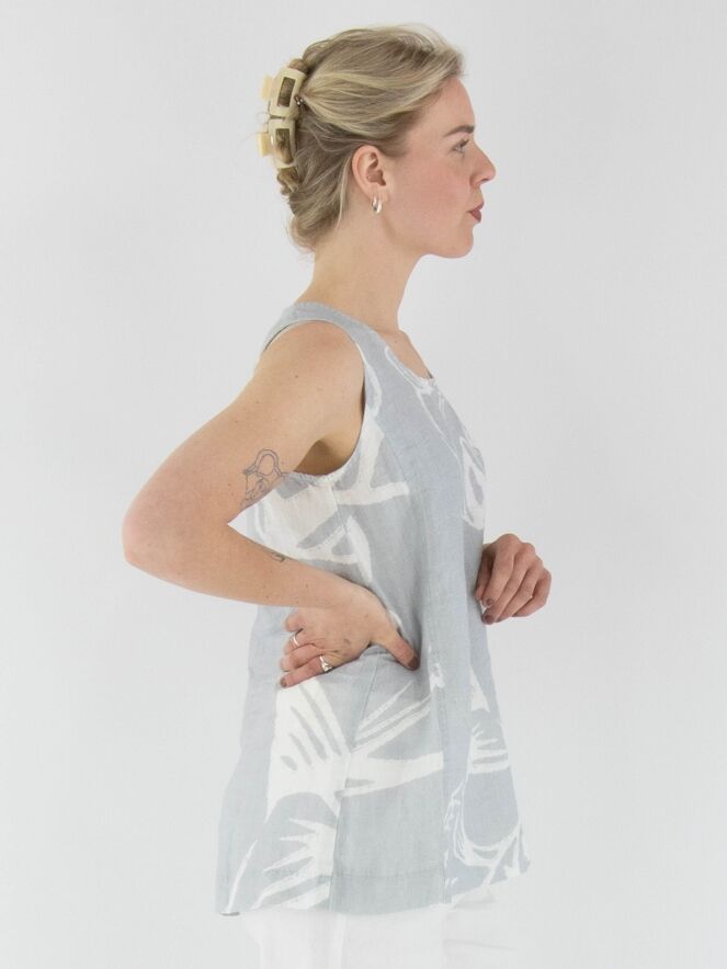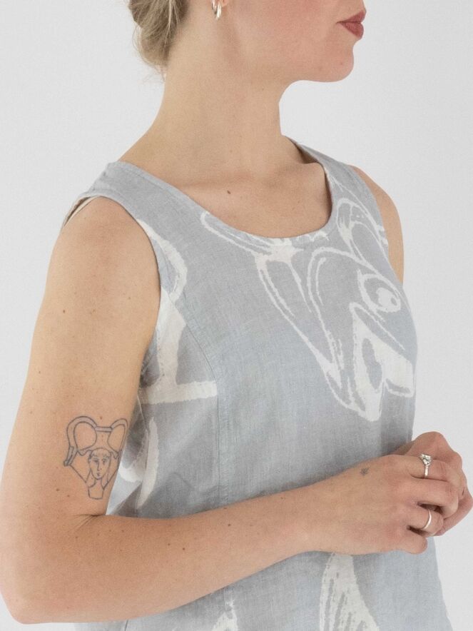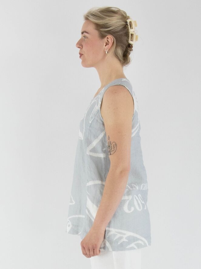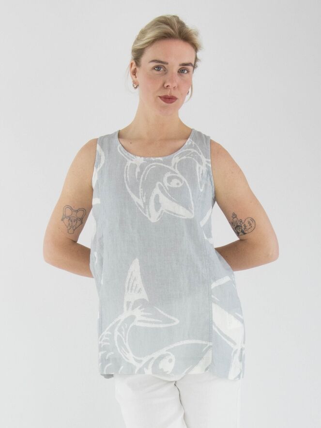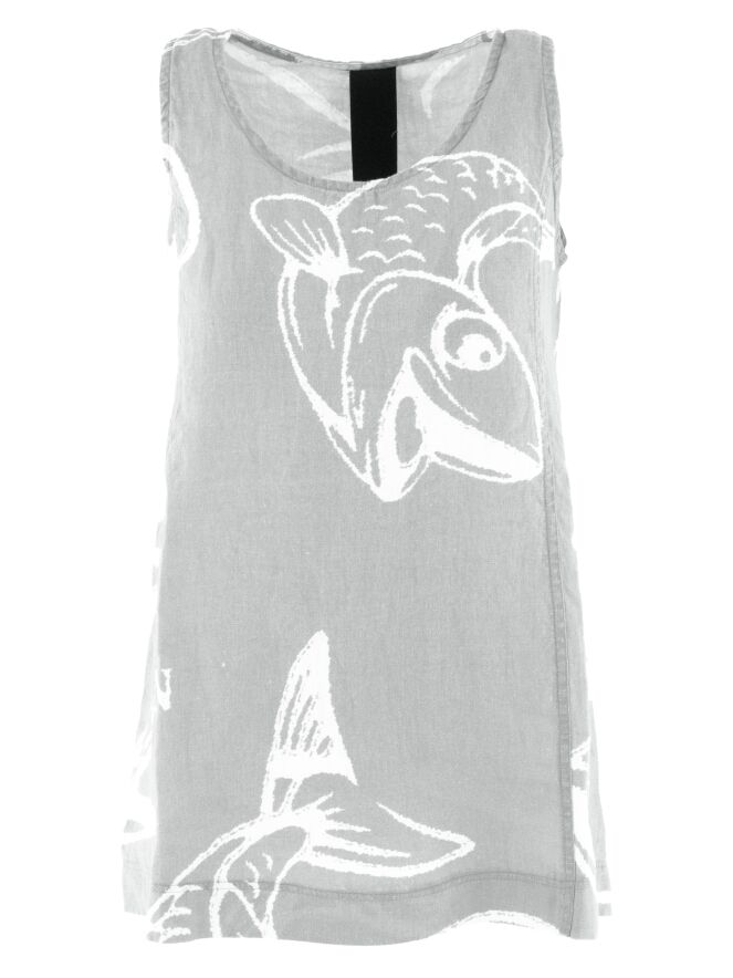 A top from Rundholz Black Label with a print of fish and letters in light grey and white. The top features a round neckline and an A-line silhouette. This top can be washed at 30 degrees.
