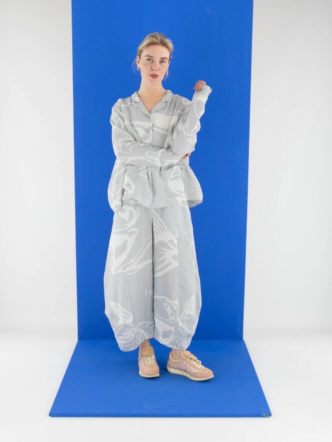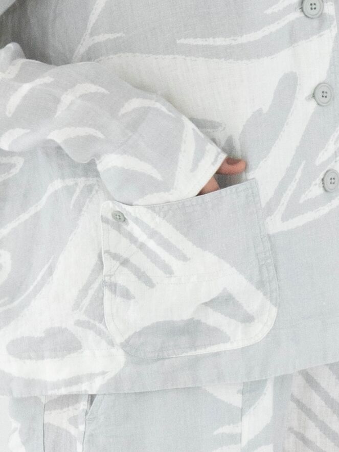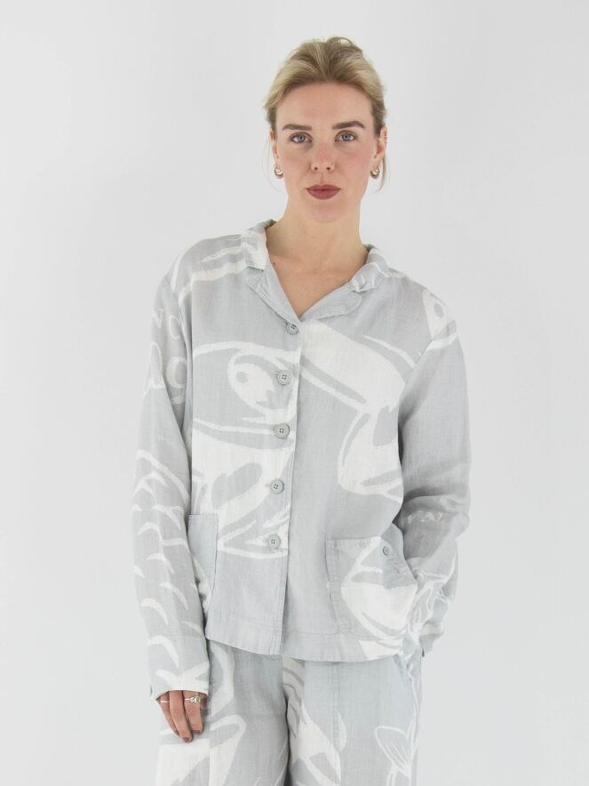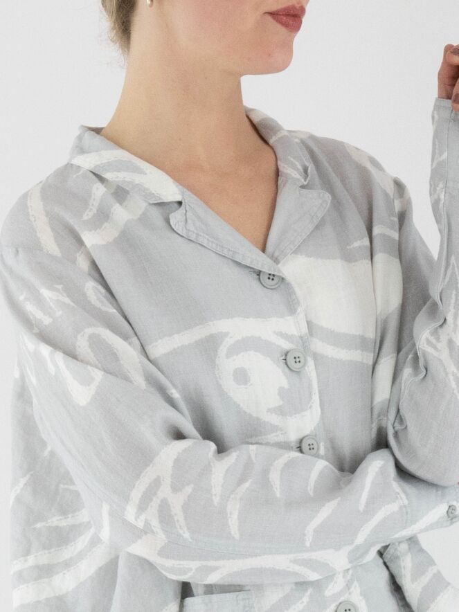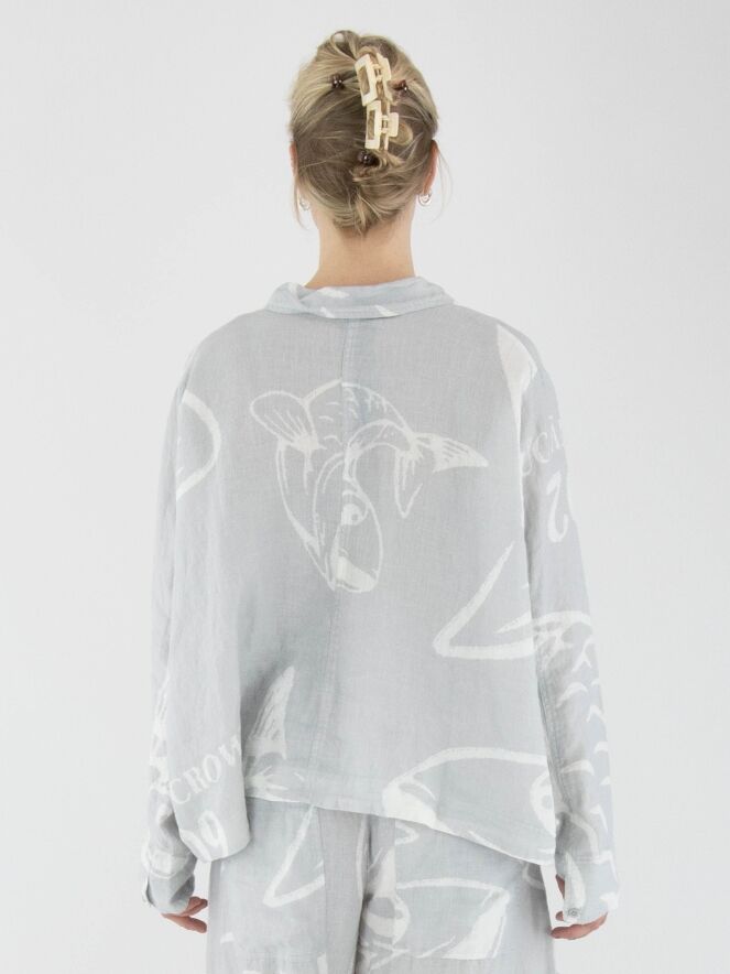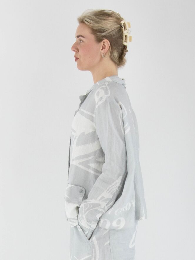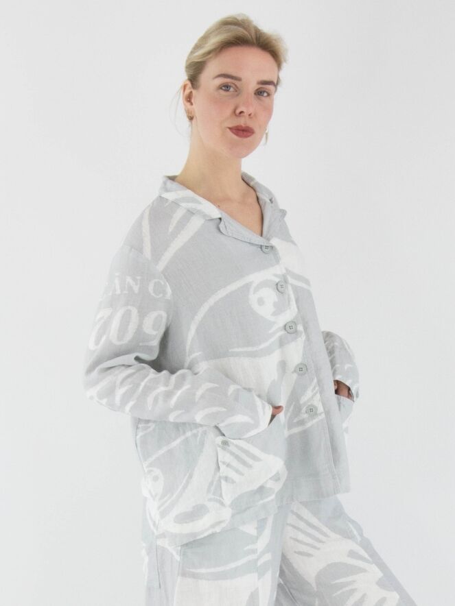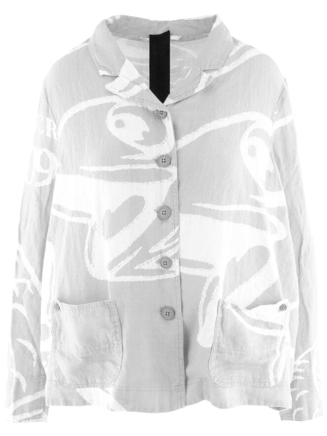 A wide blazer from Rundholz Black Label with a print of fish and letters in light grey and white. The blazer features a five-button closure and is unlined. The front pockets are adorned with a decorative button on the outside. This blazer can be washed at 30 degrees.