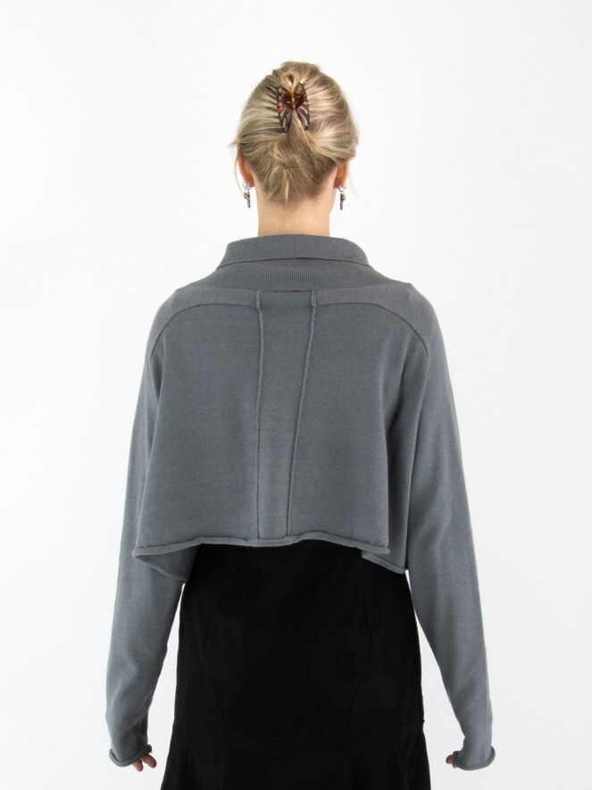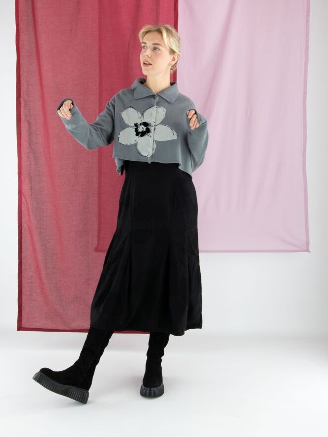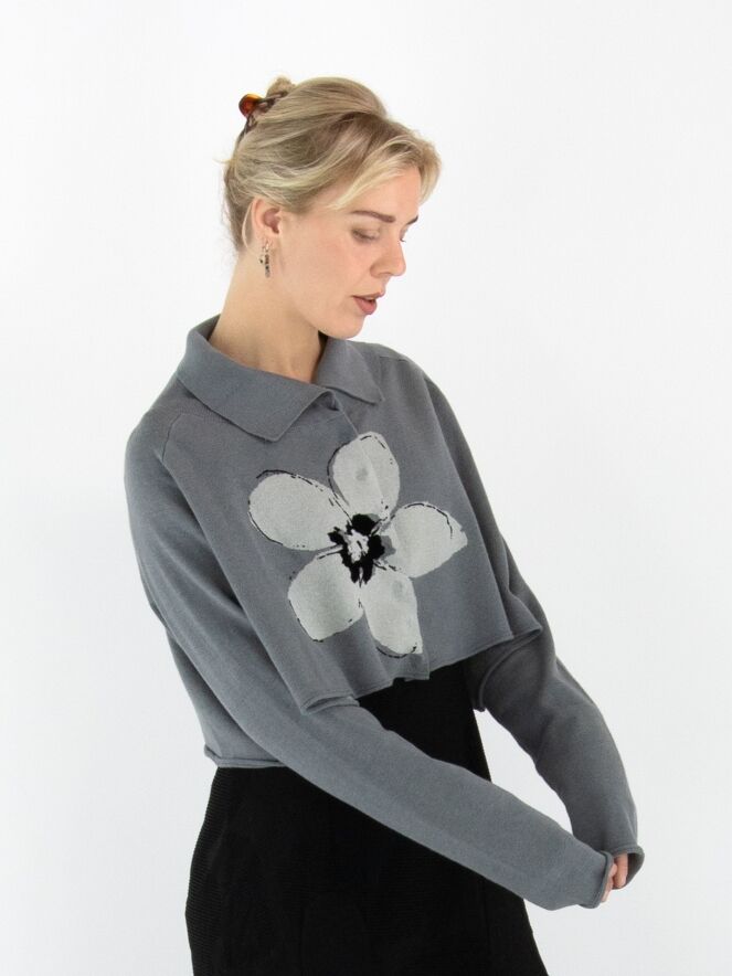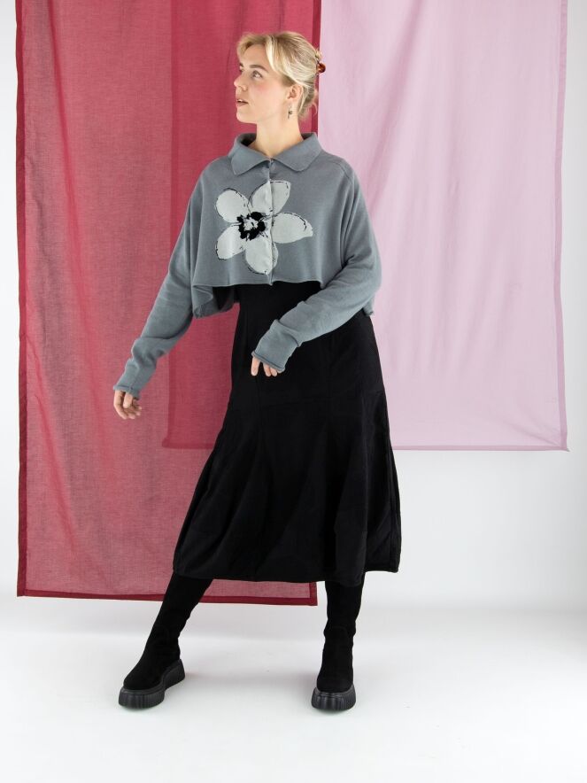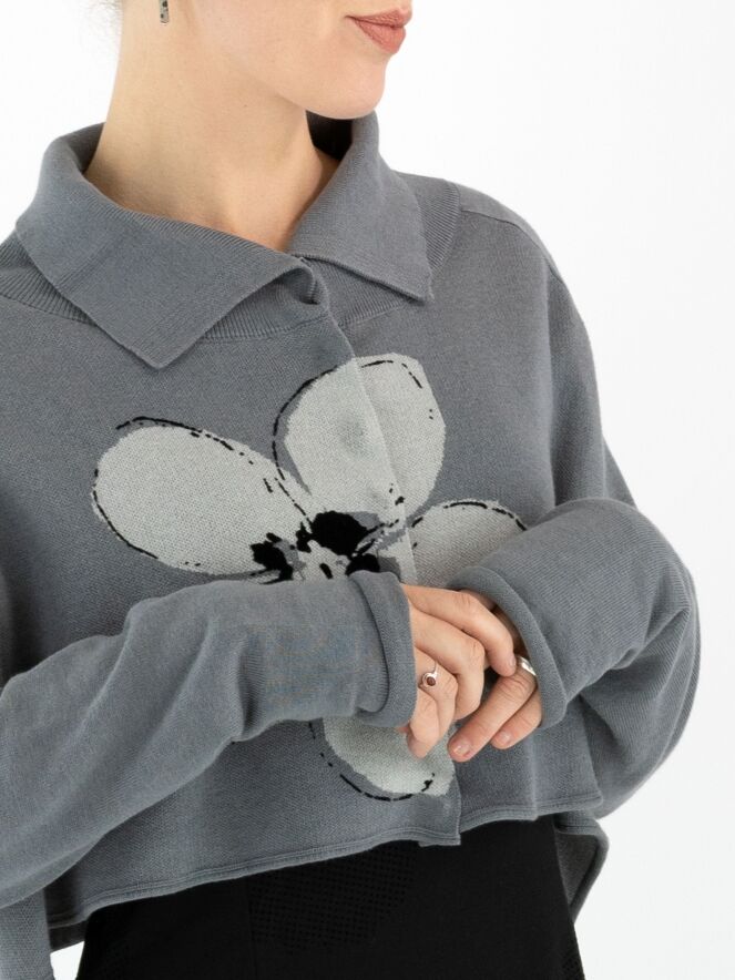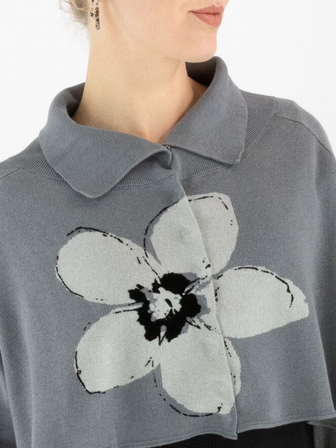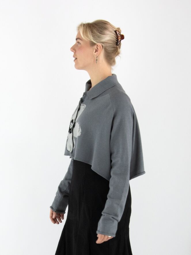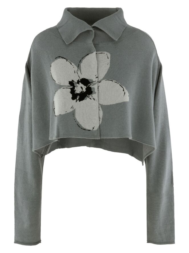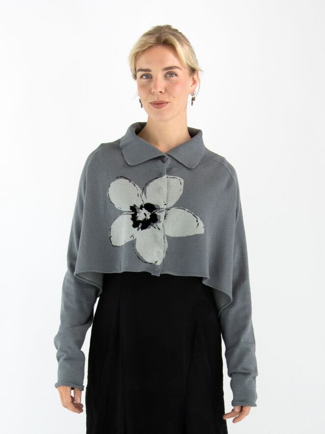 A short, loose-fit cardigan by Rundholz Black Label in grey, featuring a large floral print in light grey and black on the front. The cardigan fastens with press studs and has a collar in fine ribbed knit. This cardigan is hand wash only.