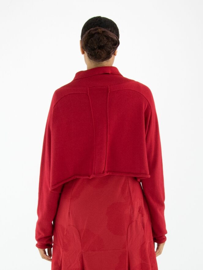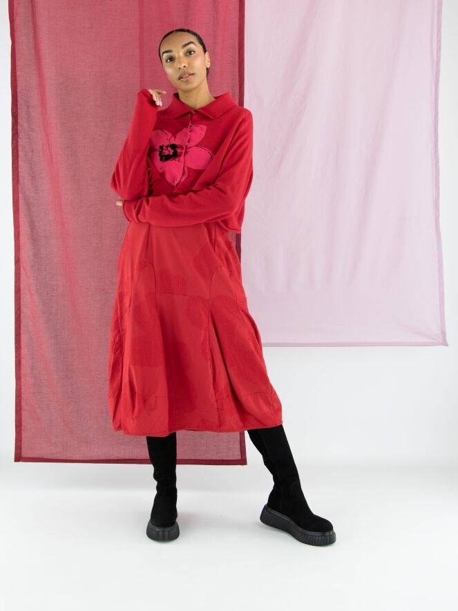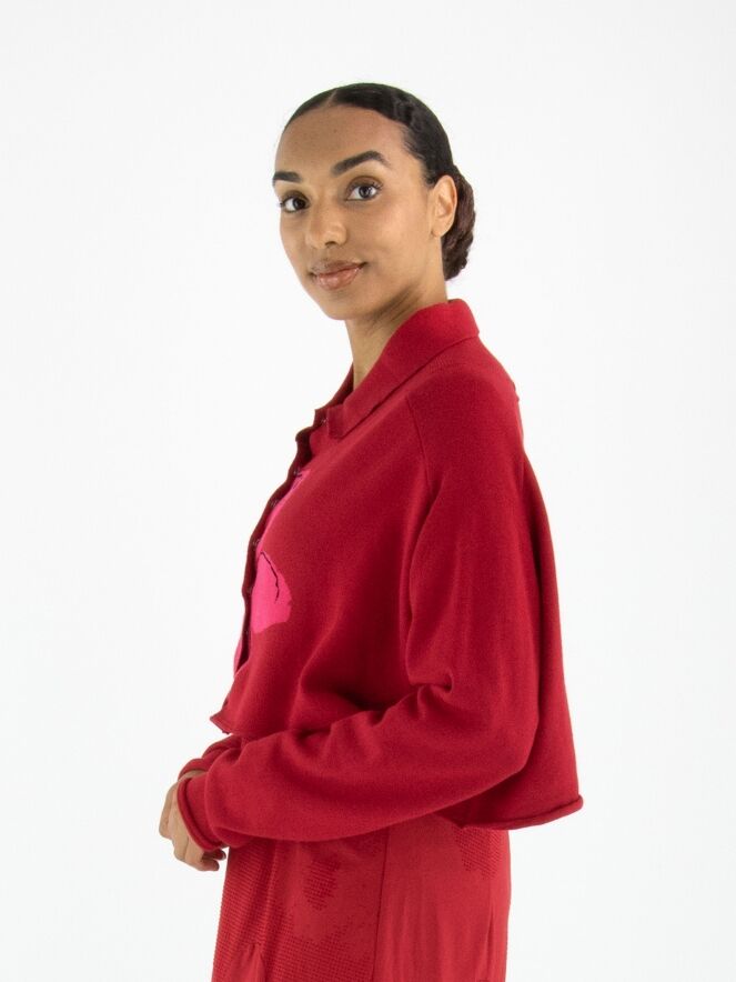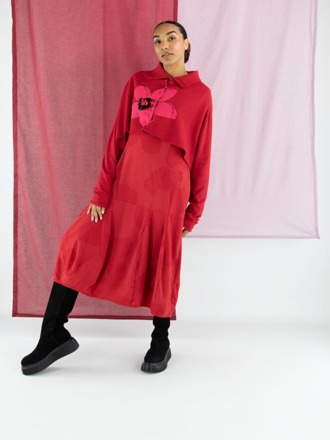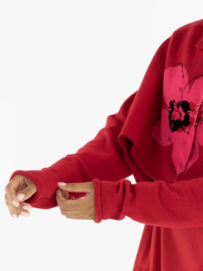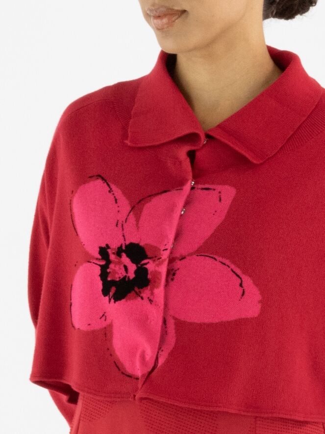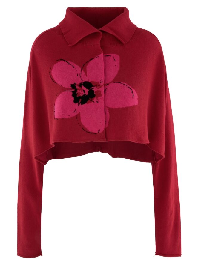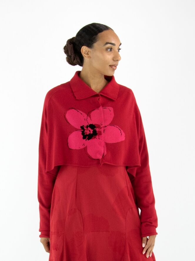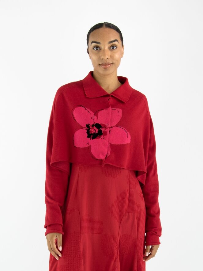 A loose, short jacket by Rundholz Black Label in red, featuring a large floral print in pink and black on the front. The jacket fastens with press studs and has a finely ribbed knitted collar. This jacket is hand wash only.