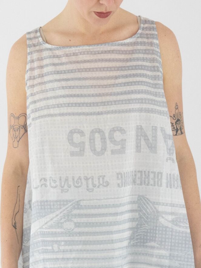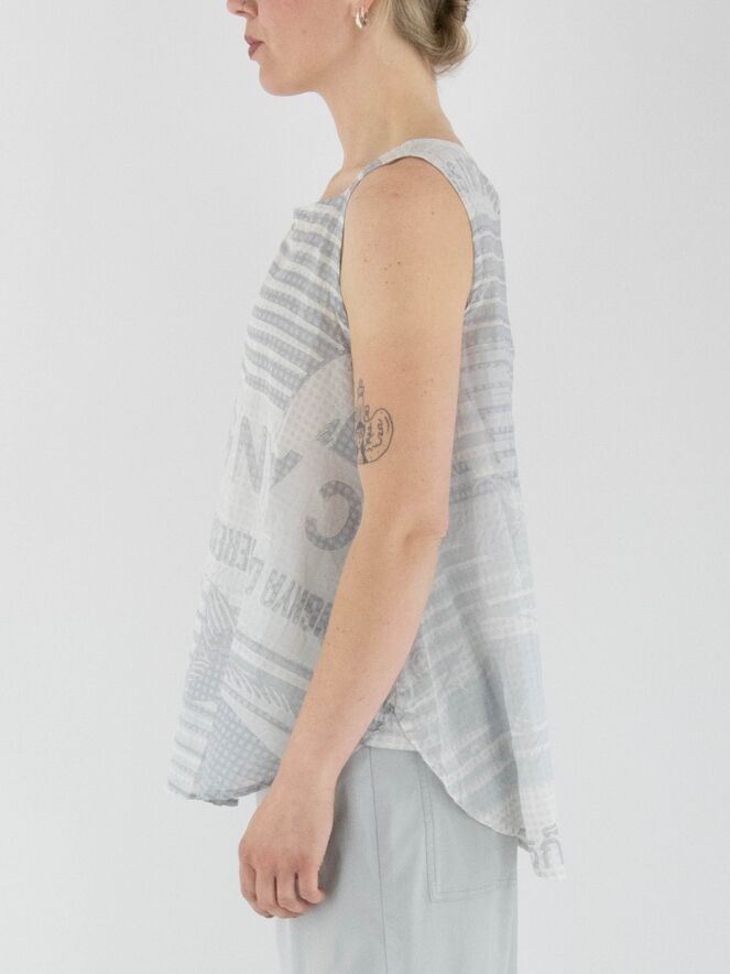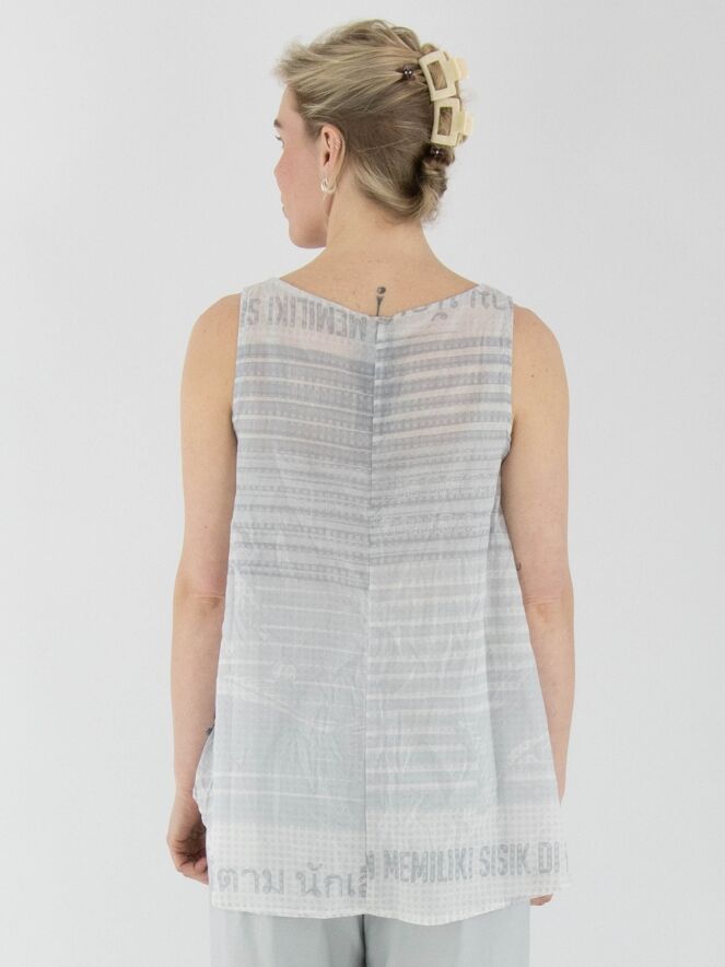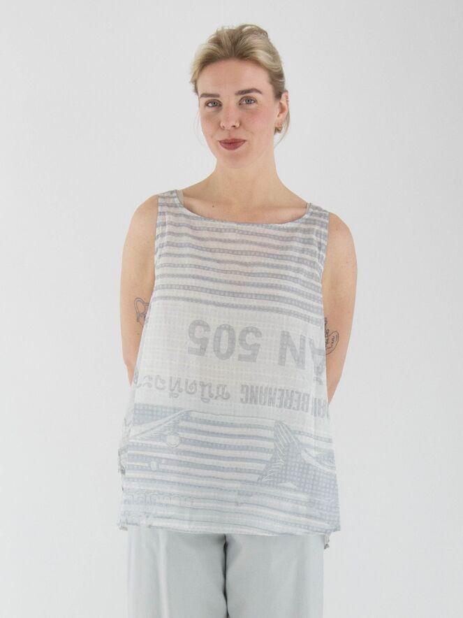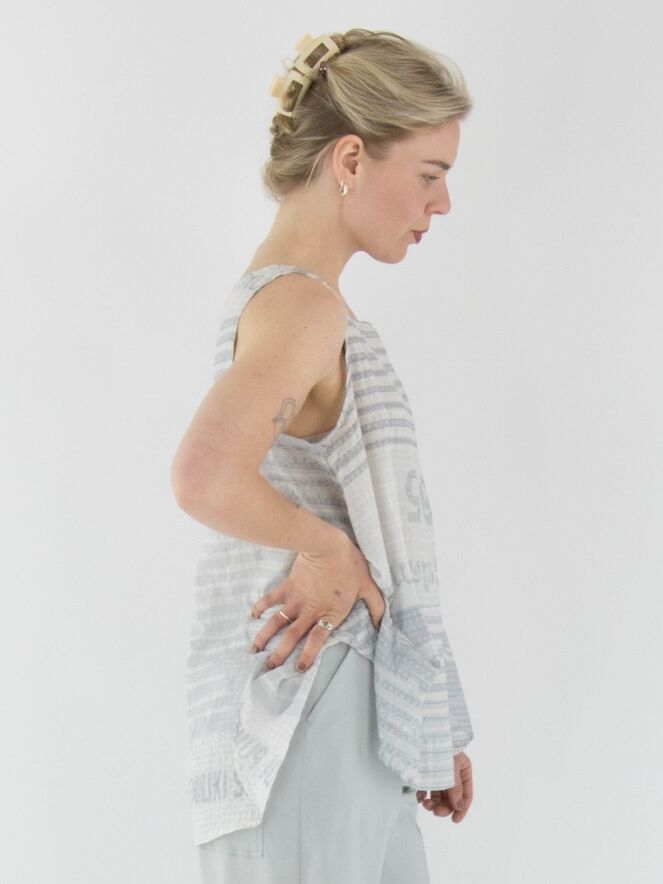 A lightly transparent top from Rundholz Black Label with a print featuring text and a block pattern. The print combines various shades of grey with white. The top has an A-line shape and can be washed at 30 degrees.